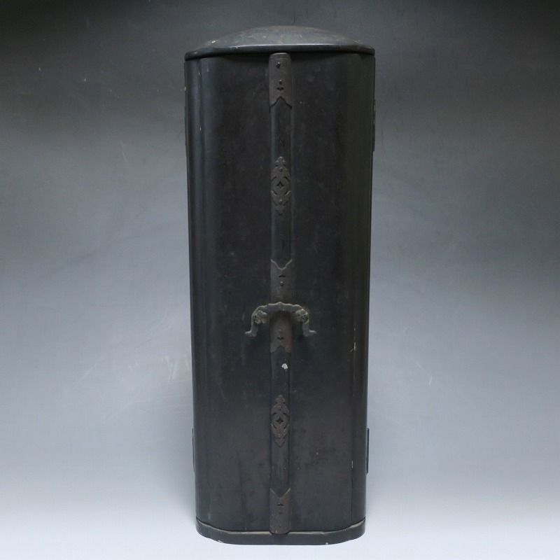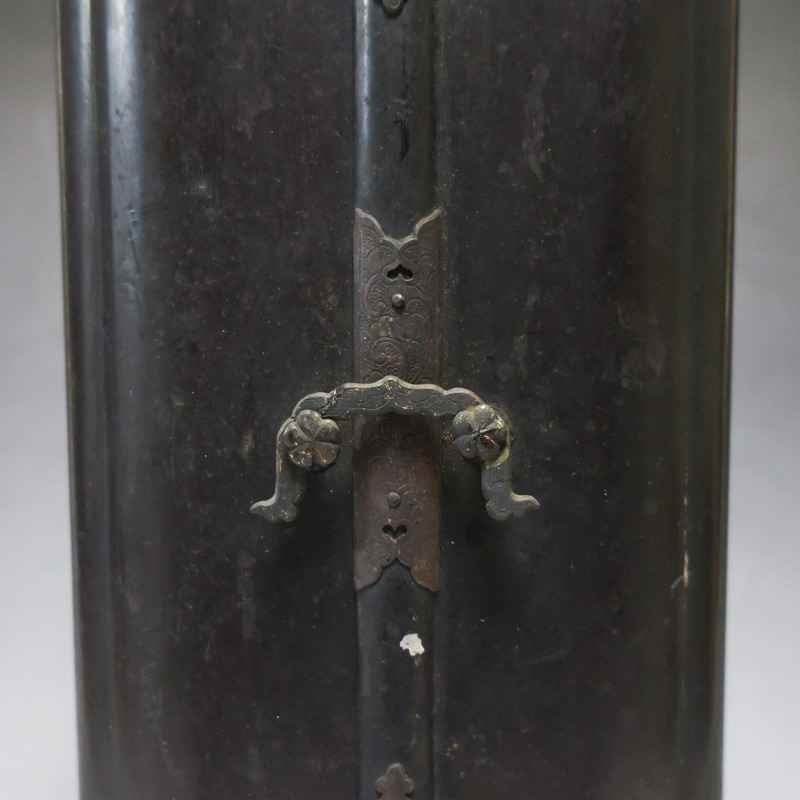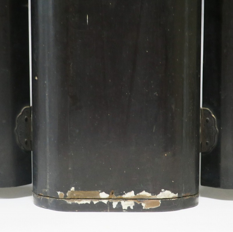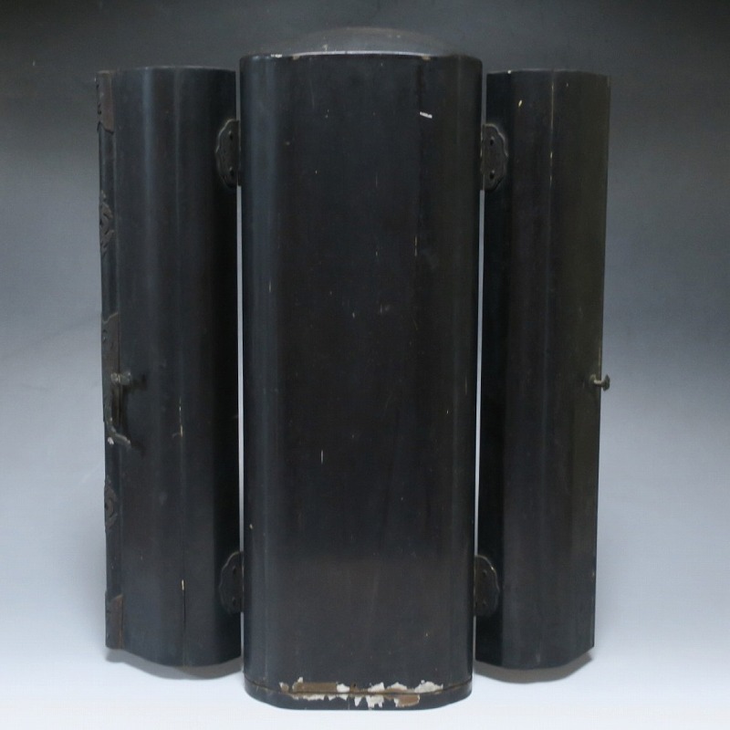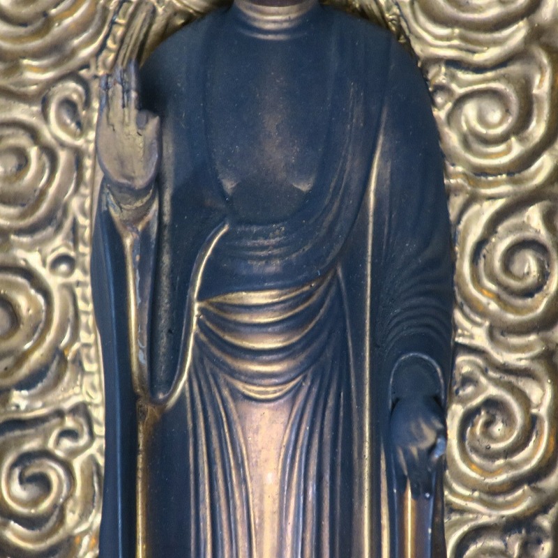 厨子 高さ 約41.5cm/横幅 約14cm/奥行 約11cm 経年の汚れが付き、右手と左足に補修、厨子に傷みがあります。状態は写真でご確認ください。 阿弥陀如来は大乗仏教の如来の一つで、西方にある極楽浄土の教主とされる仏です。浄土教系の仏教では「南無阿弥陀仏」という念仏を唱えると極楽浄土に往生できるという阿弥陀信仰があります。本品は江戸時代後期に作られた穏やかな表情の阿弥陀如来立像。明治時代初期の廃仏毀釈の影響を受けて両手、足の一部に欠損がありますが鑑賞には問題はないと思います。優しい表情をした仏様なので疲れた時などに見ると癒されるでしょう。 | ||