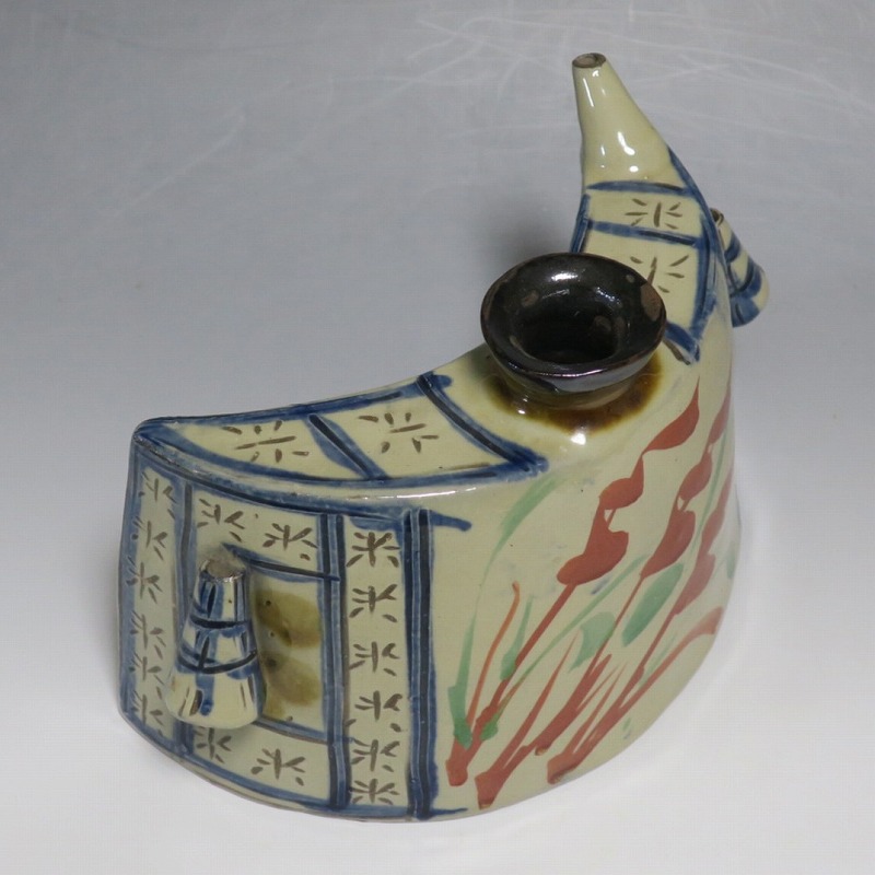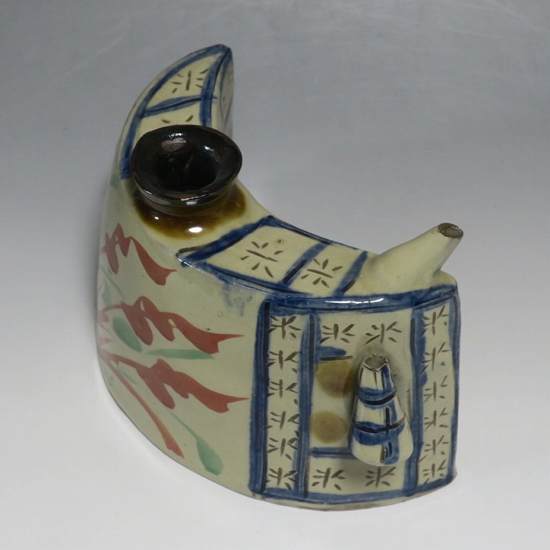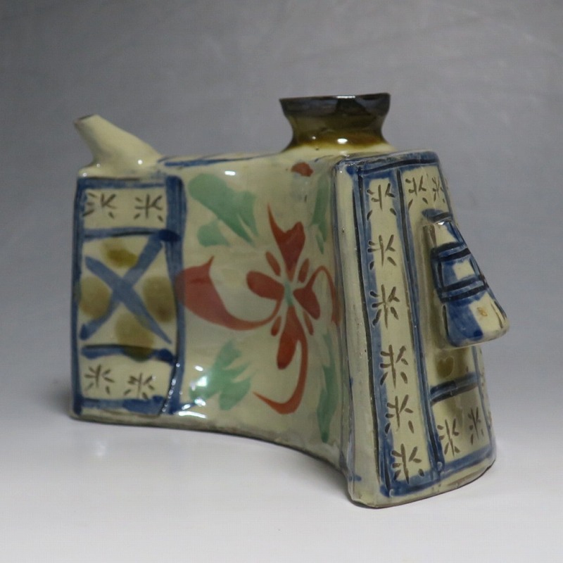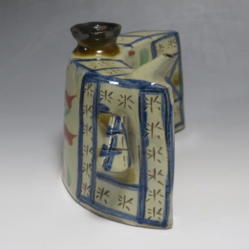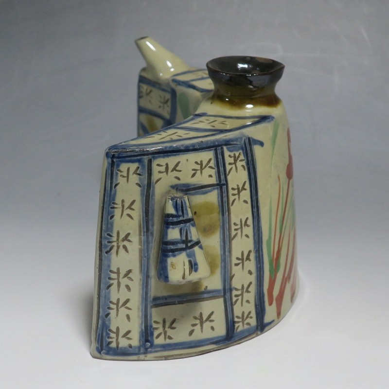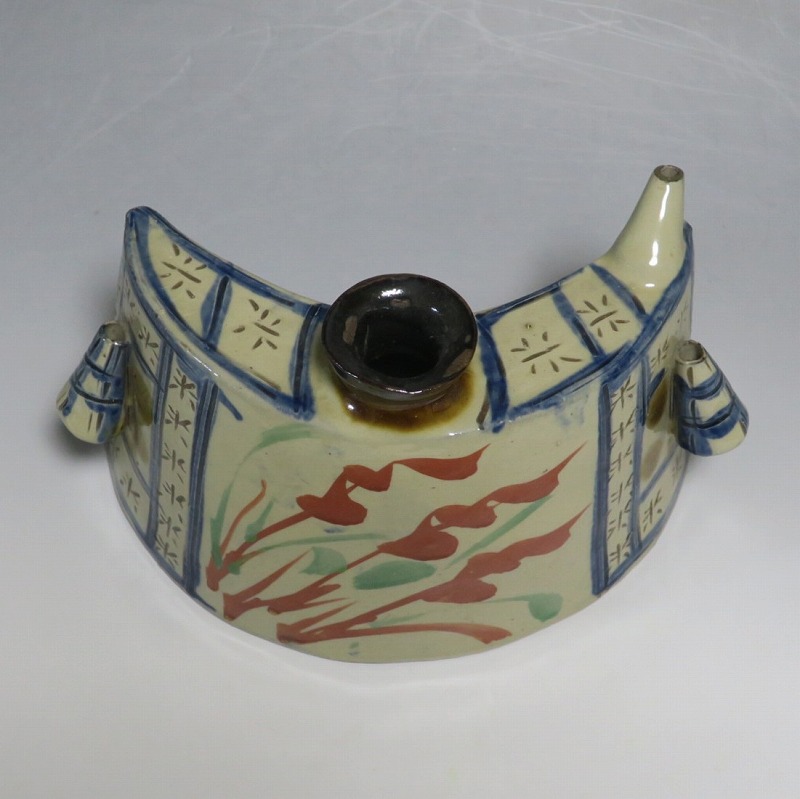 (昭和時代 20世紀後半) 商品番号 4193 高さ 約12cm/横幅 約18.7cm/奥行 約7cm 完品です。状態は写真でご確認ください。 新垣栄三郎(1921年〜84年)は沖縄県那覇市にある壺屋焼の陶工です。浜田庄司、河井寛次郎に学び、初等学校勤務のあと作陶に専念、金城次郎、小橋川永昌と共に「壺屋三人男」として名声を博しました。国画会会員。琉球大学の助教授。本品は胴部に伸びやかなタッチできび文を描いた抱瓶。きびと幾何学模様がマッチしている作品です。泡盛を飲む時、使用すると楽しいでしょう。 | ||