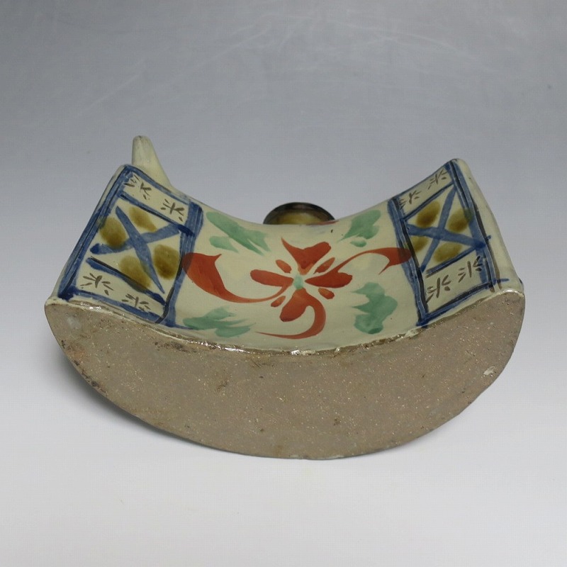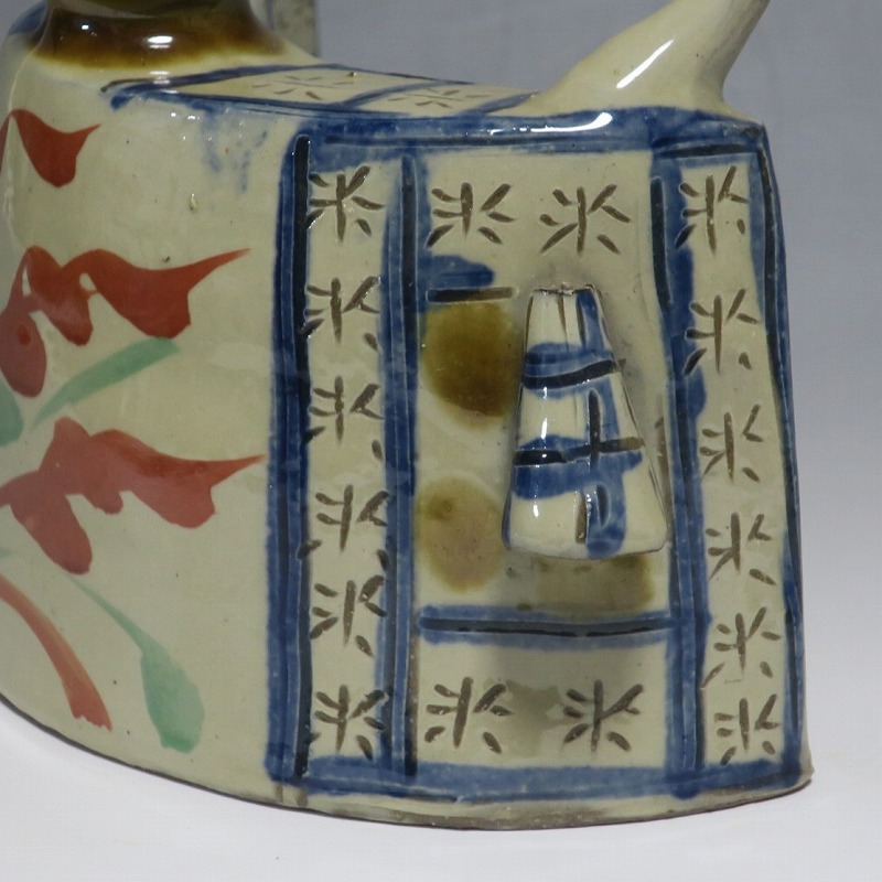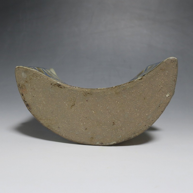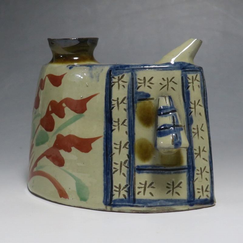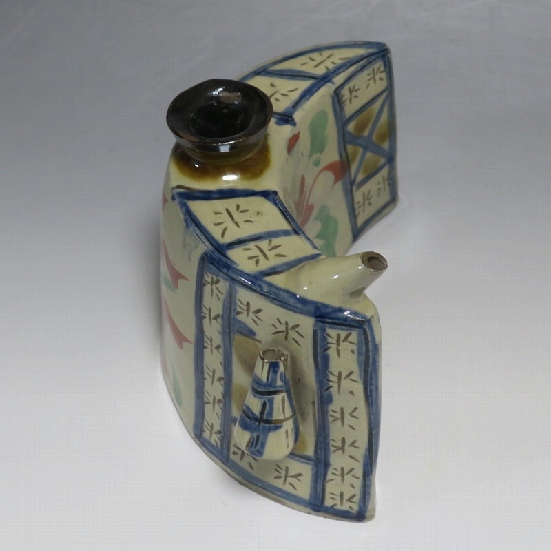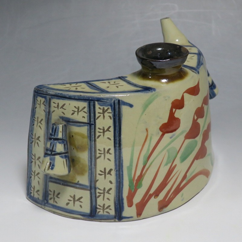 (昭和時代 20世紀後半) 商品番号 4193 高さ 約12cm/横幅 約18.7cm/奥行 約7cm 完品です。状態は写真でご確認ください。 新垣栄三郎(1921年〜84年)は沖縄県那覇市にある壺屋焼の陶工です。浜田庄司、河井寛次郎に学び、初等学校勤務のあと作陶に専念、金城次郎、小橋川永昌と共に「壺屋三人男」として名声を博しました。国画会会員。琉球大学の助教授。本品は胴部に伸びやかなタッチできび文を描いた抱瓶。きびと幾何学模様がマッチしている作品です。泡盛を飲む時、使用すると楽しいでしょう。 | ||