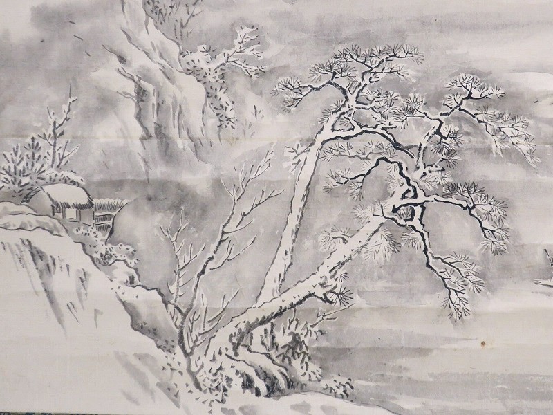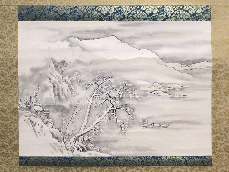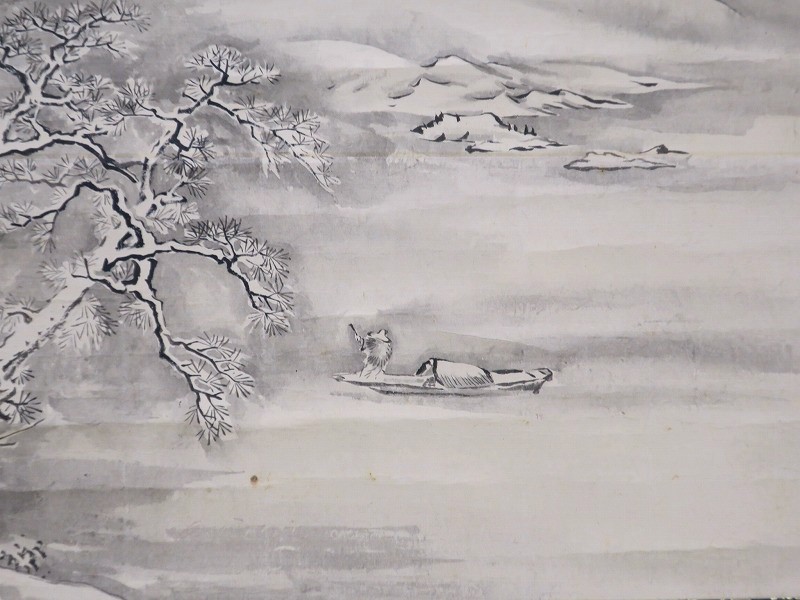 雪の降る湖を船が渡っていく景色を描いた水墨画です。円山派と狩野派の画風を合わせて2で割ったような感じがあります。見ていると寒い冬の感じが伝わってきます。銘はないのですが技術力のある日本画家が描いた水墨画でしょう。床の間に飾って冬景色をお楽しみください。