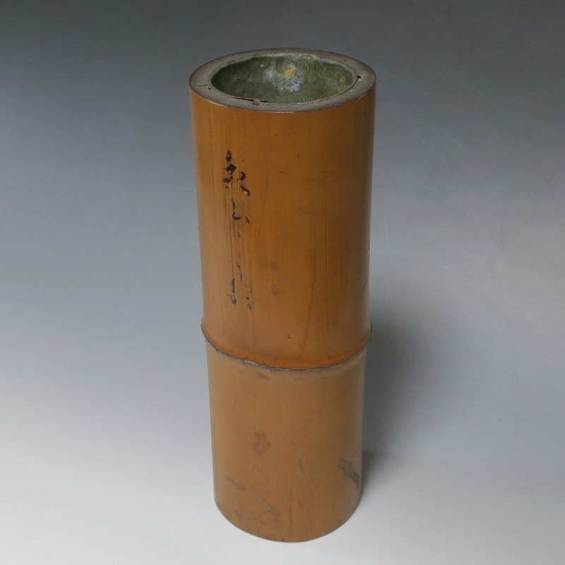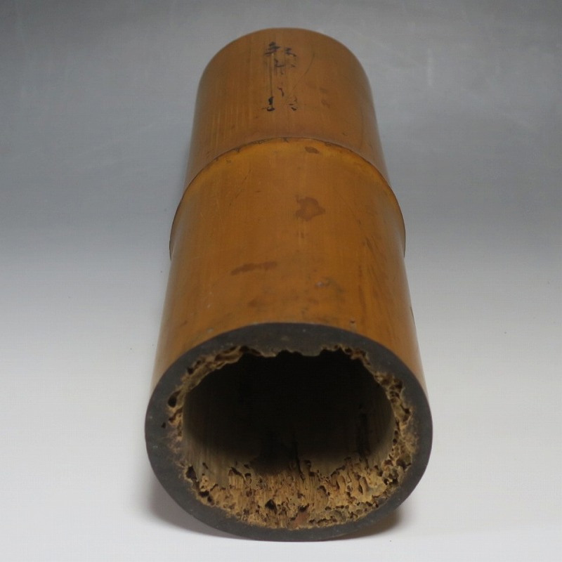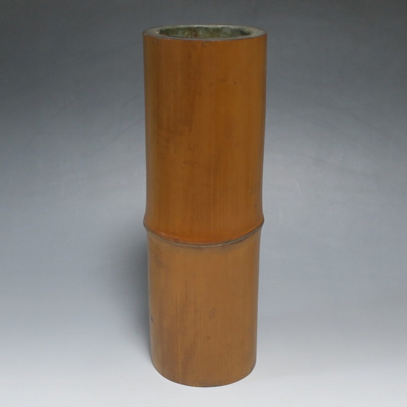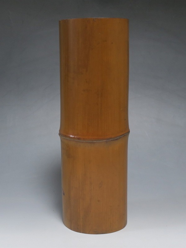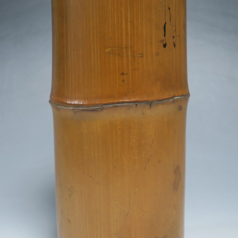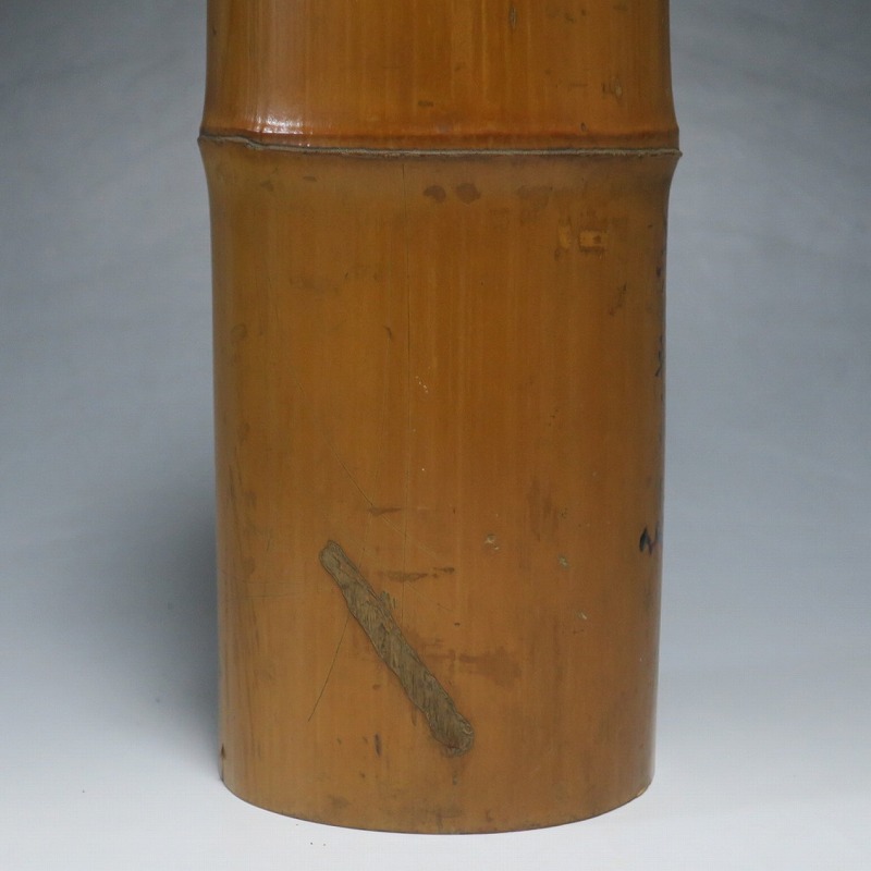 高さ 約29.3cm/口径 約10cm/高台 約9.9cm 経年の傷みや内側の金属部に錆、主に底部の内側に虫食いがあります。水漏れしますので、花を生ける際はオトシをご利用ください。状態は写真でご確認ください。 竹の花入れは、茶道の家元・千利休(1522年〜1591年)が発案した花入れです。元々、野仏用の花器でしたが、それを利休が芸術に高めました。本品は是心軒法眼(1734年〜1780年)の在判のある一重竹花入れ。是心軒法眼は京都で中流軒宣柳に学んだ後、江戸に帰り松月堂古流を創始した華道家です。淡海汐と名が付いています。竹の経年変化が美しい花器。花を活けてお楽しみください。 | ||
