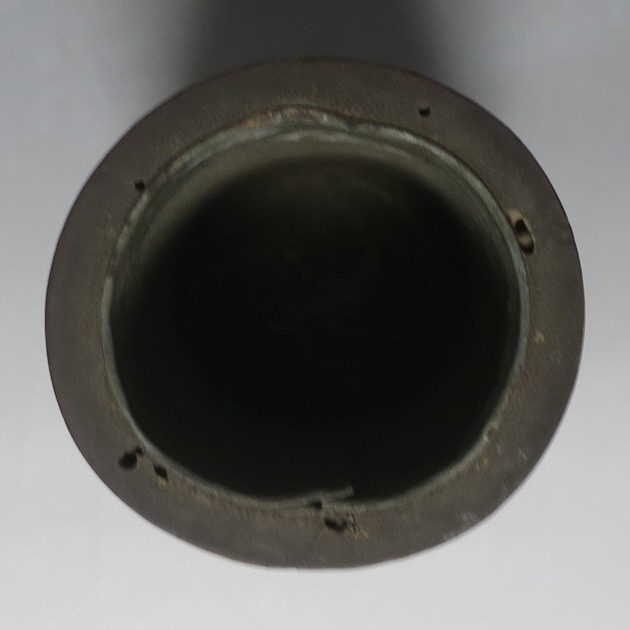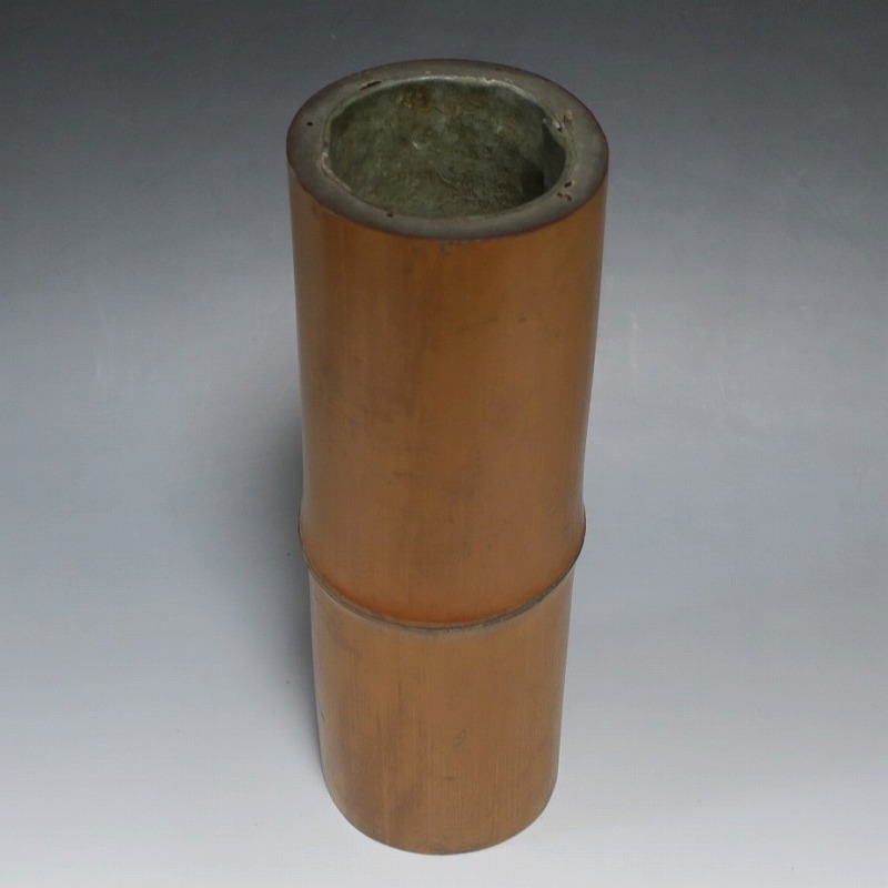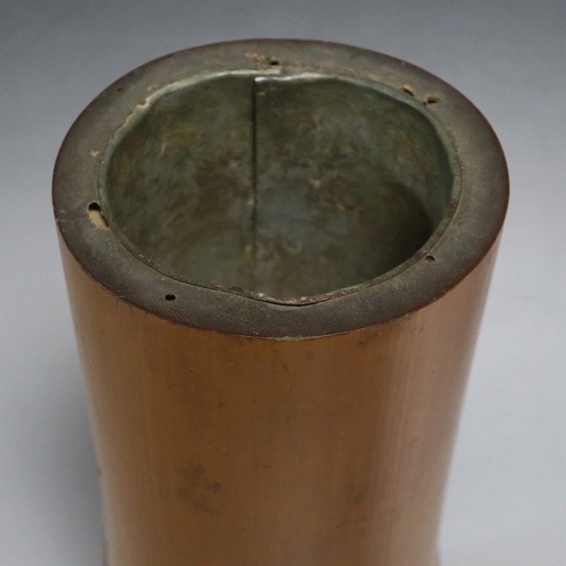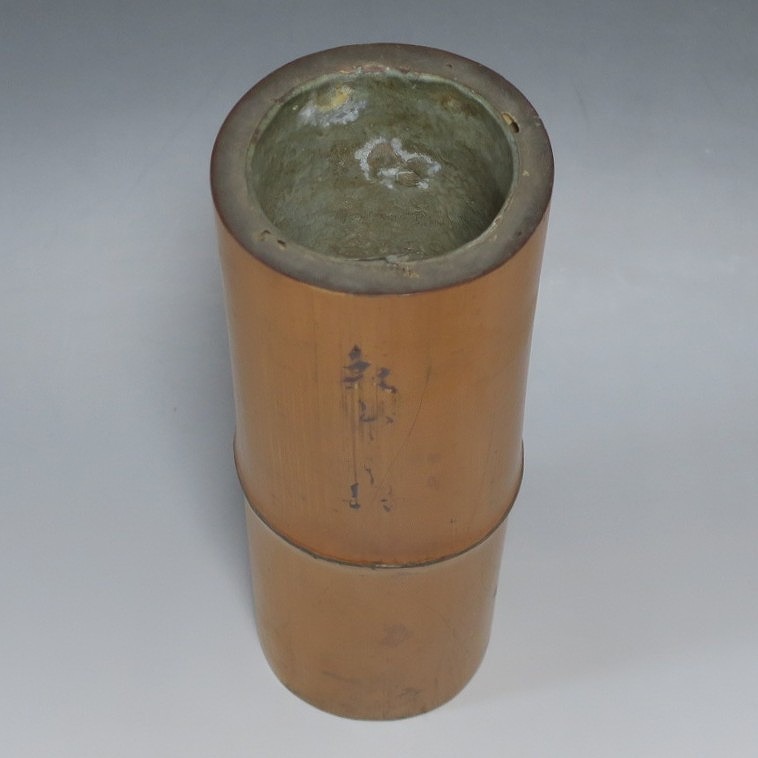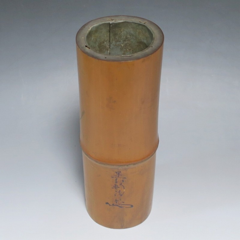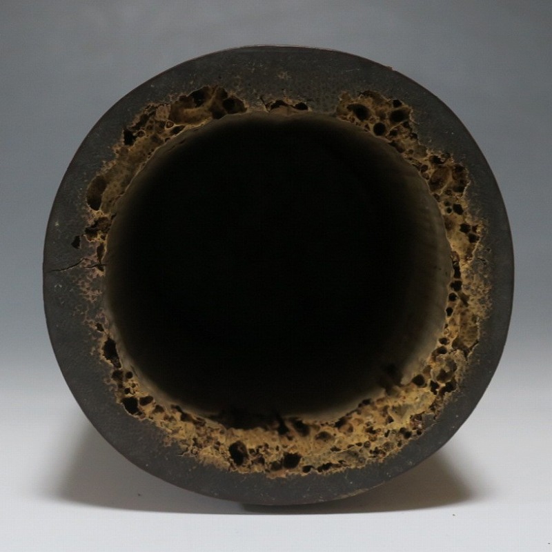 高さ 約29.3cm/口径 約10cm/高台 約9.9cm 経年の傷みや内側の金属部に錆、主に底部の内側に虫食いがあります。水漏れしますので、花を生ける際はオトシをご利用ください。状態は写真でご確認ください。 竹の花入れは、茶道の家元・千利休(1522年〜1591年)が発案した花入れです。元々、野仏用の花器でしたが、それを利休が芸術に高めました。本品は是心軒法眼(1734年〜1780年)の在判のある一重竹花入れ。是心軒法眼は京都で中流軒宣柳に学んだ後、江戸に帰り松月堂古流を創始した華道家です。淡海汐と名が付いています。竹の経年変化が美しい花器。花を活けてお楽しみください。 | ||