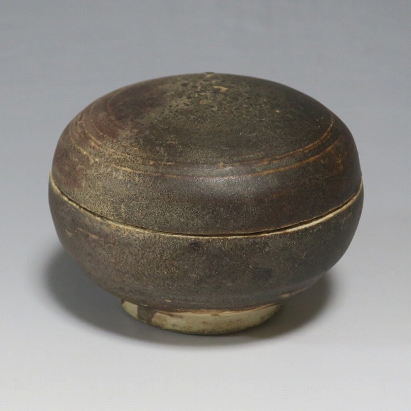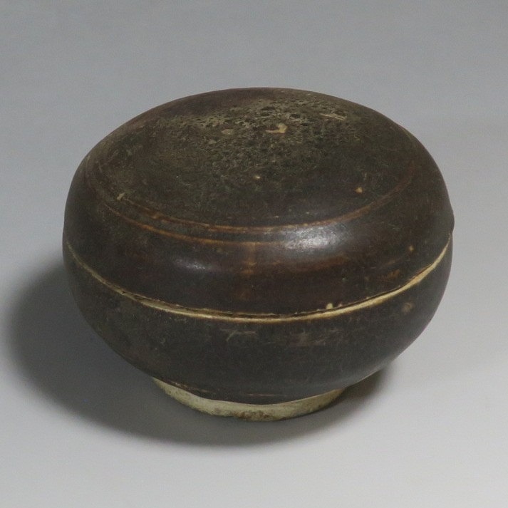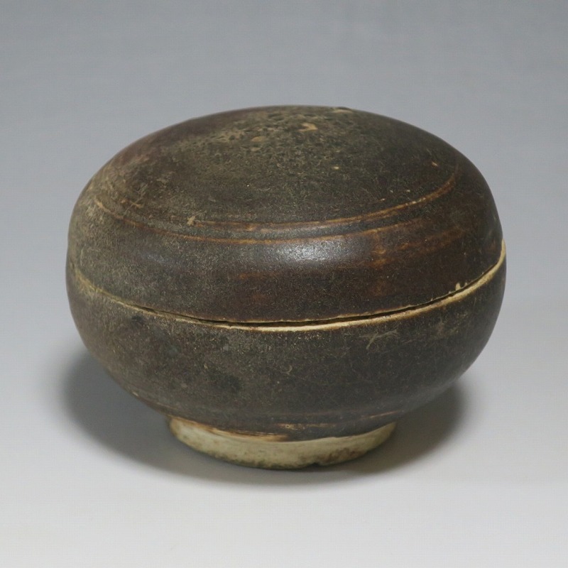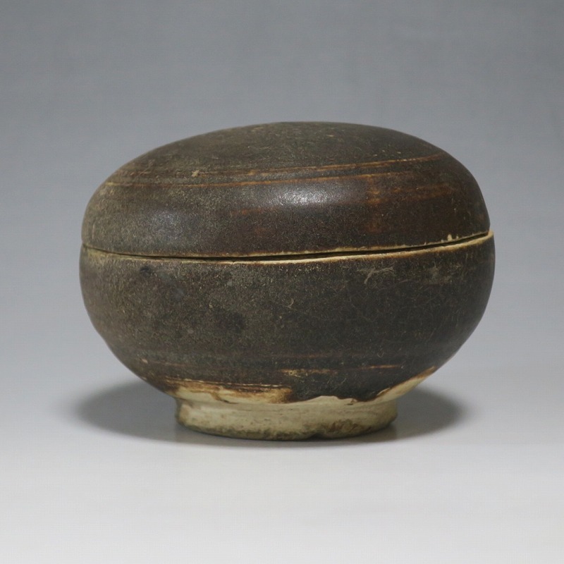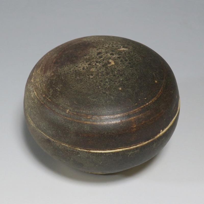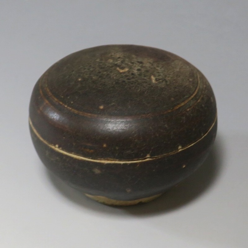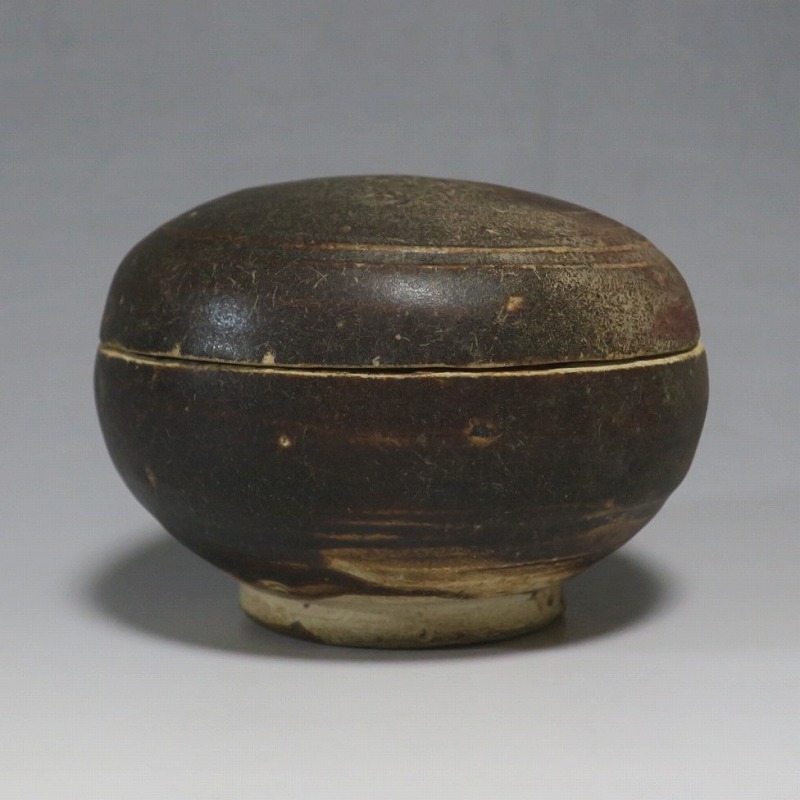 横幅 約8cm/高さ 約5.5cm 窯傷や小ホツはありますが、総じて良い状態です。状態は写真でご確認ください。 スンコロク(宋胡録)は14世紀前後から、タイ中北部のスワンカロークで作られた鉄絵、黒釉、青磁、褐釉などの古陶磁の総称です。 桃山時代から江戸時代初期にかけて、日本に蓋物などが輸入され、茶入れや香合など茶道具として用いられました。本品は香料入れなどに使用されたと考えられる褐釉の合子。同時代の中国、磁州窯などの影響を受けて作られたのでしょう。小ぶりなサイズの香合。飾りとして使用できます。 | ||