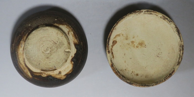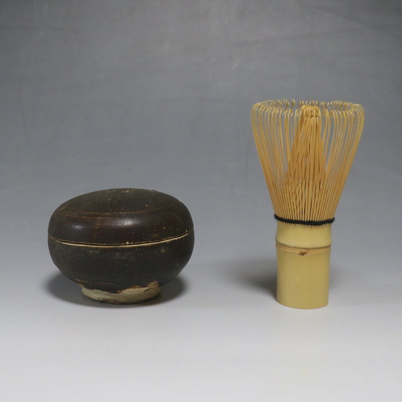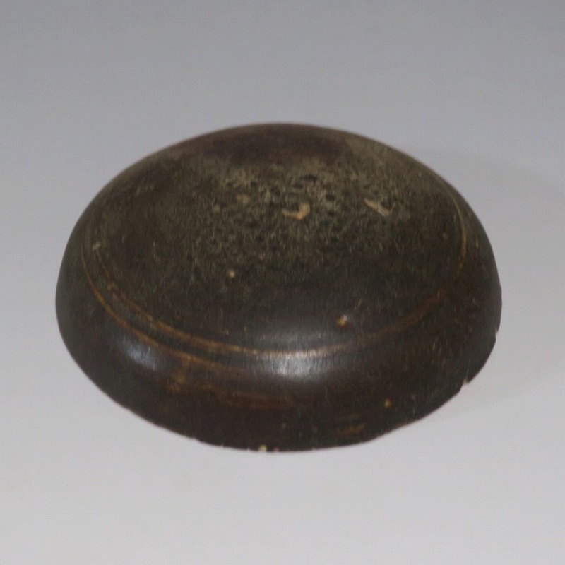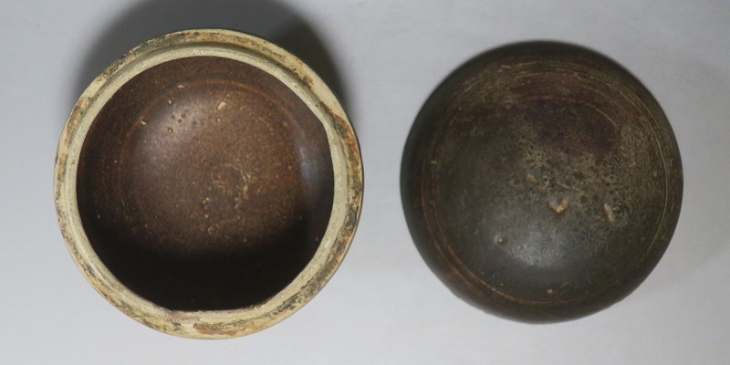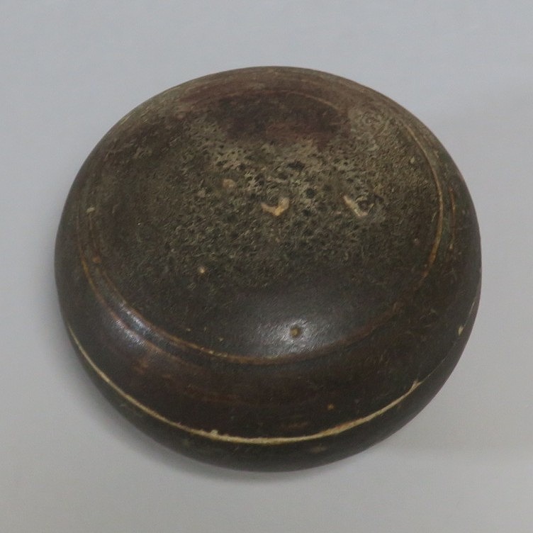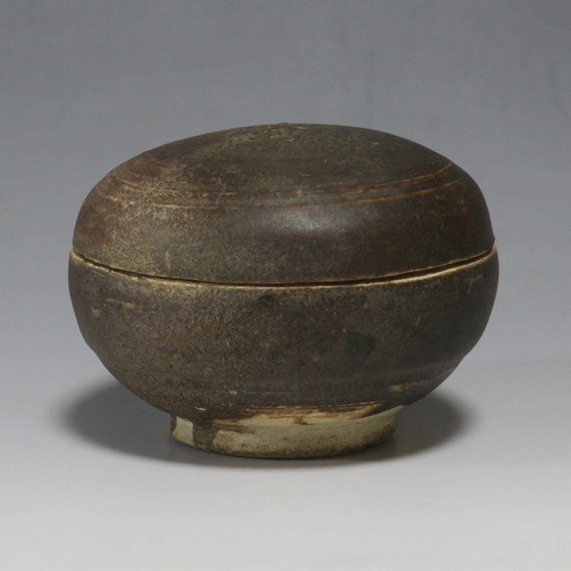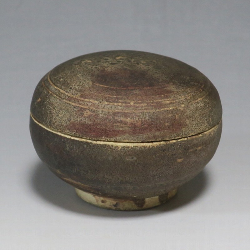 横幅 約8cm/高さ 約5.5cm 窯傷や小ホツはありますが、総じて良い状態です。状態は写真でご確認ください。 スンコロク(宋胡録)は14世紀前後から、タイ中北部のスワンカロークで作られた鉄絵、黒釉、青磁、褐釉などの古陶磁の総称です。 桃山時代から江戸時代初期にかけて、日本に蓋物などが輸入され、茶入れや香合など茶道具として用いられました。本品は香料入れなどに使用されたと考えられる褐釉の合子。同時代の中国、磁州窯などの影響を受けて作られたのでしょう。小ぶりなサイズの香合。飾りとして使用できます。 | ||