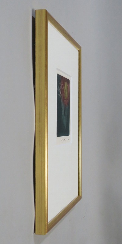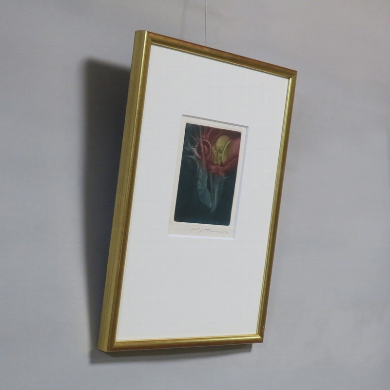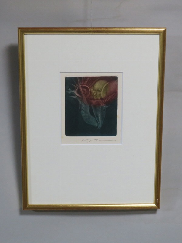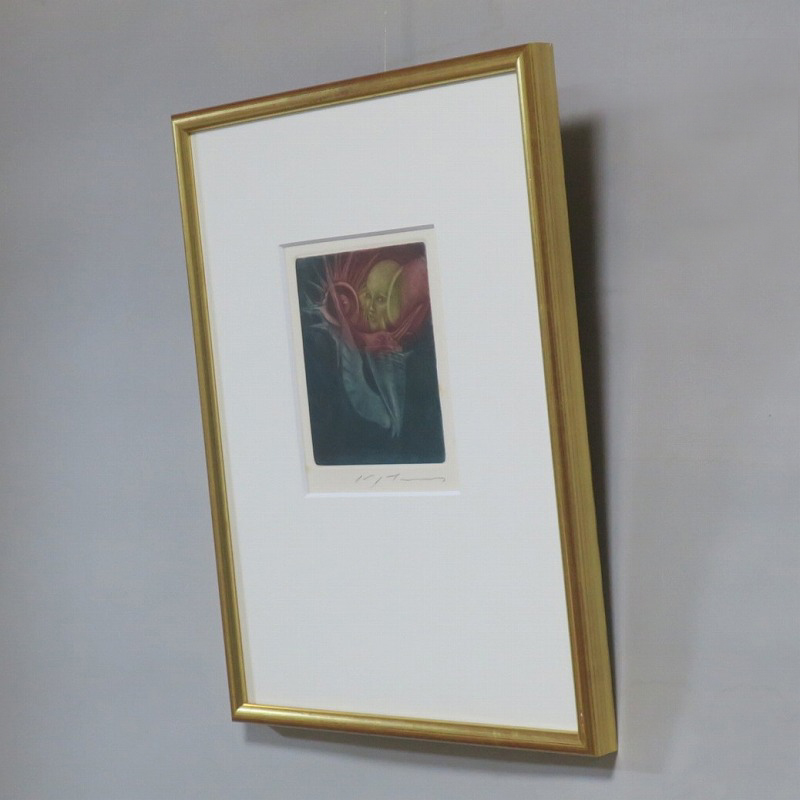 ピクチャーサイズ 縦横 約15.5cm×13cm 紙に銅版画。木製額、前面ガラス。経年の染みがありますが、総じて良い状態です。状態は写真でご確認ください。 池田満寿夫(1934年〜1997年)は、画家・版画家・挿絵画家・彫刻家・陶芸家・小説家・映画監督など多彩な才能を発揮した芸術家です。その活躍は多方面に渡り、1977年には小説「エーゲ海に捧ぐ」で芥川賞を受賞しています。本品は池田が1950年に製作した小川国夫の著作「或る聖書」(筑摩書房)の挿絵版画。限定235部のうちの1部です。池田がまだ有名になる前のショールリアリズム風の作品。神田にある山田書店の取り扱いシールが貼ってあります。本作を見ると池田満寿夫の独特の世界を感じることができます。インテリアとしてお楽しみください。 | ||