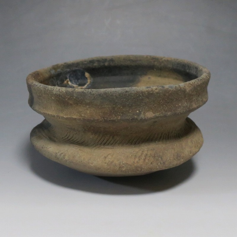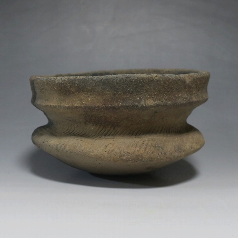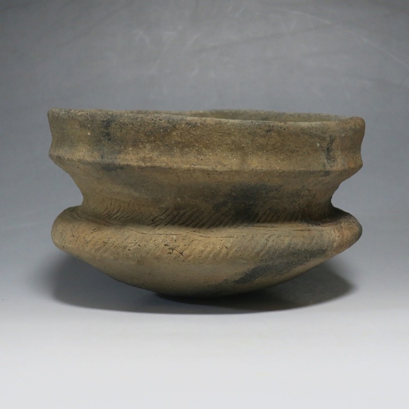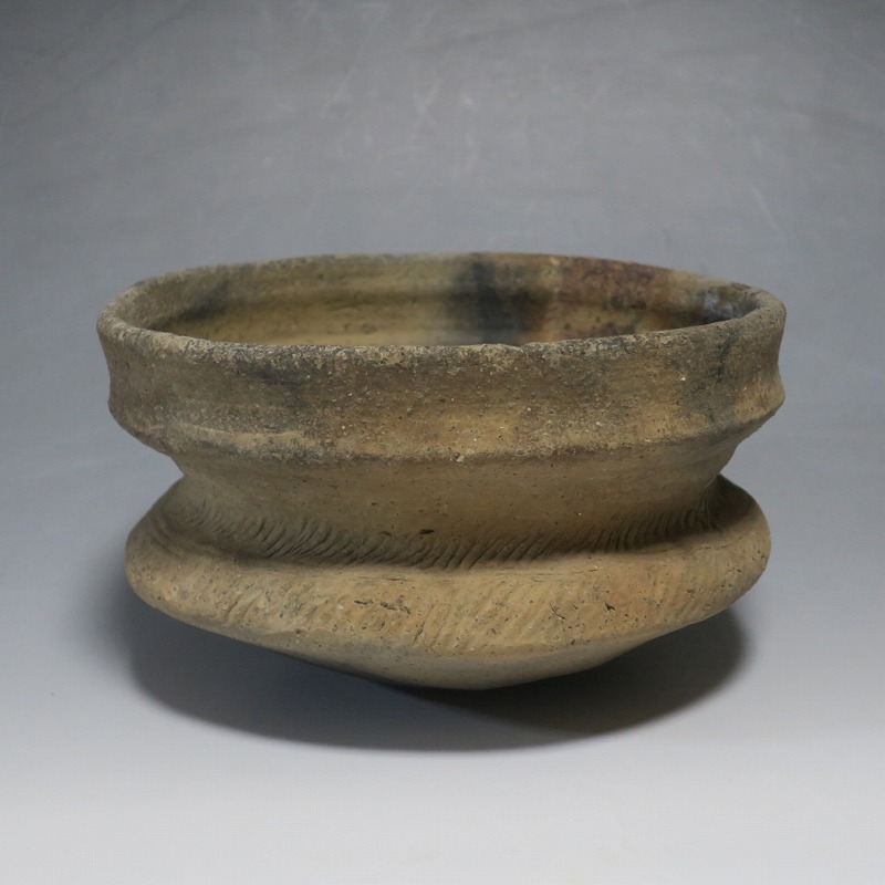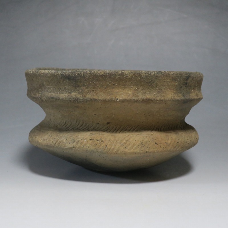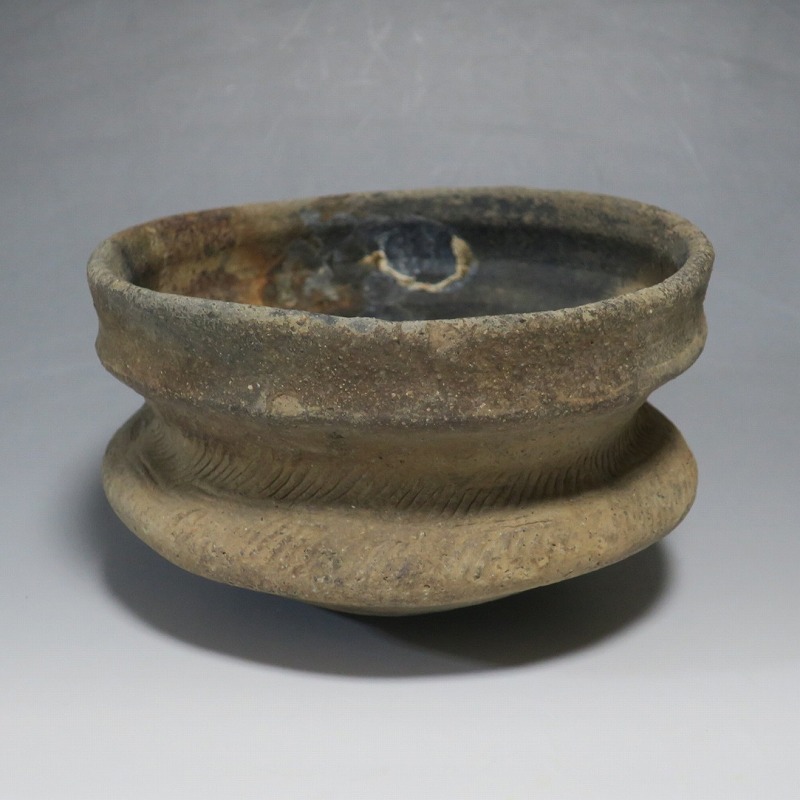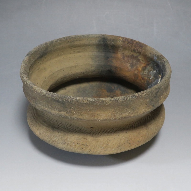 (タイ 紀元前500年) 商品番号 4220 口径 約16.5cm/高さ 約9.8cm 発掘品のため全体的に土や錆の付着があり、口辺から約2cmのニュウや若干のアタリはありますが、総じて良い状態です。状態は写真でご確認ください。 バンチェン遺跡は、タイ・ウドーンターニー県・ノーンハーン郡にあるユネスコの世界遺産に登録されている古代遺跡です。紀元前数千年に発生したタイの有史以前の土器で、現在、この文明について研究が行われています。本品は紀元前500年前後に作られた小型の広口土器。一般的にバンチェン土器は黒陶や白陶、線刻や彩色が施されていますが、本品はシンプルな土器となっています。珍しい形をした古代土器です。インテリア、落としを使用して花器としてお楽しみください、 | ||