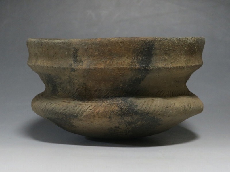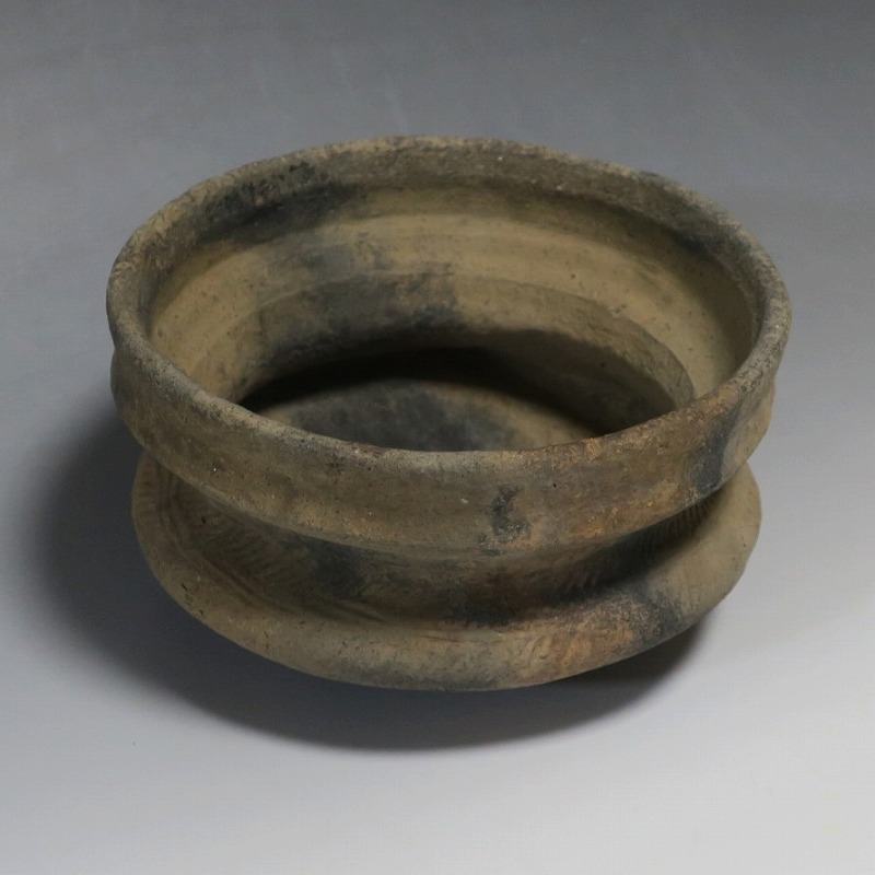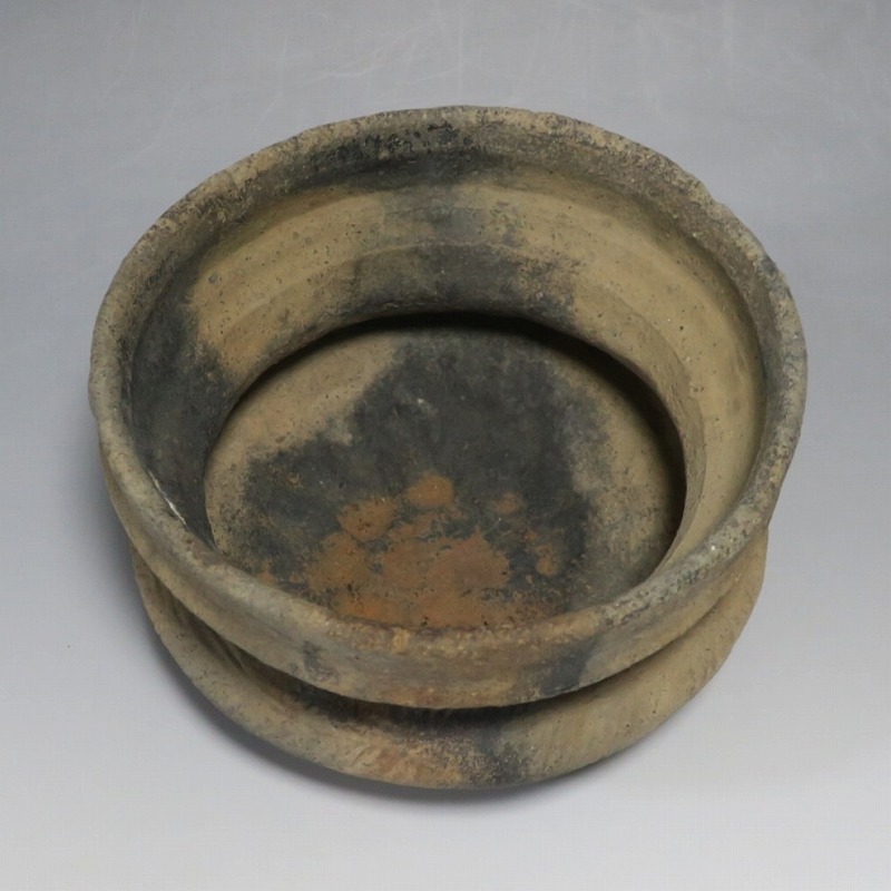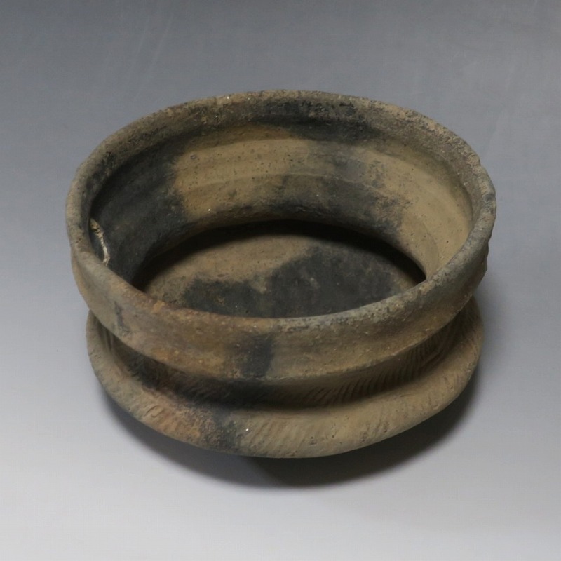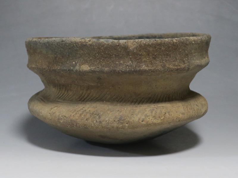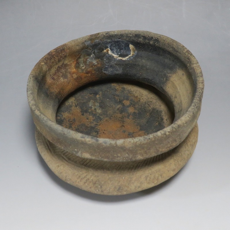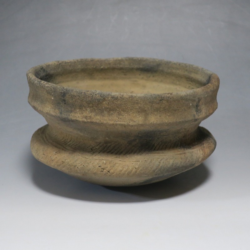 (タイ 紀元前500年) 商品番号 4220 口径 約16.5cm/高さ 約9.8cm 発掘品のため全体的に土や錆の付着があり、口辺から約2cmのニュウや若干のアタリはありますが、総じて良い状態です。状態は写真でご確認ください。 バンチェン遺跡は、タイ・ウドーンターニー県・ノーンハーン郡にあるユネスコの世界遺産に登録されている古代遺跡です。紀元前数千年に発生したタイの有史以前の土器で、現在、この文明について研究が行われています。本品は紀元前500年前後に作られた小型の広口土器。一般的にバンチェン土器は黒陶や白陶、線刻や彩色が施されていますが、本品はシンプルな土器となっています。珍しい形をした古代土器です。インテリア、落としを使用して花器としてお楽しみください、 | ||