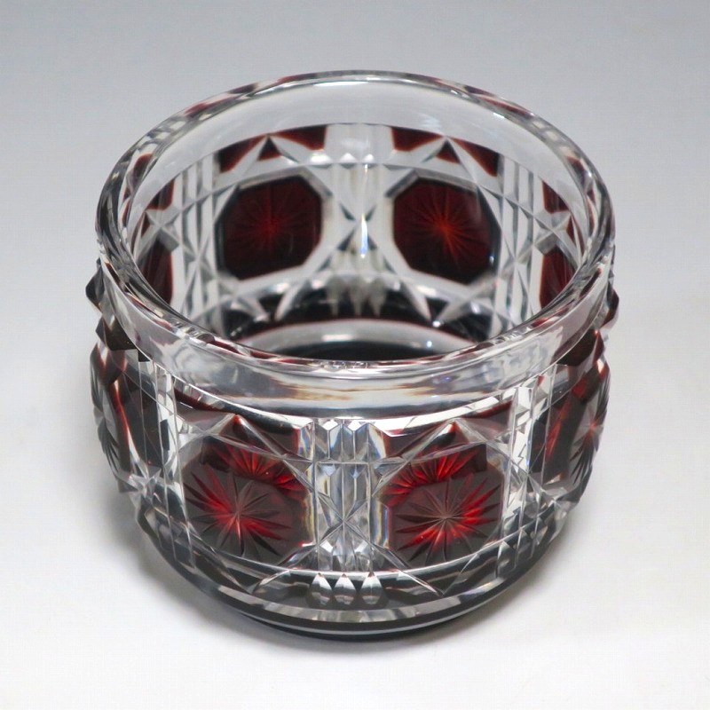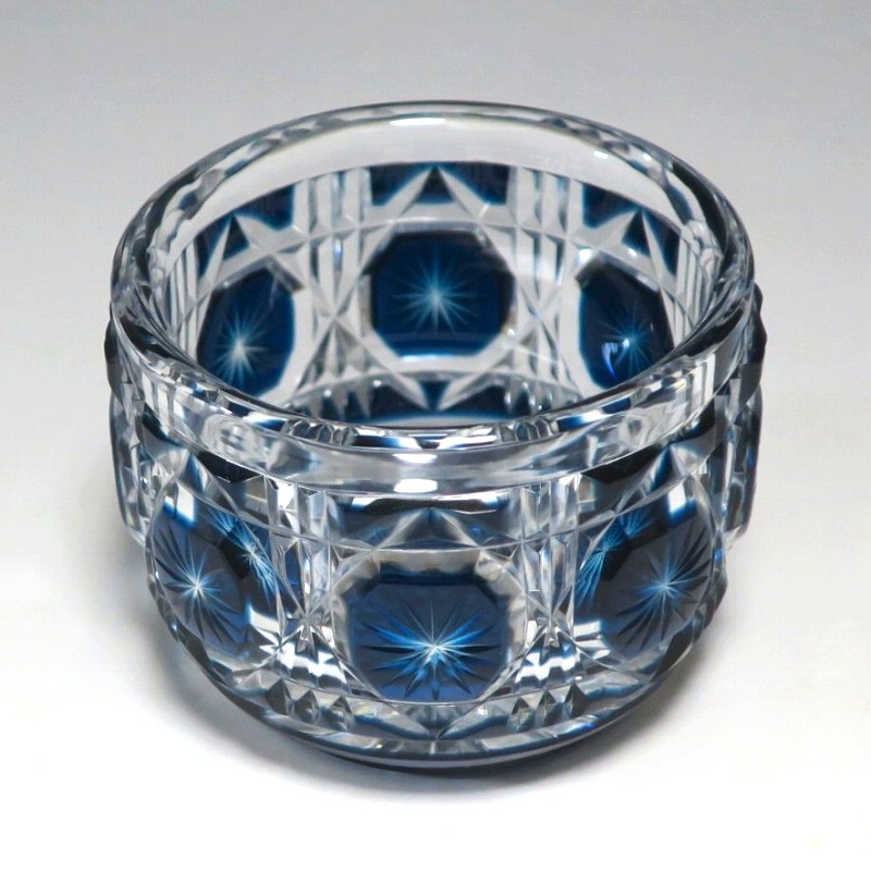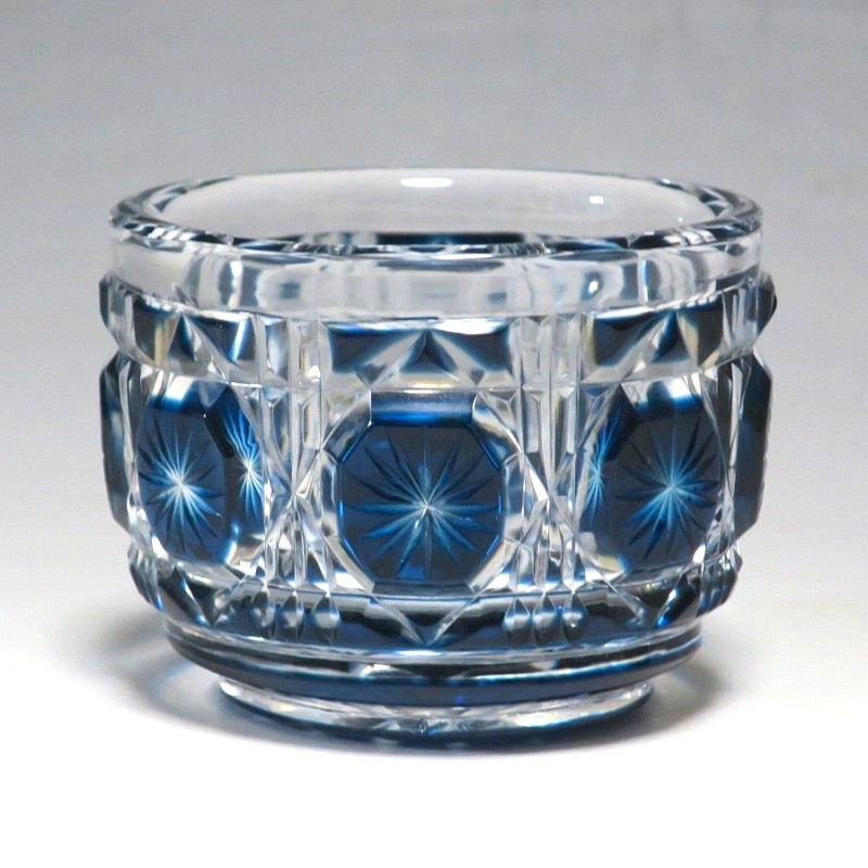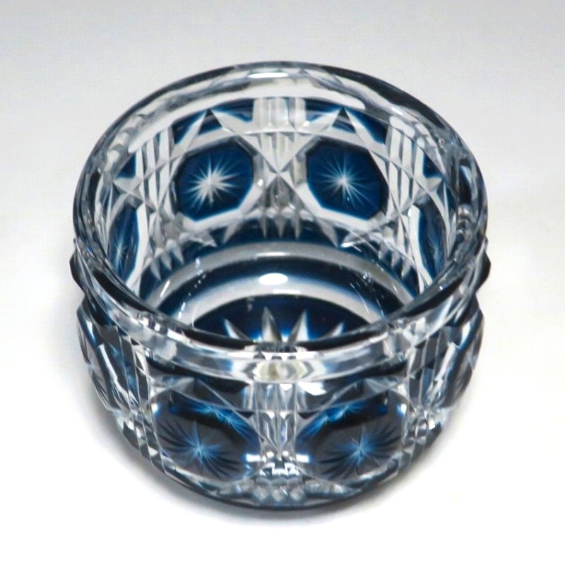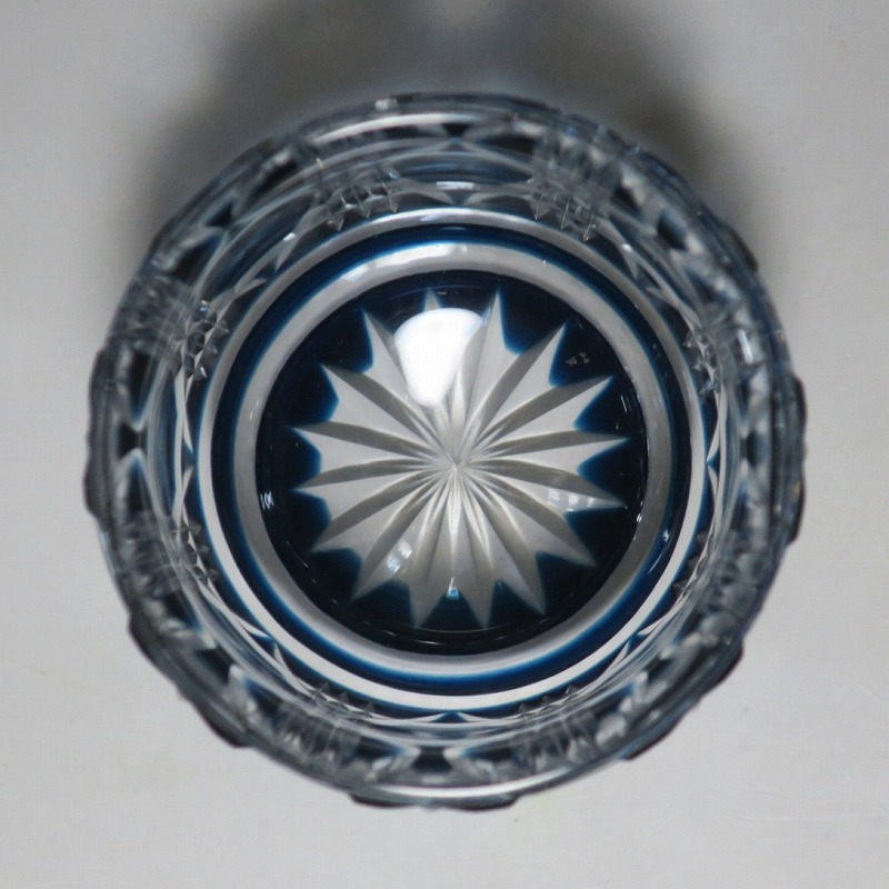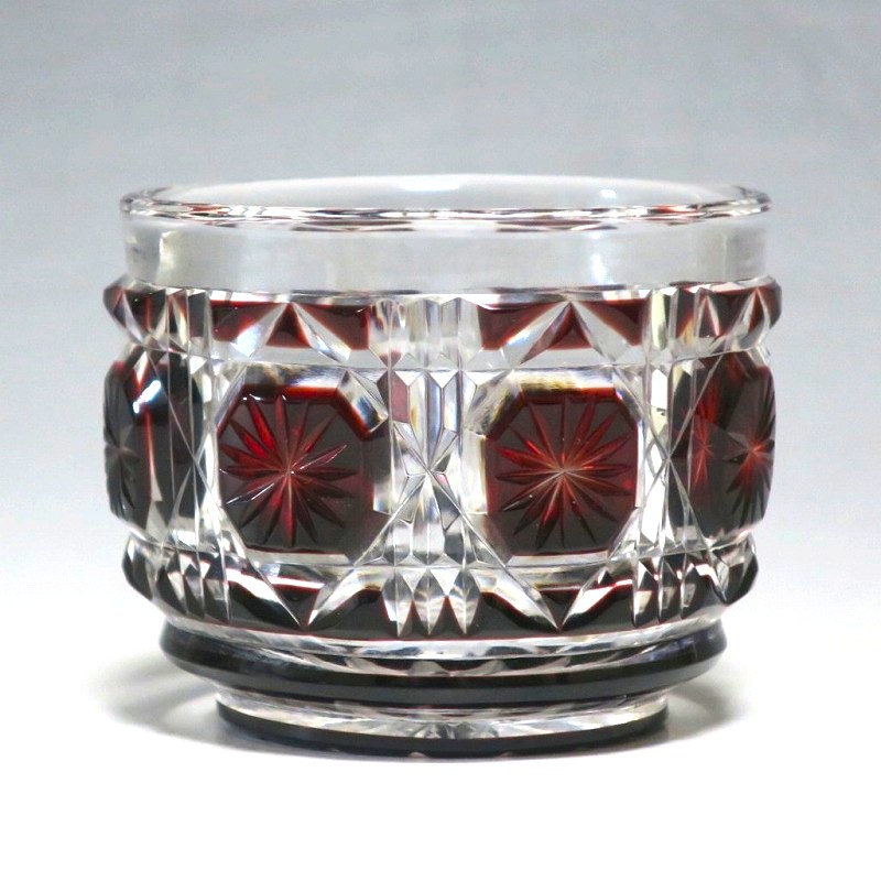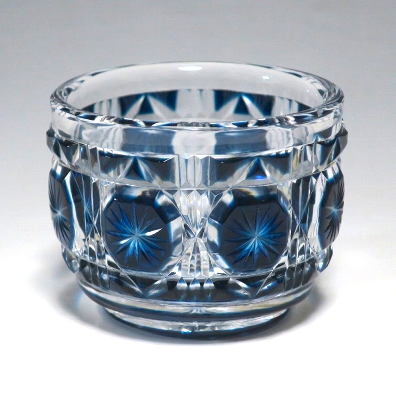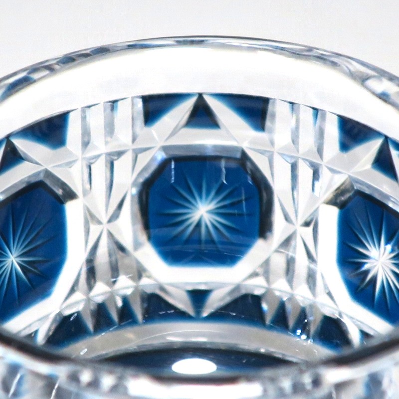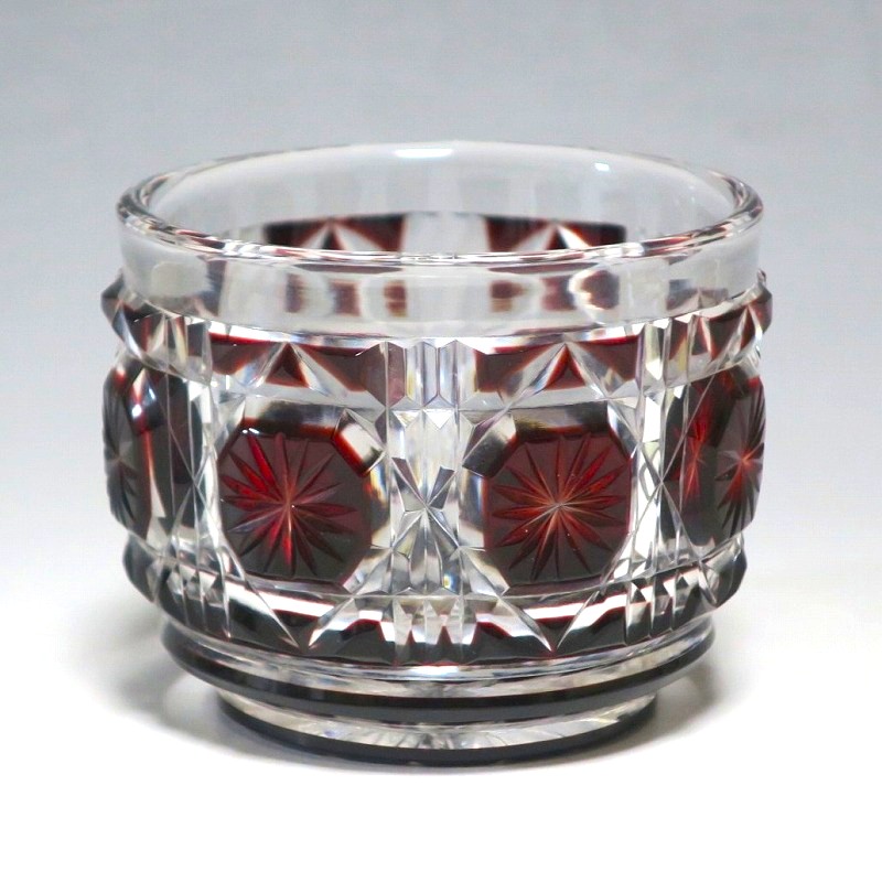 口径 約6.3cm/高さ 約5cm/高台径 約4.4cm 完品です。状態は写真でご確認ください。 薩摩切子は江戸時代後期、薩摩藩主・島津斉彬によって創製されたカットガラスです。赤や青、黄色などの色を被せ、ガラスをカットして模様をデザインしました。本品は尚古集成館監修で製作された薩摩切子の赤被せ、青被せガラス猪口2客セット。1985年に設立された薩摩ガラス工芸株式会社が製作した作品です。薩摩切子独特の厚みのある色被せとぼかしを使った手作り感のある猪口です。本品を使って日本酒を飲むと気分が良いと思います。普段使いの酒器としてお楽しみください。 | ||