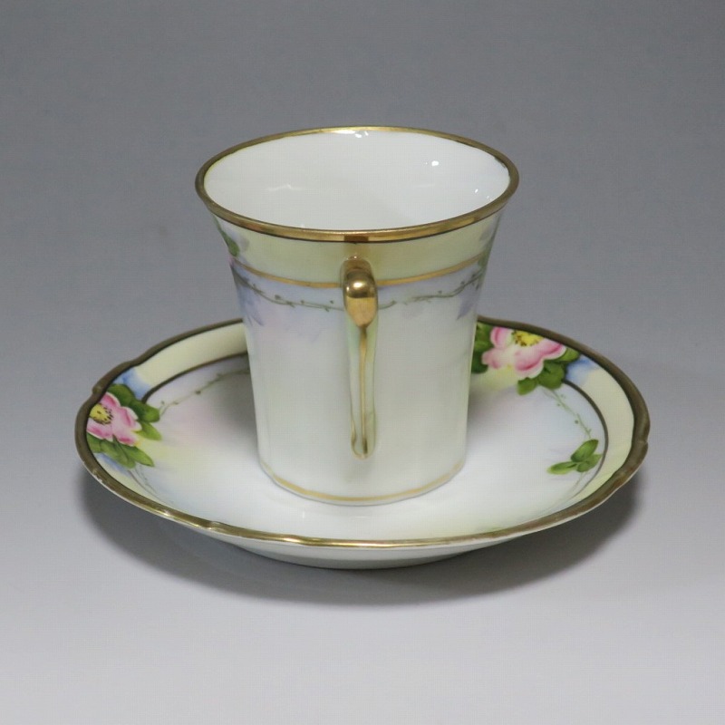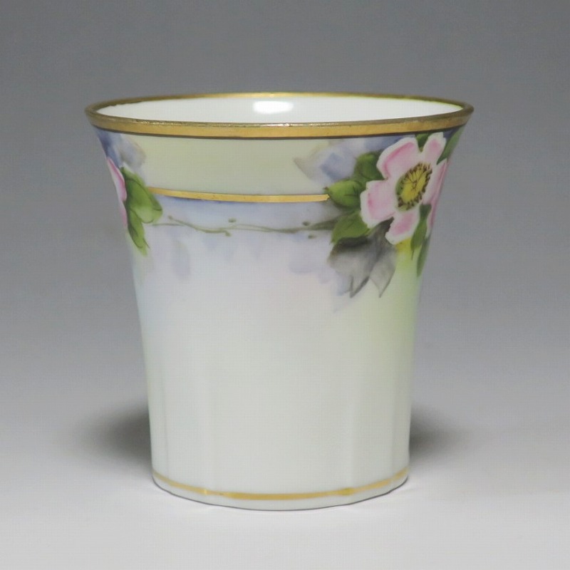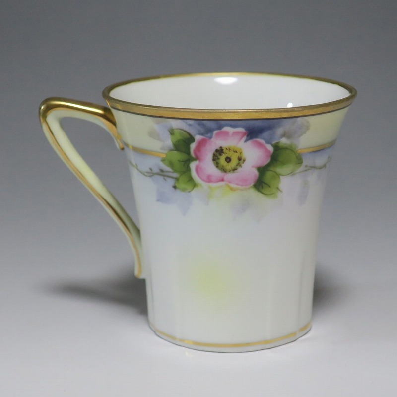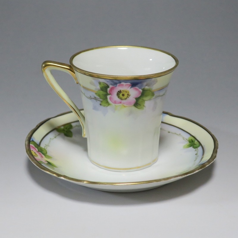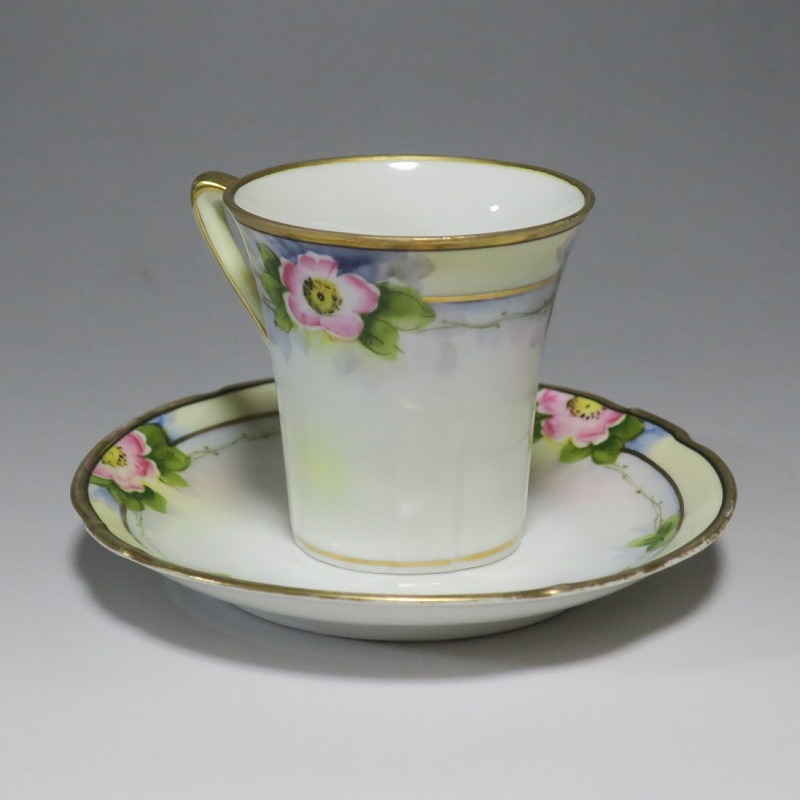 カップ 口径 約6.8cm/高さ 約6.7cm/高台径 約4.5cm 窯傷はありますが、完品です。状態は写真でご確認ください。 「オールドノリタケ」は、日本陶器合名会社(現ノリタケ・カンパニー・リミティッド)が明治時代から戦前に欧米へ輸出した陶磁器の名称です。芸術的な絵付けや繊細な細工が施された作品は現在でも人気があります。本品は胴部やソーサーの縁にばら文が描かれたカップ&ソーサー。余白を活かしたシンプルなデザインの作品です。1918年(大正7年)から使用されたバックスタンプが入っています。本品でコーヒーをお楽しみください。 | ||