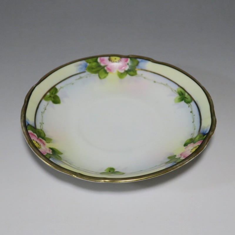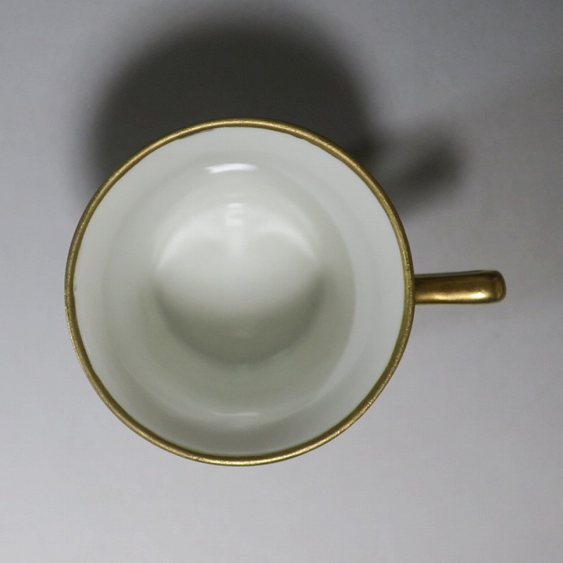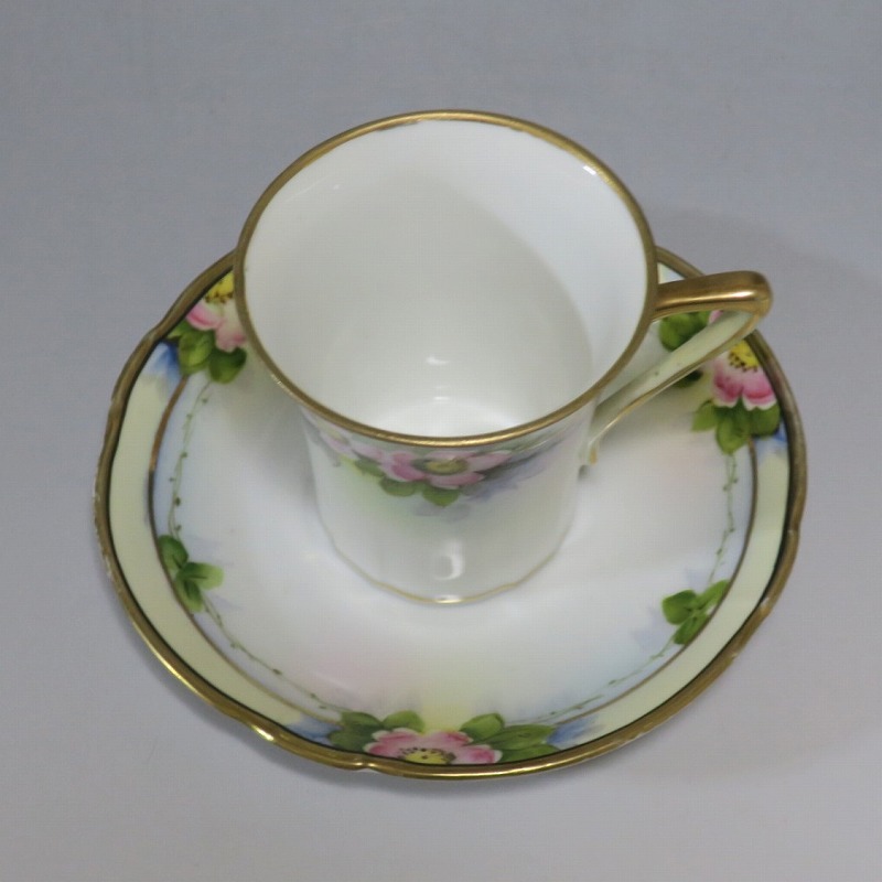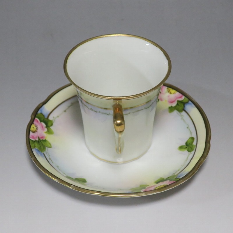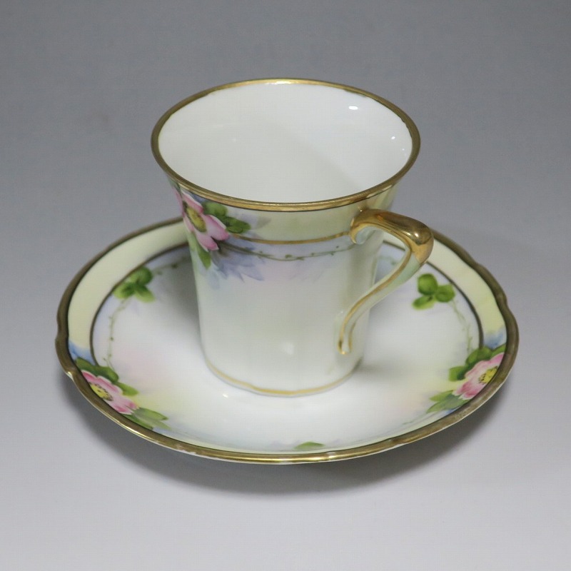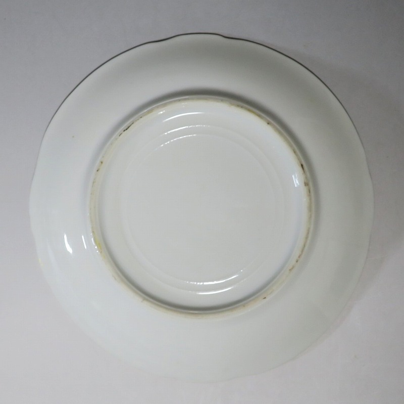 カップ 口径 約6.8cm/高さ 約6.7cm/高台径 約4.5cm 窯傷はありますが、完品です。状態は写真でご確認ください。 「オールドノリタケ」は、日本陶器合名会社(現ノリタケ・カンパニー・リミティッド)が明治時代から戦前に欧米へ輸出した陶磁器の名称です。芸術的な絵付けや繊細な細工が施された作品は現在でも人気があります。本品は胴部やソーサーの縁にばら文が描かれたカップ&ソーサー。余白を活かしたシンプルなデザインの作品です。1918年(大正7年)から使用されたバックスタンプが入っています。本品でコーヒーをお楽しみください。 | ||