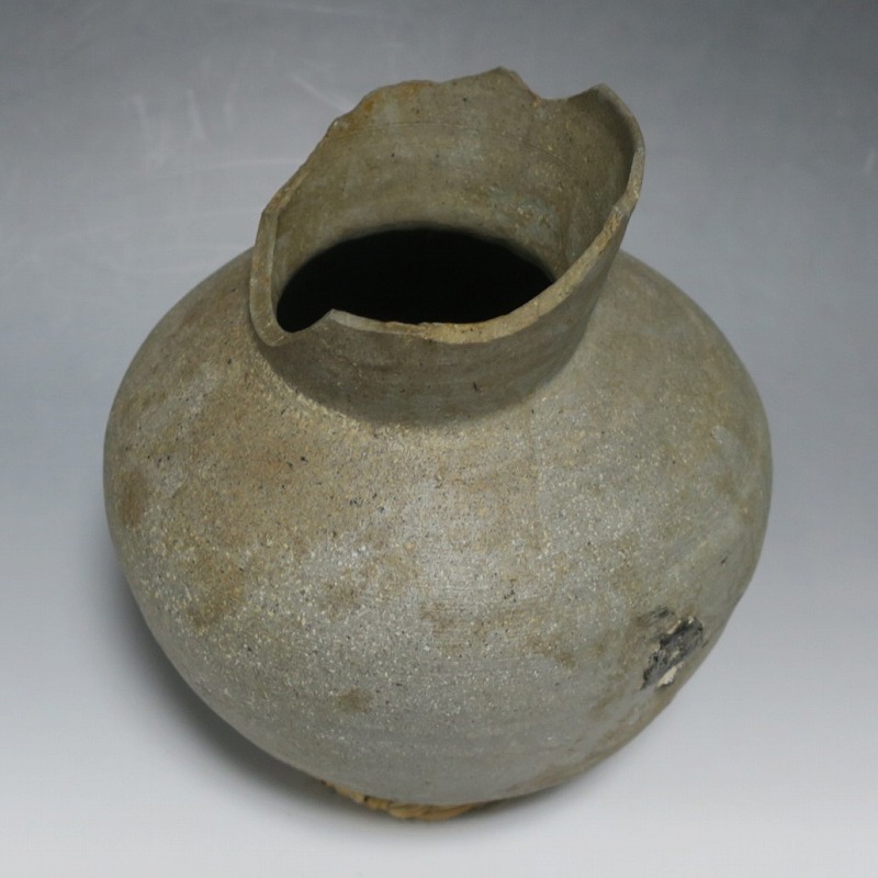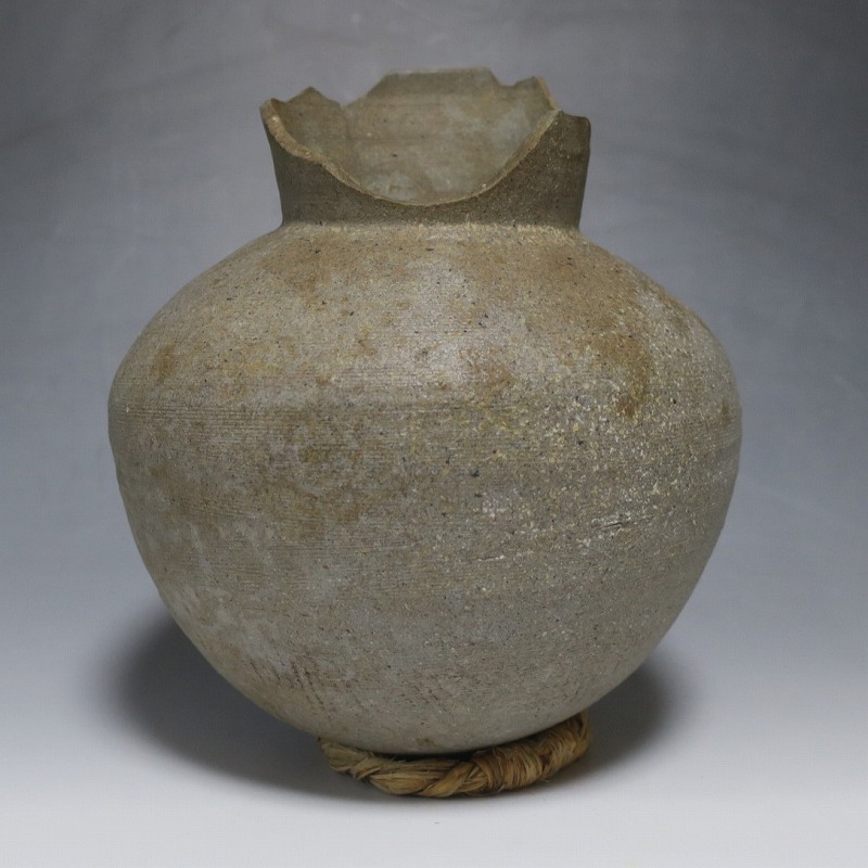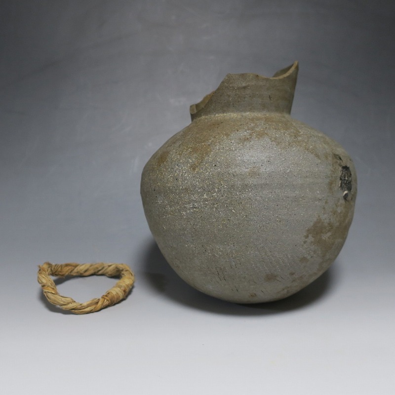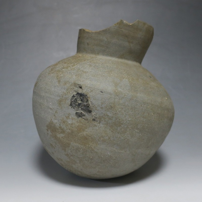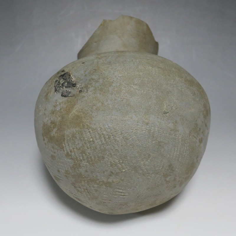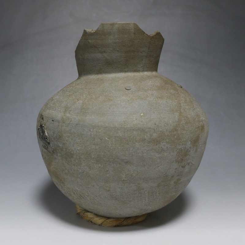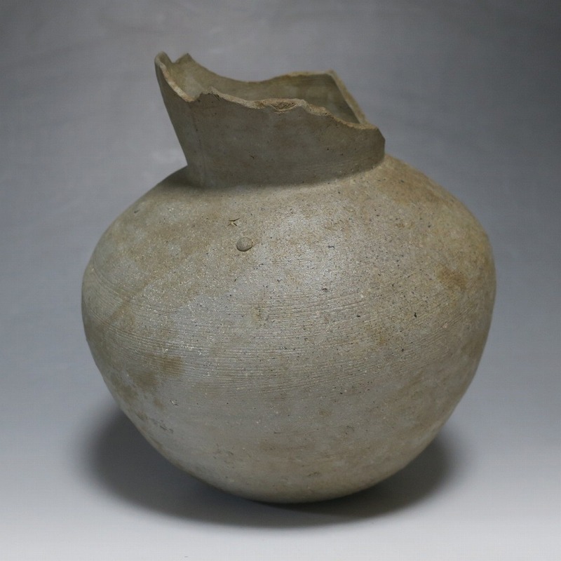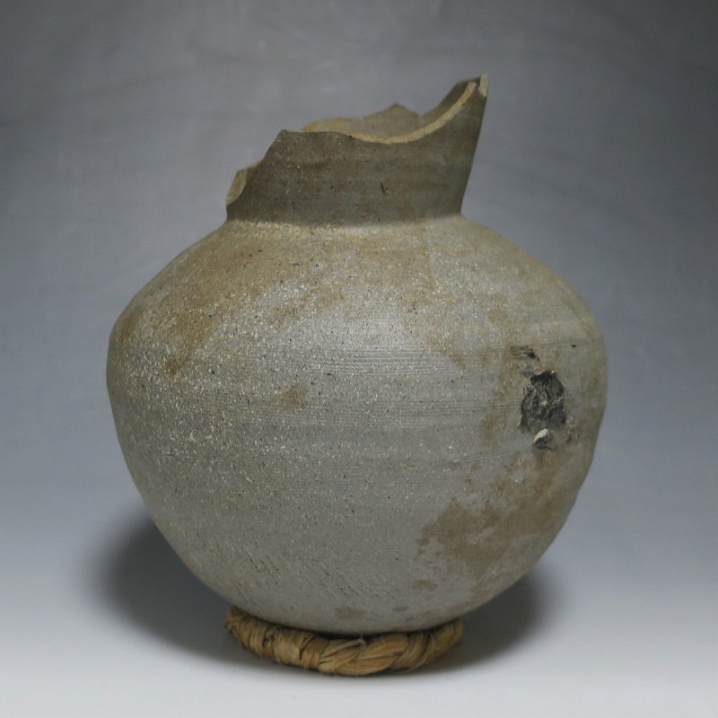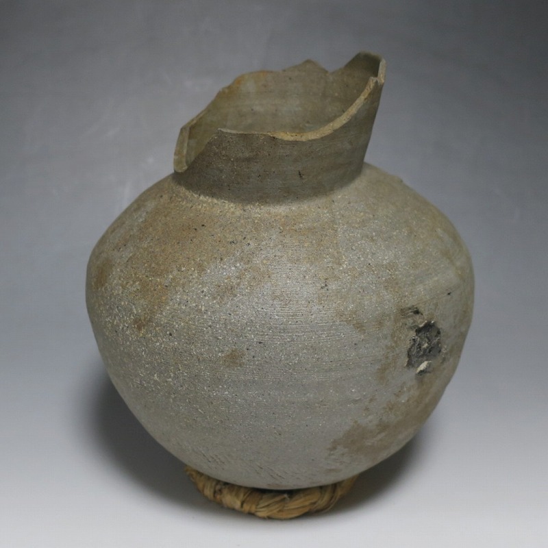 (古墳時代 6世紀) 商品番号 4243 高さ 約21cm/胴径 約18.5cm/口径 約10cm 口辺が欠損しています。状態は写真でご確認ください。 須恵器は4世紀頃、朝鮮半島で焼き始められた硬質陶器(b器)です。耐水性に優れた焼物なので祭祀用などの祭器として使用されました。日本には4世紀後半に伝来、5世紀中頃には生産が始まります。本品は6世紀に日本で作られたと考えられる小壺。首部が欠損した作品ですが、割れ方が良いので洒落た感じがします。野草を活けると映えそうな須恵器。インテリアとしてお楽しみください。 | ||