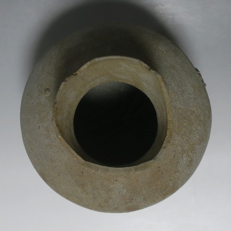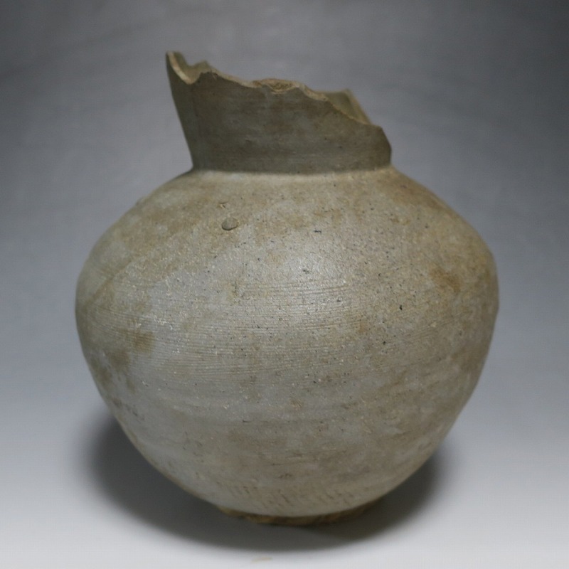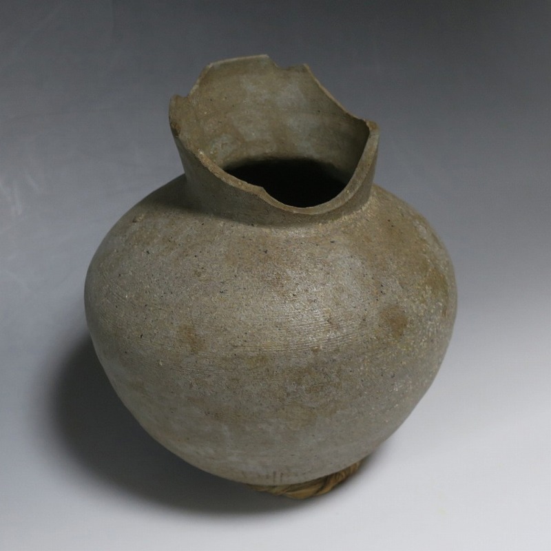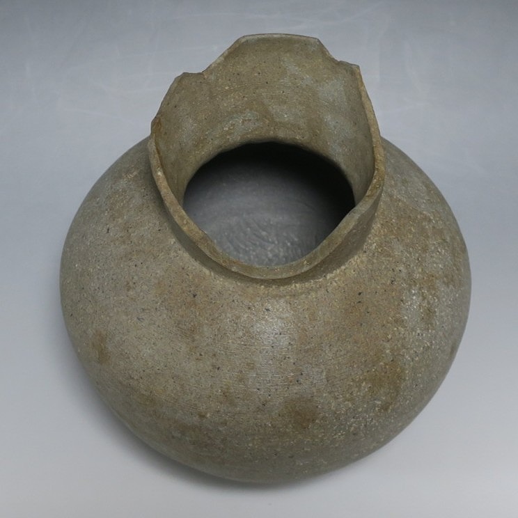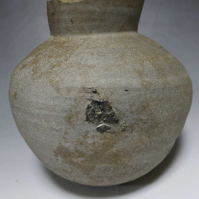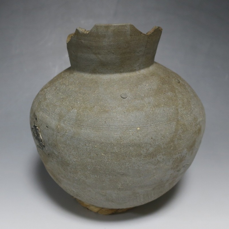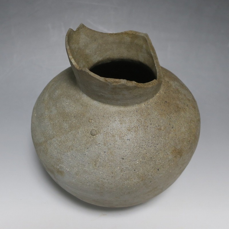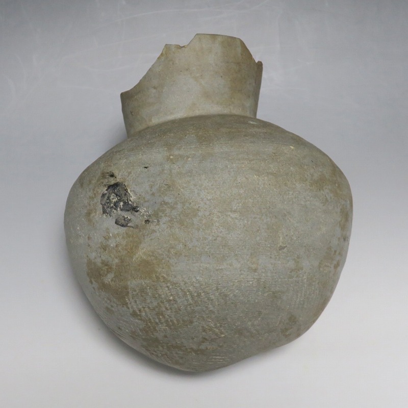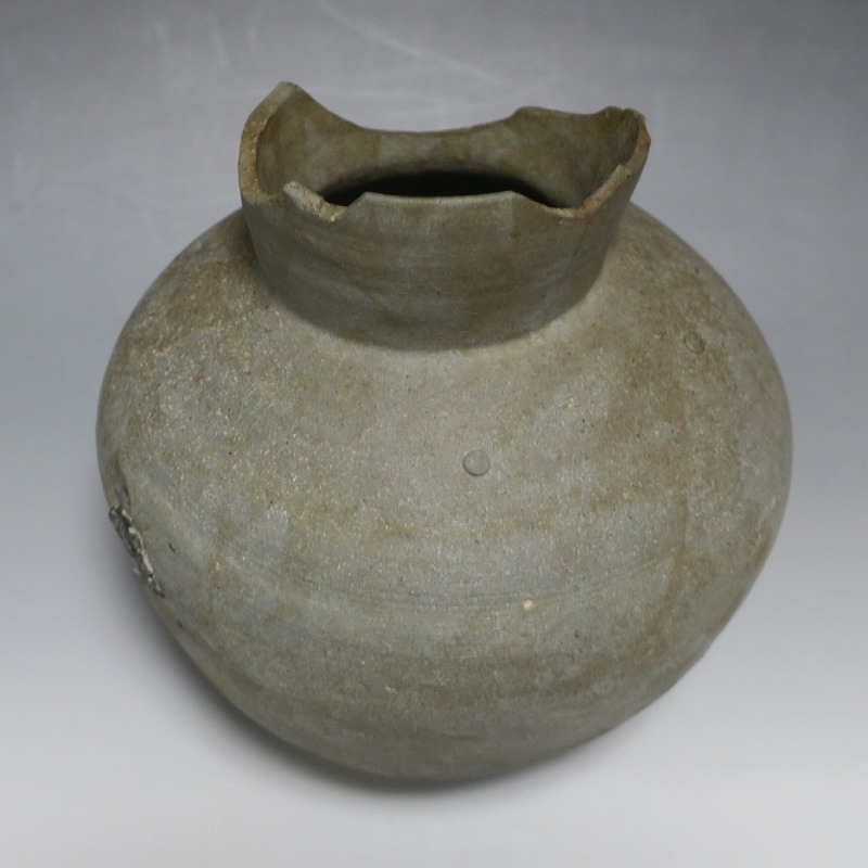 (古墳時代 6世紀) 商品番号 4243 高さ 約21cm/胴径 約18.5cm/口径 約10cm 口辺が欠損しています。状態は写真でご確認ください。 須恵器は4世紀頃、朝鮮半島で焼き始められた硬質陶器(b器)です。耐水性に優れた焼物なので祭祀用などの祭器として使用されました。日本には4世紀後半に伝来、5世紀中頃には生産が始まります。本品は6世紀に日本で作られたと考えられる小壺。首部が欠損した作品ですが、割れ方が良いので洒落た感じがします。野草を活けると映えそうな須恵器。インテリアとしてお楽しみください。 | ||
