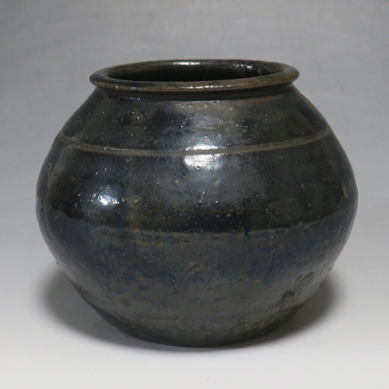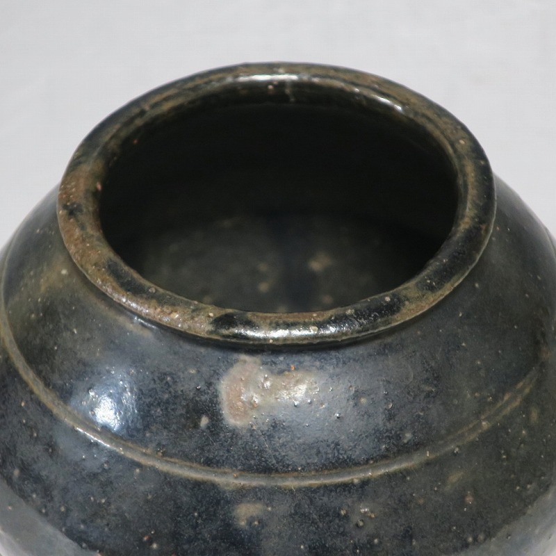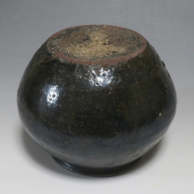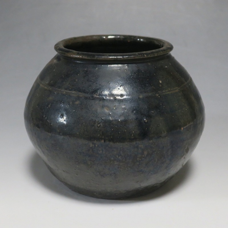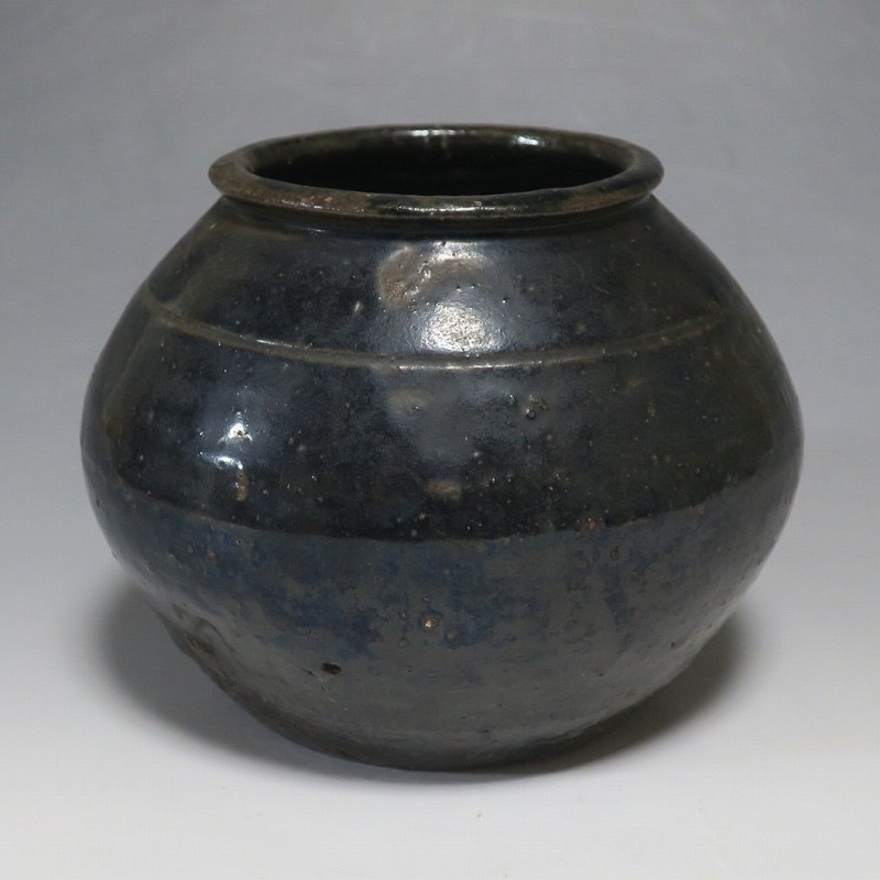 高さ 約11.3cm/胴径 約14cm 口辺から約4cmと6cmのニュウがありますので、花を生ける際はオトシをご利用ください。写真でご確認ください。 李朝時代後期になると朝鮮半島では鉄釉や飴釉作品が作られるようになります。大小の面取り壺や丸壺は主に生活雑器として使用されました。本品は鉄釉の丸壺。白磁に比べると鉄釉の丸壺は数が少ない作品です。釉薬が河南天目に似ているので朝鮮半島北部、中国との国境付近で作られた作品と想像できます。美しい形をした丸壺です。色のある花を活けると映えるでしょう。 | ||