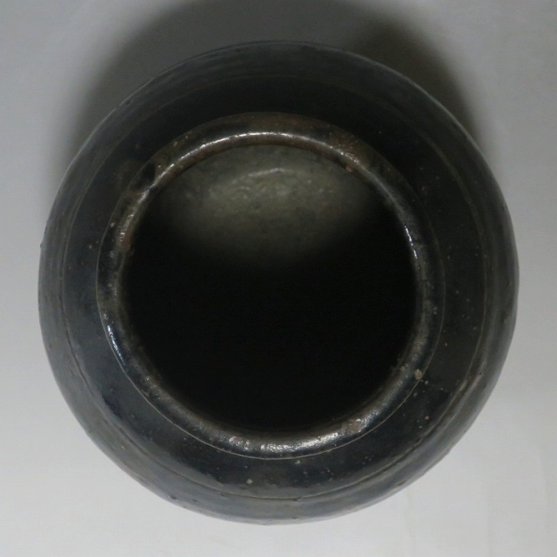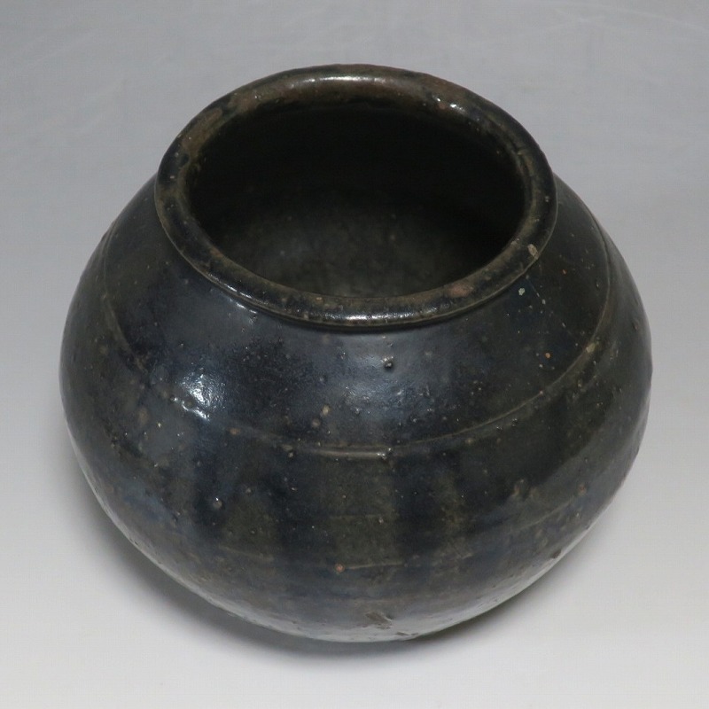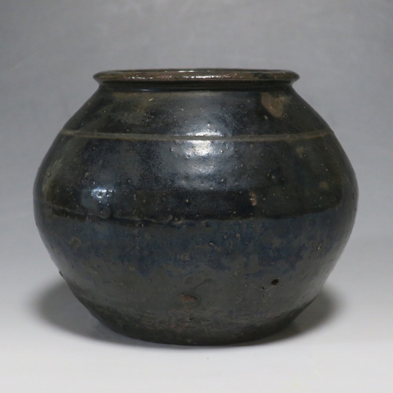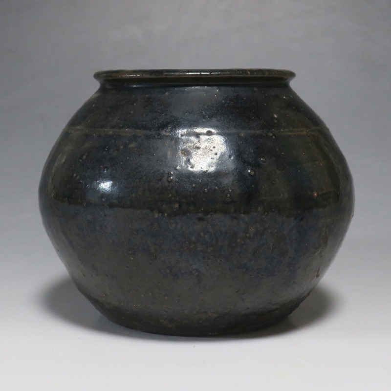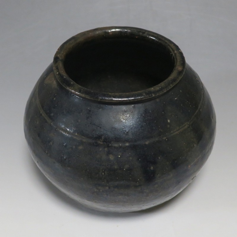 高さ 約11.3cm/胴径 約14cm 口辺から約4cmと6cmのニュウがありますので、花を生ける際はオトシをご利用ください。写真でご確認ください。 李朝時代後期になると朝鮮半島では鉄釉や飴釉作品が作られるようになります。大小の面取り壺や丸壺は主に生活雑器として使用されました。本品は鉄釉の丸壺。白磁に比べると鉄釉の丸壺は数が少ない作品です。釉薬が河南天目に似ているので朝鮮半島北部、中国との国境付近で作られた作品と想像できます。美しい形をした丸壺です。色のある花を活けると映えるでしょう。 | ||