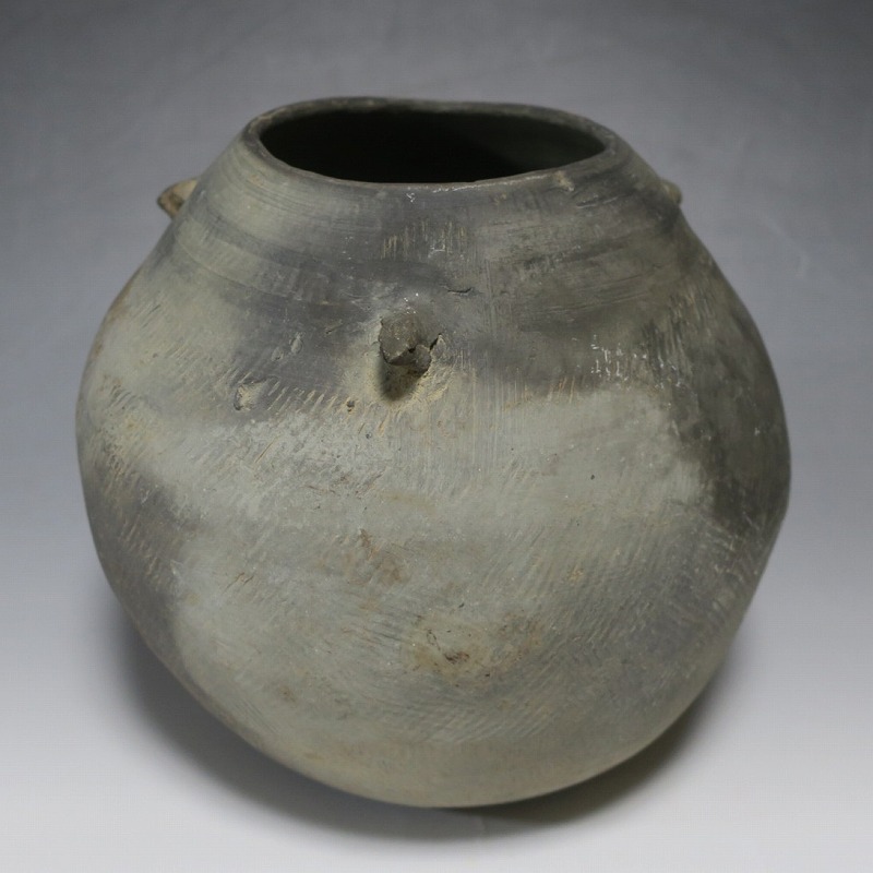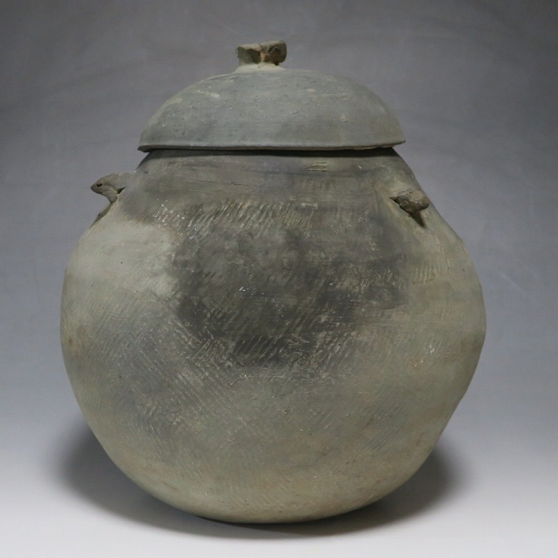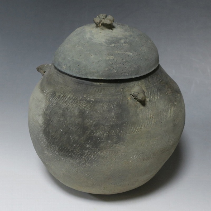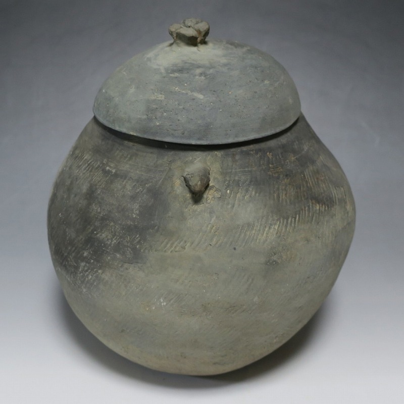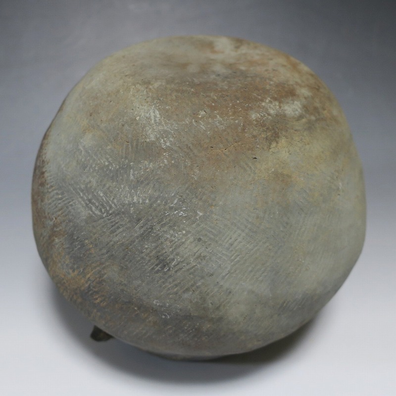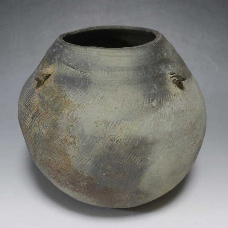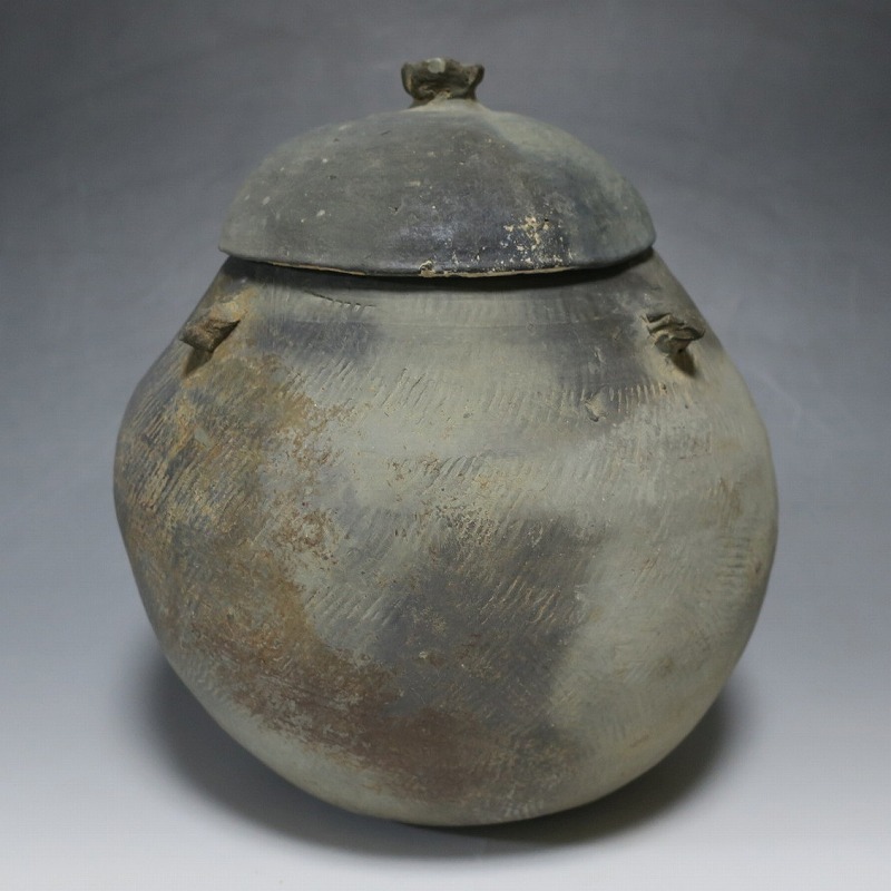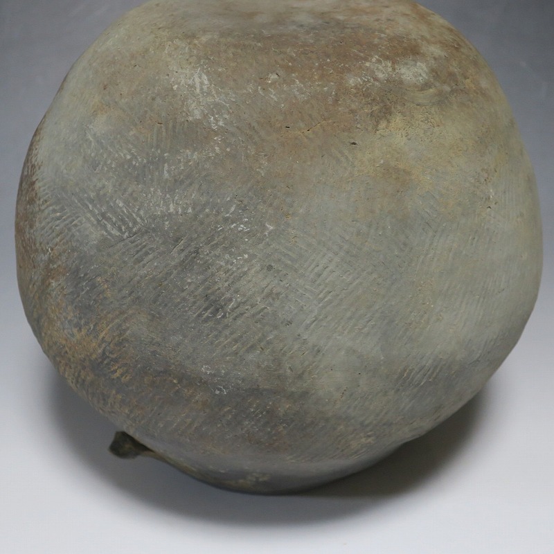 高さ 約24cm/胴径 約22cm 発掘時の土が付着し、窯傷はありますが、総じて良い状態です。花を生ける際はオトシをご利用ください。状態は写真でご確認ください。 須恵器は4世紀頃、朝鮮半島で焼き始められた硬質陶器(b器)です。耐水性に優れた焼物なので祭祀用などの祭器として使用されました。日本には4世紀後半に伝来、5世紀中頃には生産が始まります。本品は9世紀、奈良時代後期に作られた三耳壺。発掘時に同時に出土した蓋を付けたと考えられる作品です。叩き目から9世紀に作られた作品であると鑑定できます。「須恵器蓋付三耳壺 岡山県英田郡美作出土壺」の箱書きがあり、出土地がはっきりしている須恵器です。密教が興隆した時代に製作された珍しい造形の三耳壺。資料やインテリア、花器としてお楽しみください。 | ||