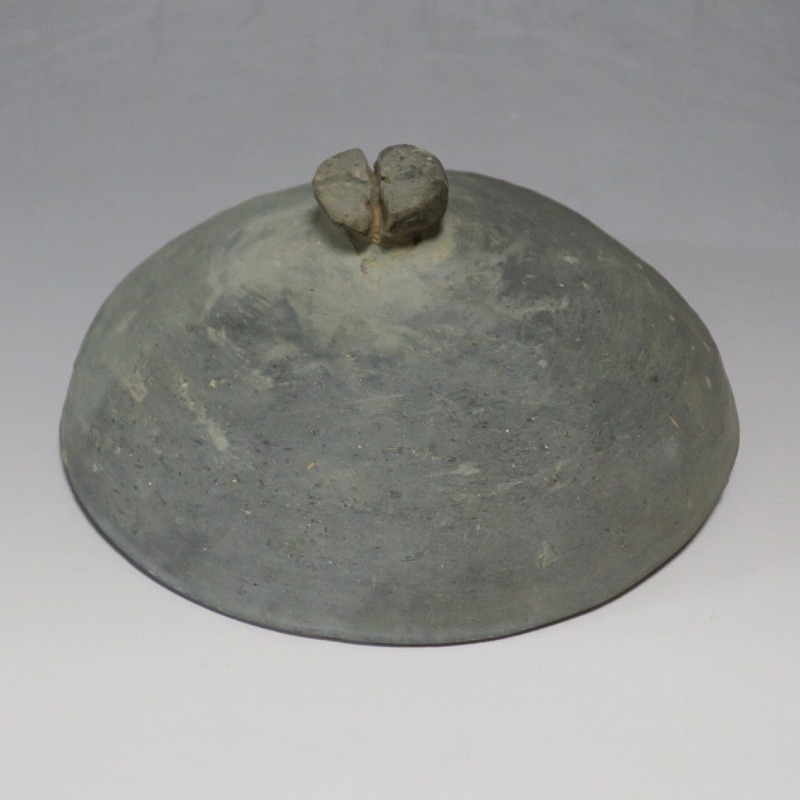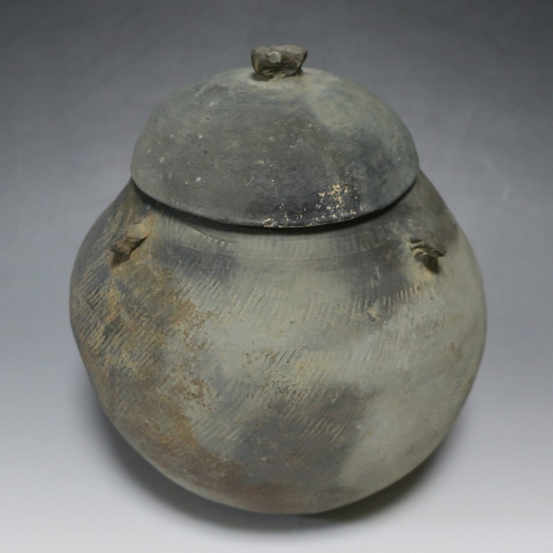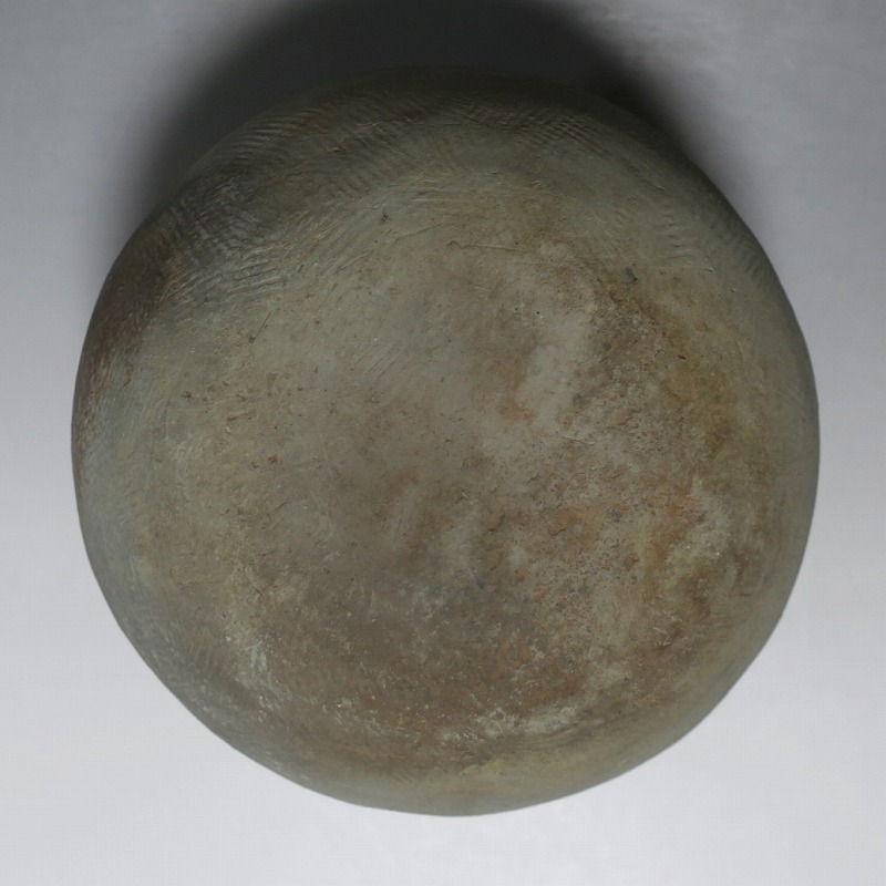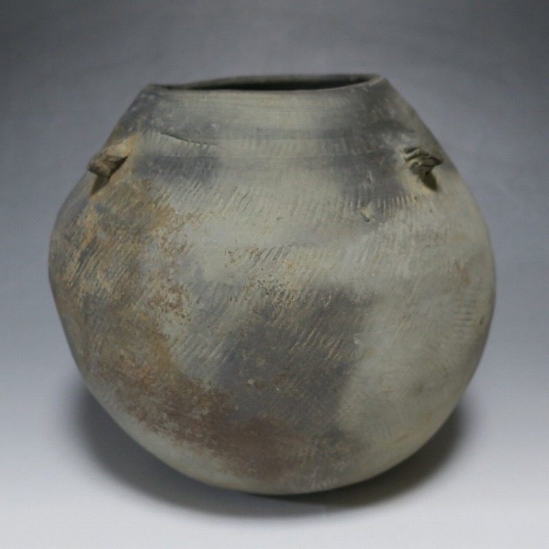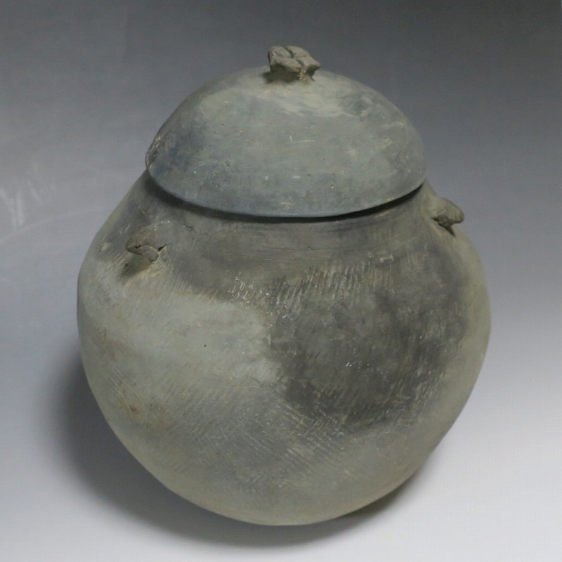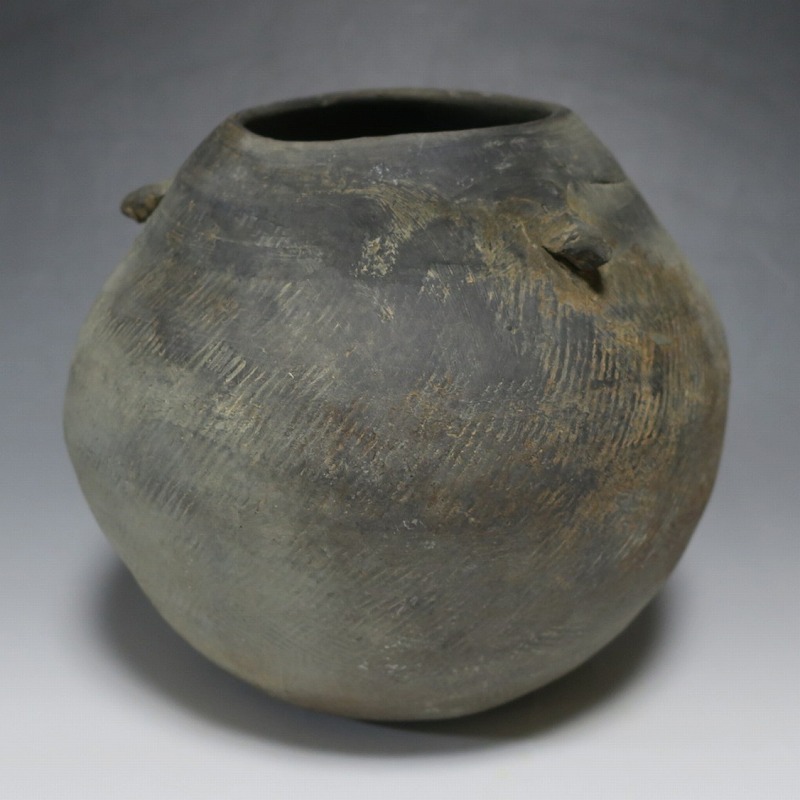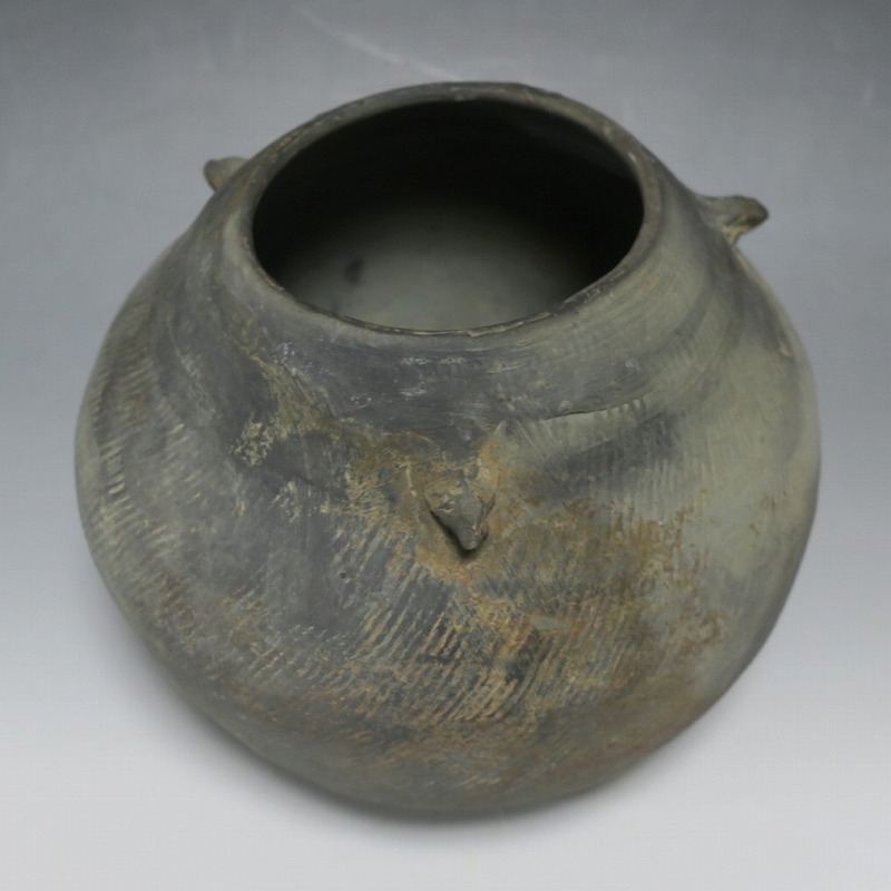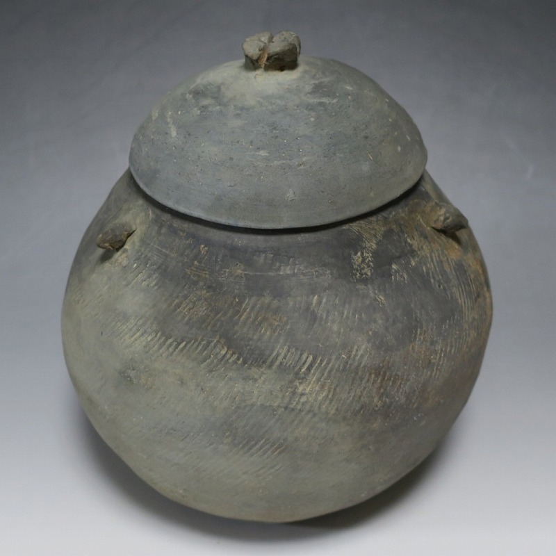 高さ 約24cm/胴径 約22cm 発掘時の土が付着し、窯傷はありますが、総じて良い状態です。花を生ける際はオトシをご利用ください。状態は写真でご確認ください。 須恵器は4世紀頃、朝鮮半島で焼き始められた硬質陶器(b器)です。耐水性に優れた焼物なので祭祀用などの祭器として使用されました。日本には4世紀後半に伝来、5世紀中頃には生産が始まります。本品は9世紀、奈良時代後期に作られた三耳壺。発掘時に同時に出土した蓋を付けたと考えられる作品です。叩き目から9世紀に作られた作品であると鑑定できます。「須恵器蓋付三耳壺 岡山県英田郡美作出土壺」の箱書きがあり、出土地がはっきりしている須恵器です。密教が興隆した時代に製作された珍しい造形の三耳壺。資料やインテリア、花器としてお楽しみください。 | ||