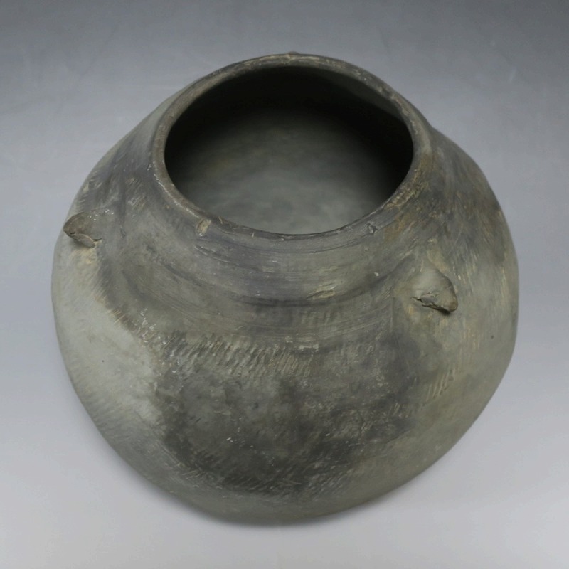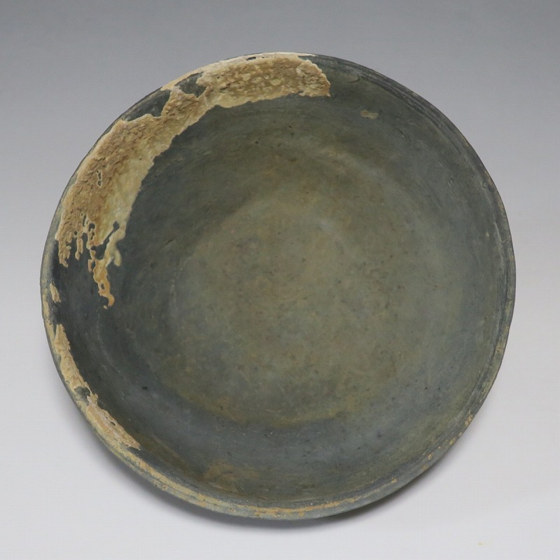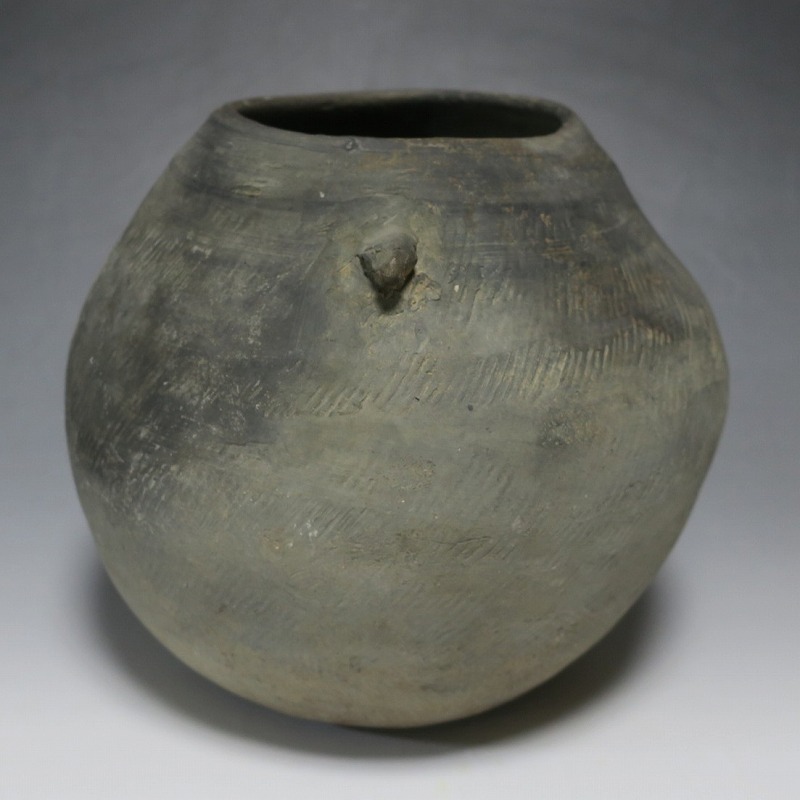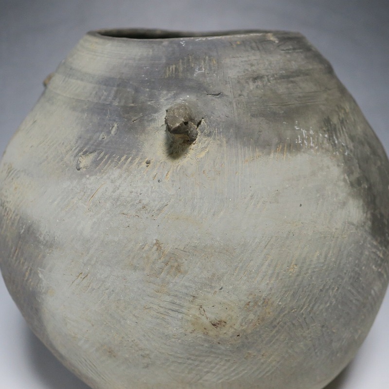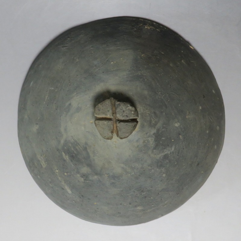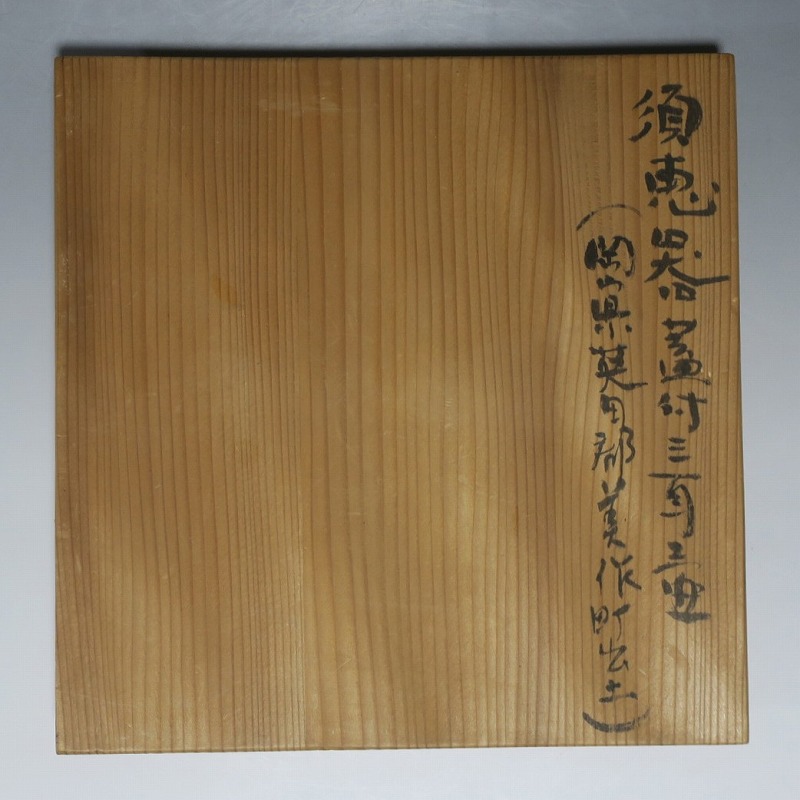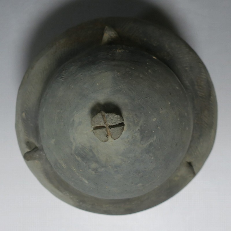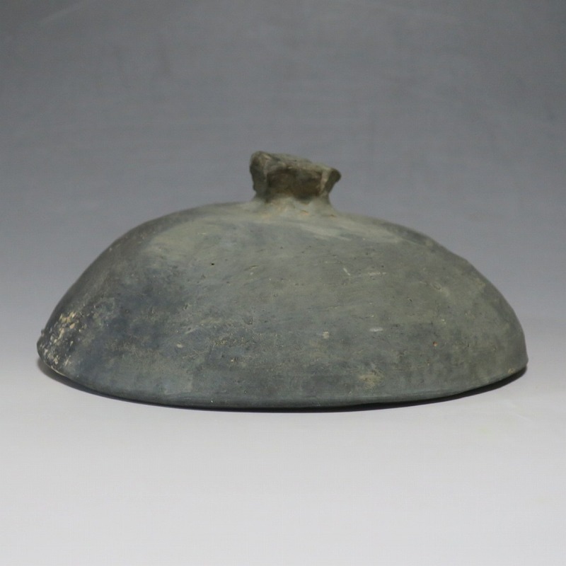 高さ 約24cm/胴径 約22cm 発掘時の土が付着し、窯傷はありますが、総じて良い状態です。花を生ける際はオトシをご利用ください。状態は写真でご確認ください。 須恵器は4世紀頃、朝鮮半島で焼き始められた硬質陶器(b器)です。耐水性に優れた焼物なので祭祀用などの祭器として使用されました。日本には4世紀後半に伝来、5世紀中頃には生産が始まります。本品は9世紀、奈良時代後期に作られた三耳壺。発掘時に同時に出土した蓋を付けたと考えられる作品です。叩き目から9世紀に作られた作品であると鑑定できます。「須恵器蓋付三耳壺 岡山県英田郡美作出土壺」の箱書きがあり、出土地がはっきりしている須恵器です。密教が興隆した時代に製作された珍しい造形の三耳壺。資料やインテリア、花器としてお楽しみください。 | ||