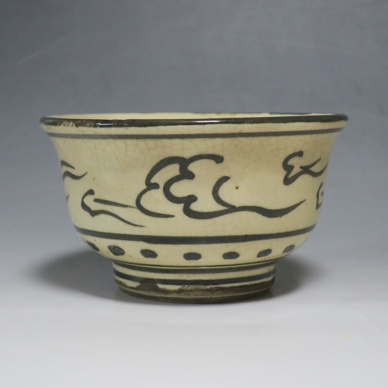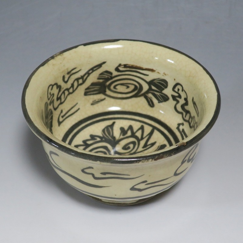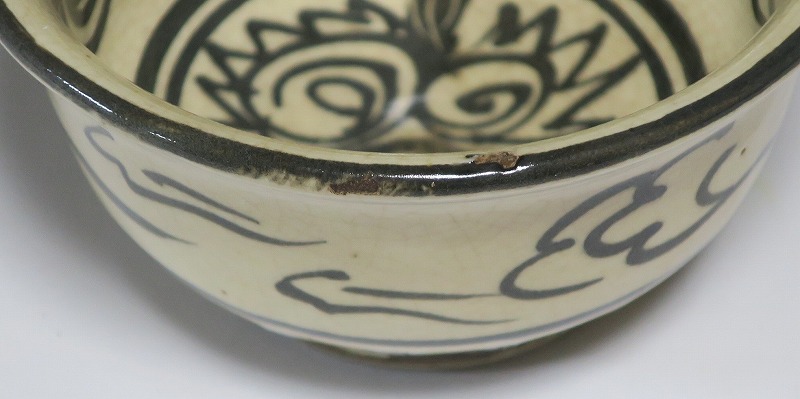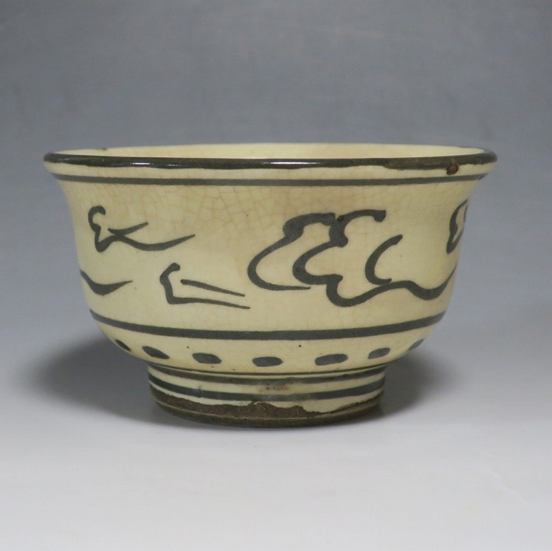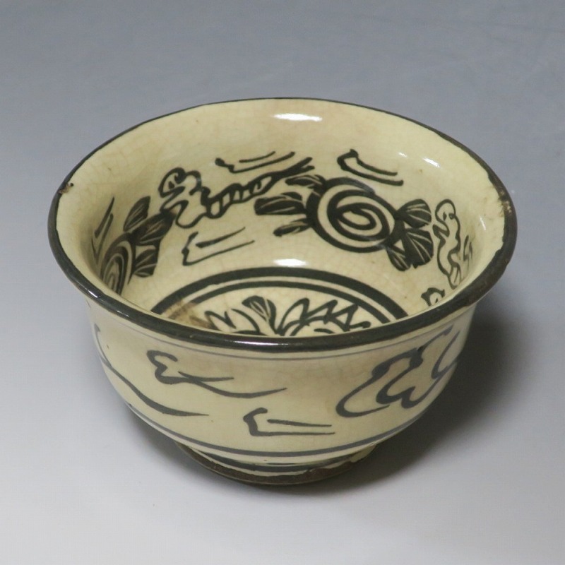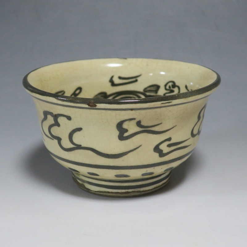 口径 約12cm/高さ 約6.8cm/高台径 約6cm 経年のシミや口辺に釉ハゲが複数ありますが、総じて良い状態です。状態は写真でご確認ください。 上神焼(かずわやき)は、江戸時代後期に鳥取県倉吉市周辺で作られた陶器の総称です。弘化年間(1844年〜1848年)に京都から招いた陶工が茶陶器の製作を始めた窯です。本品は幕末期に作られた鉄絵渦巻文茶碗。中国の磁州窯作品を模倣した作品で、かわいらしい龍の絵が描かれています。19世紀中頃に使用された伯尾山印があるカジュアルな茶碗。本品を見ると倉吉藩の文化レベルの高さに触れることができるでしょう。普段使いの茶碗としてお楽しみください。 | ||