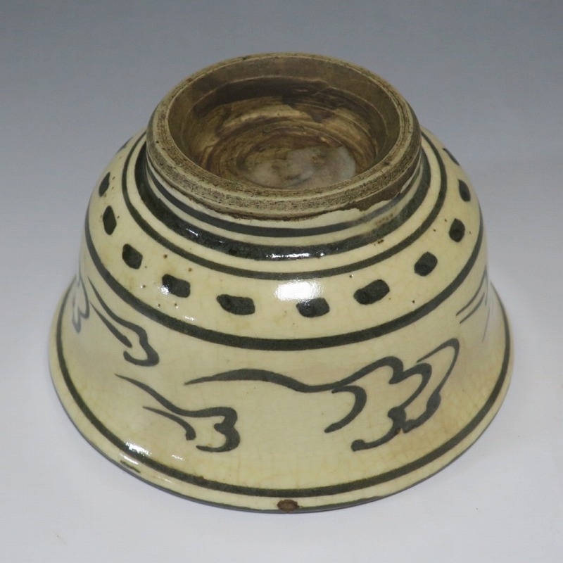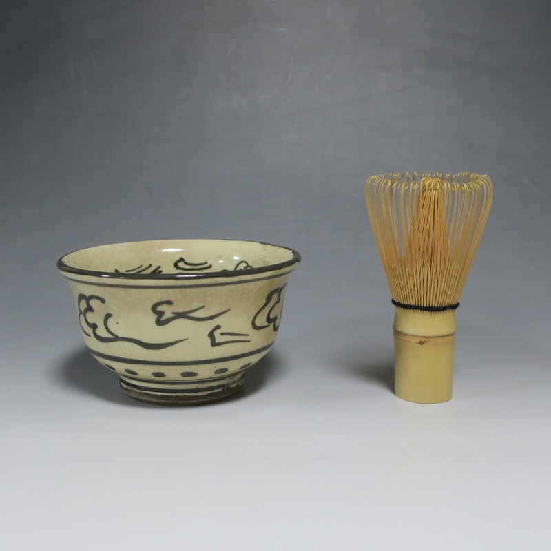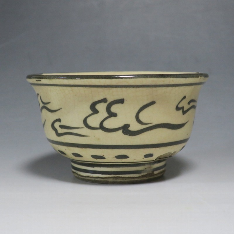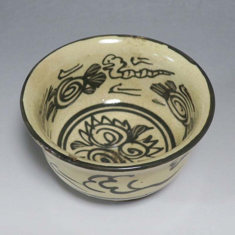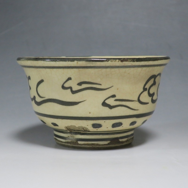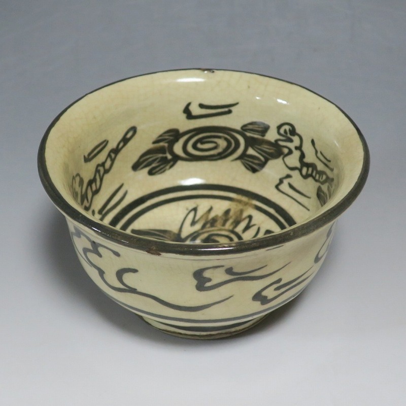 口径 約12cm/高さ 約6.8cm/高台径 約6cm 経年のシミや口辺に釉ハゲが複数ありますが、総じて良い状態です。状態は写真でご確認ください。 上神焼(かずわやき)は、江戸時代後期に鳥取県倉吉市周辺で作られた陶器の総称です。弘化年間(1844年〜1848年)に京都から招いた陶工が茶陶器の製作を始めた窯です。本品は幕末期に作られた鉄絵渦巻文茶碗。中国の磁州窯作品を模倣した作品で、かわいらしい龍の絵が描かれています。19世紀中頃に使用された伯尾山印があるカジュアルな茶碗。本品を見ると倉吉藩の文化レベルの高さに触れることができるでしょう。普段使いの茶碗としてお楽しみください。 | ||
