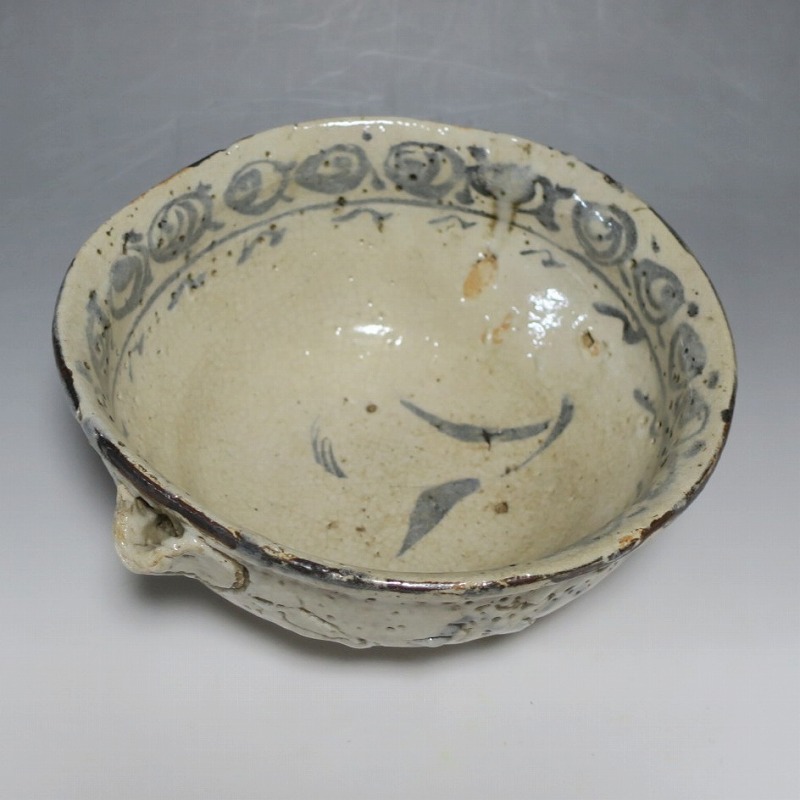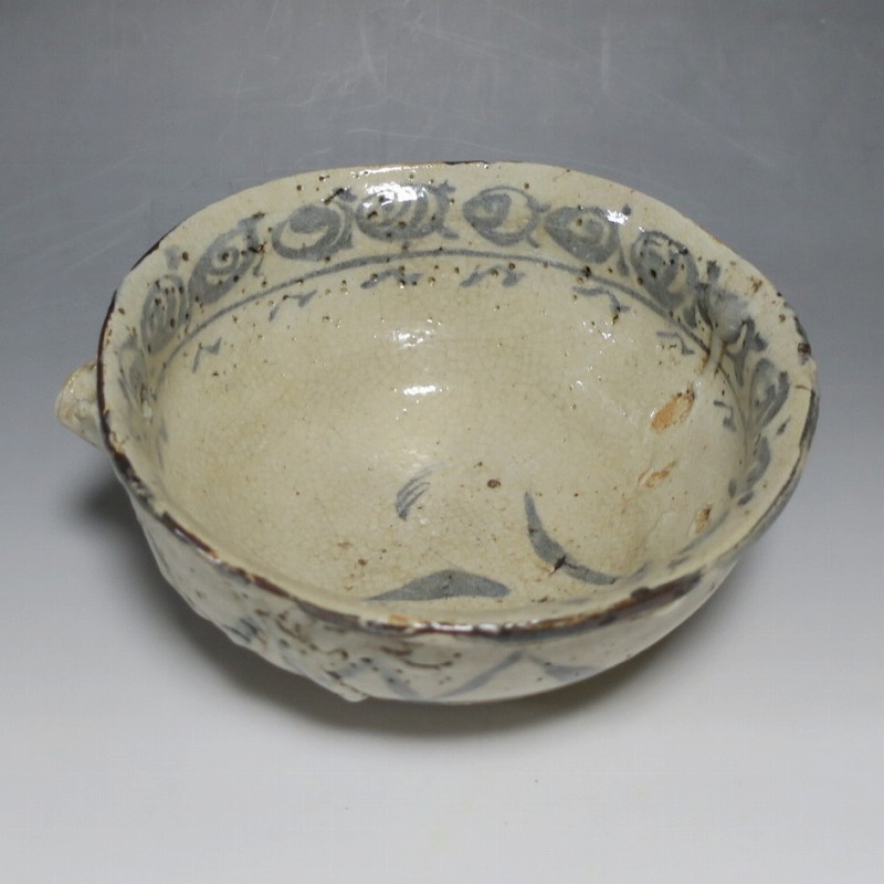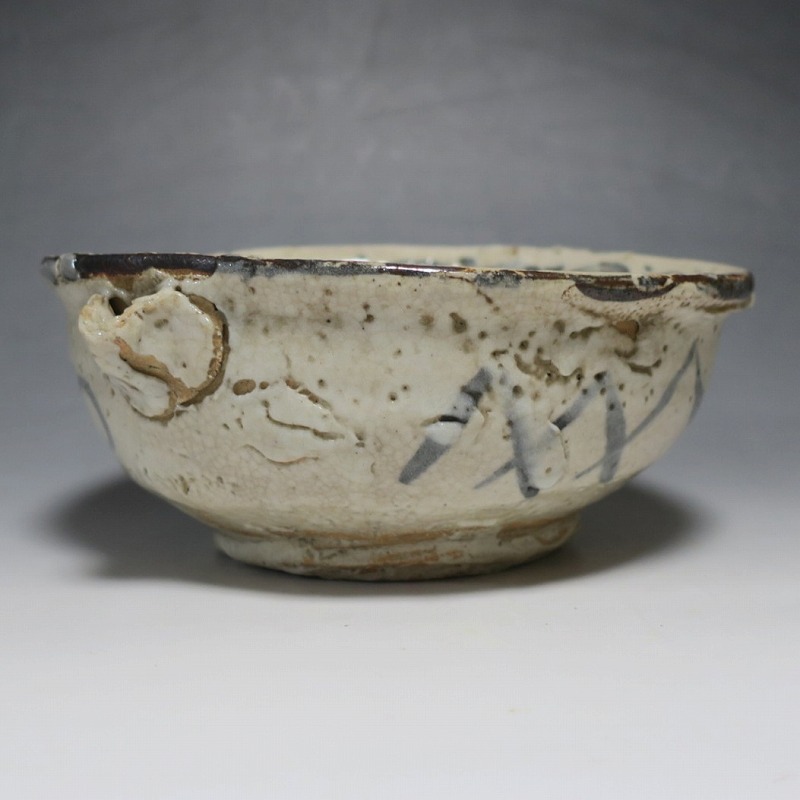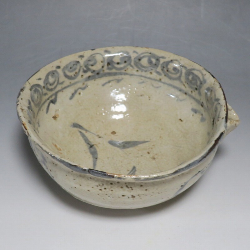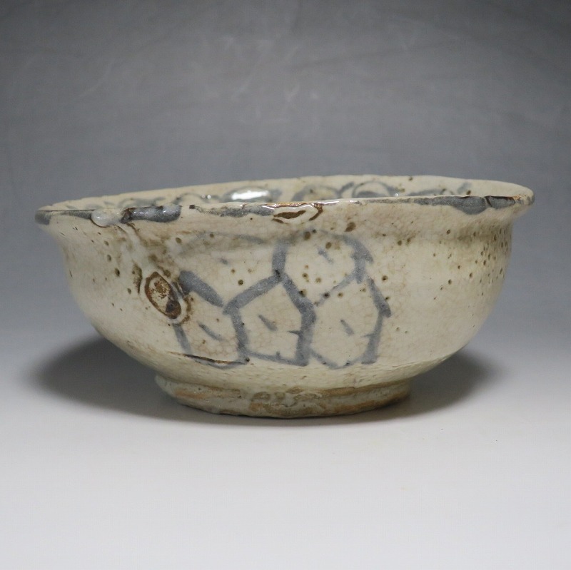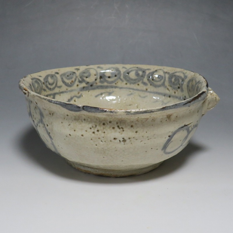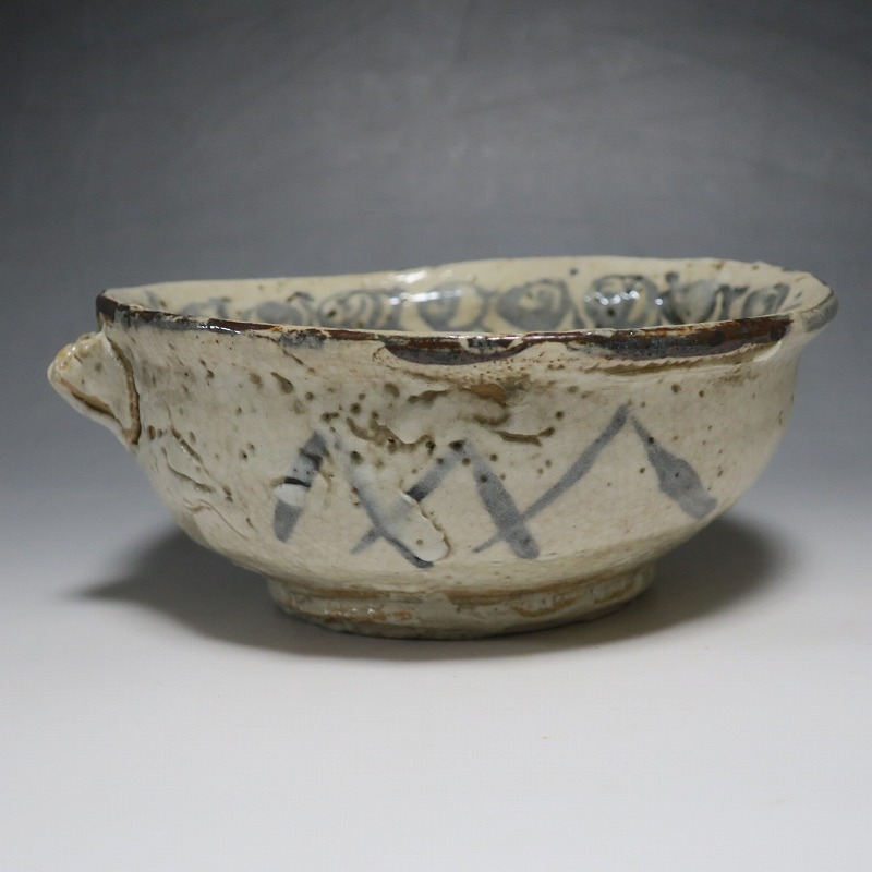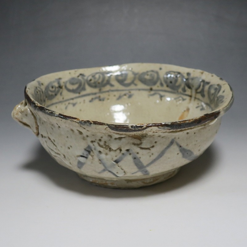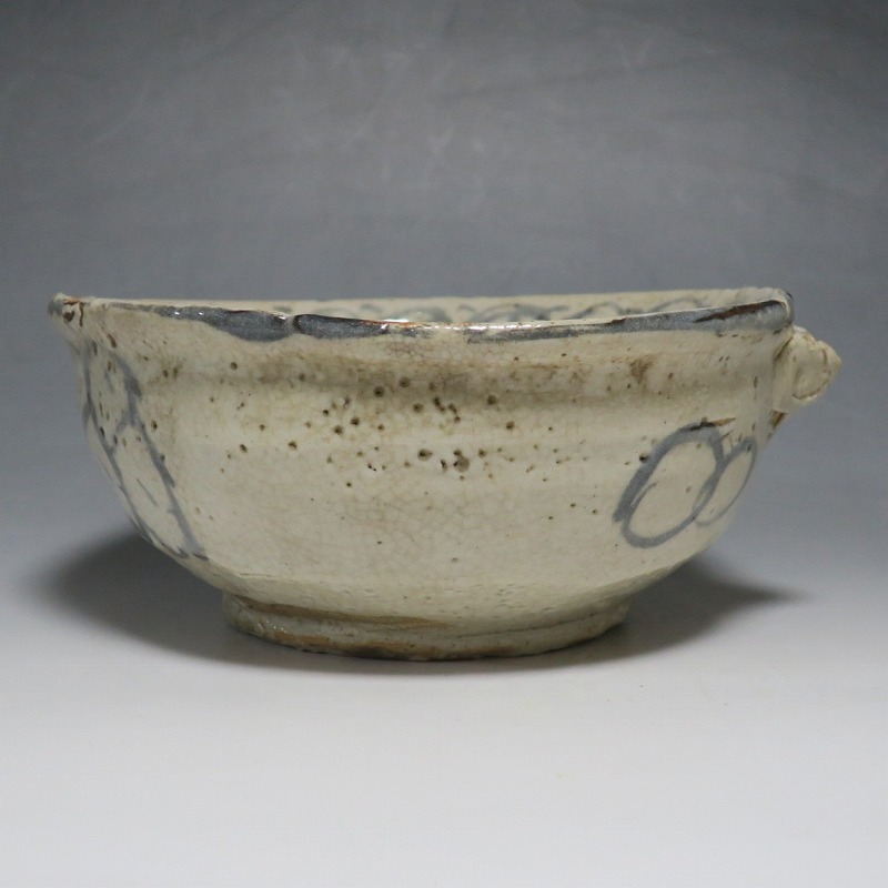 口径 約19.5cm/高さ 約8.3cm/高台径 約9.7cm 窯傷や釉ハゲはありますが、総じて良い状態です。状態は写真でご確認ください。 美濃焼は現在の岐阜県多治見市や土岐市周辺で中世初頭に須恵器を製作するために開かれた窯です。安土桃山時代に美濃焼では織部や志野、黄瀬戸など独特の意匠の作品を作り一世を風靡しました。本品は明治時代に作られた志野風の鉄絵の片口。秋草、亀甲、渦巻文が描かれた作品です。伝統的な和風の陶器の面白さを感じることのできる作品です。食器の他、果物を盛る鉢や菓子器として使用できます。 | ||