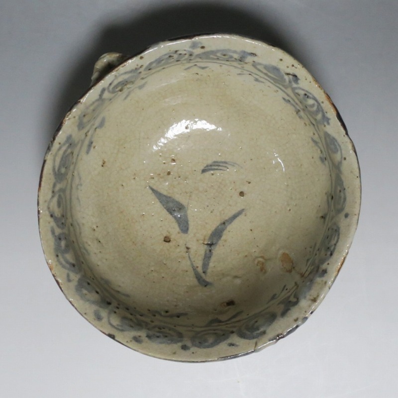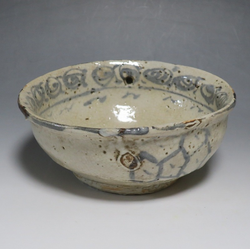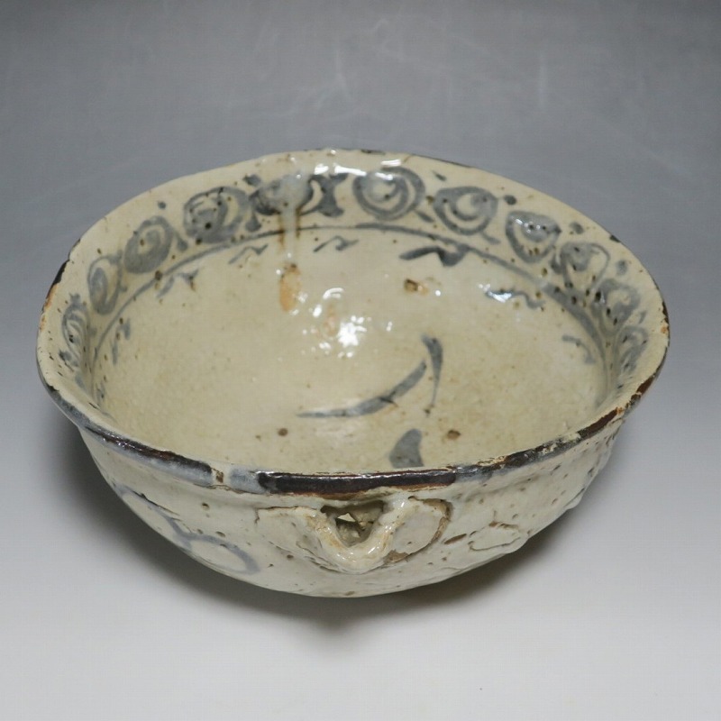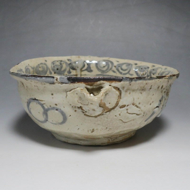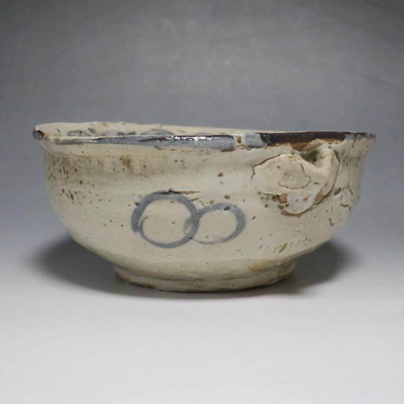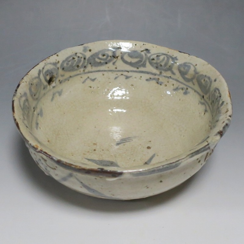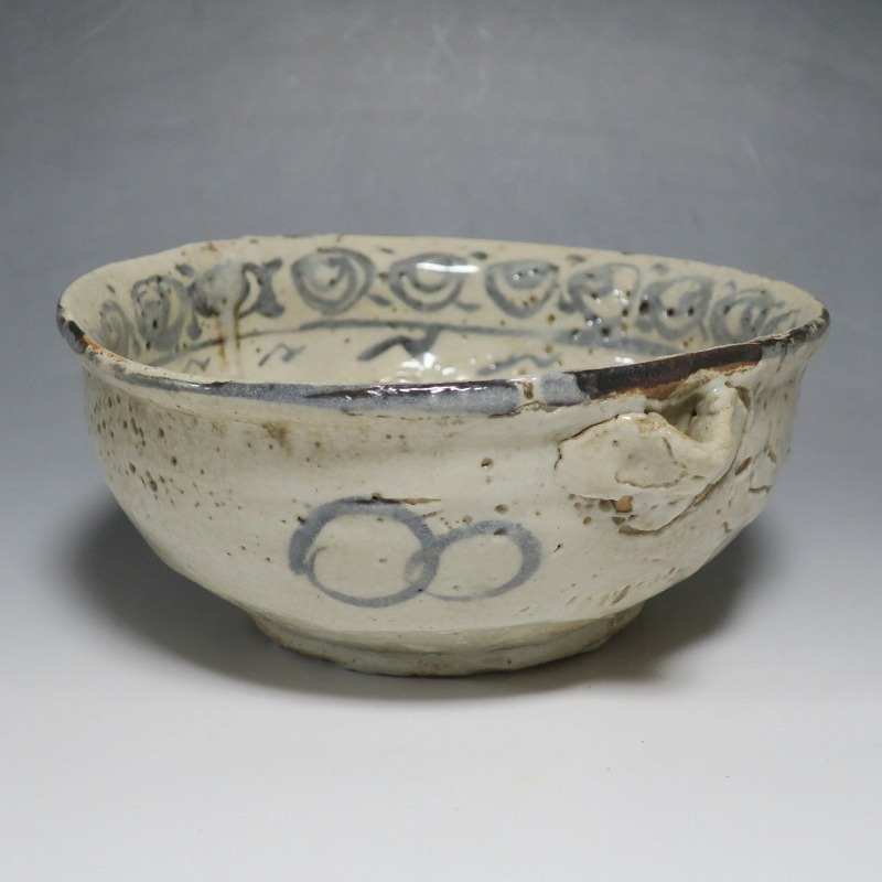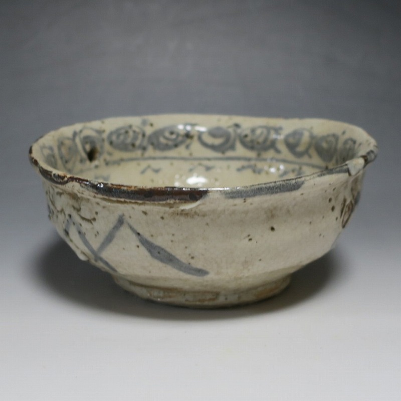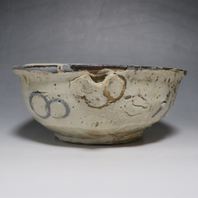 口径 約19.5cm/高さ 約8.3cm/高台径 約9.7cm 窯傷や釉ハゲはありますが、総じて良い状態です。状態は写真でご確認ください。 美濃焼は現在の岐阜県多治見市や土岐市周辺で中世初頭に須恵器を製作するために開かれた窯です。安土桃山時代に美濃焼では織部や志野、黄瀬戸など独特の意匠の作品を作り一世を風靡しました。本品は明治時代に作られた志野風の鉄絵の片口。秋草、亀甲、渦巻文が描かれた作品です。伝統的な和風の陶器の面白さを感じることのできる作品です。食器の他、果物を盛る鉢や菓子器として使用できます。 | ||