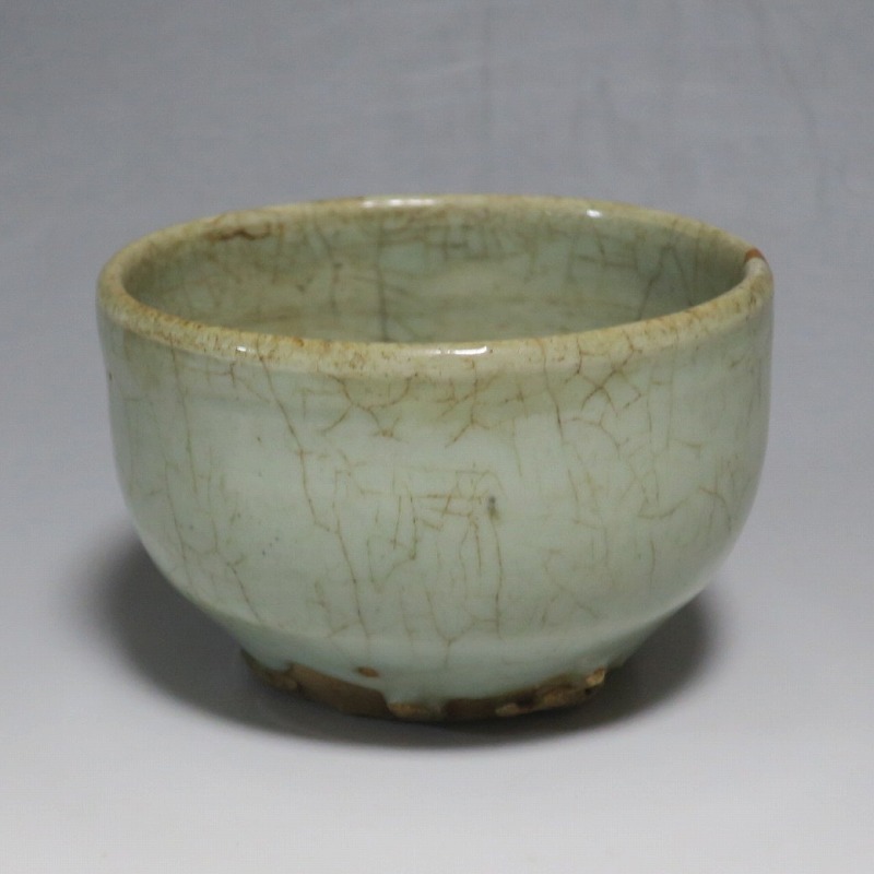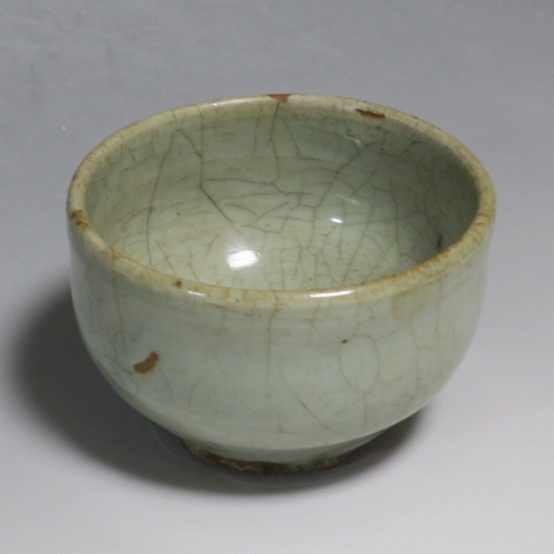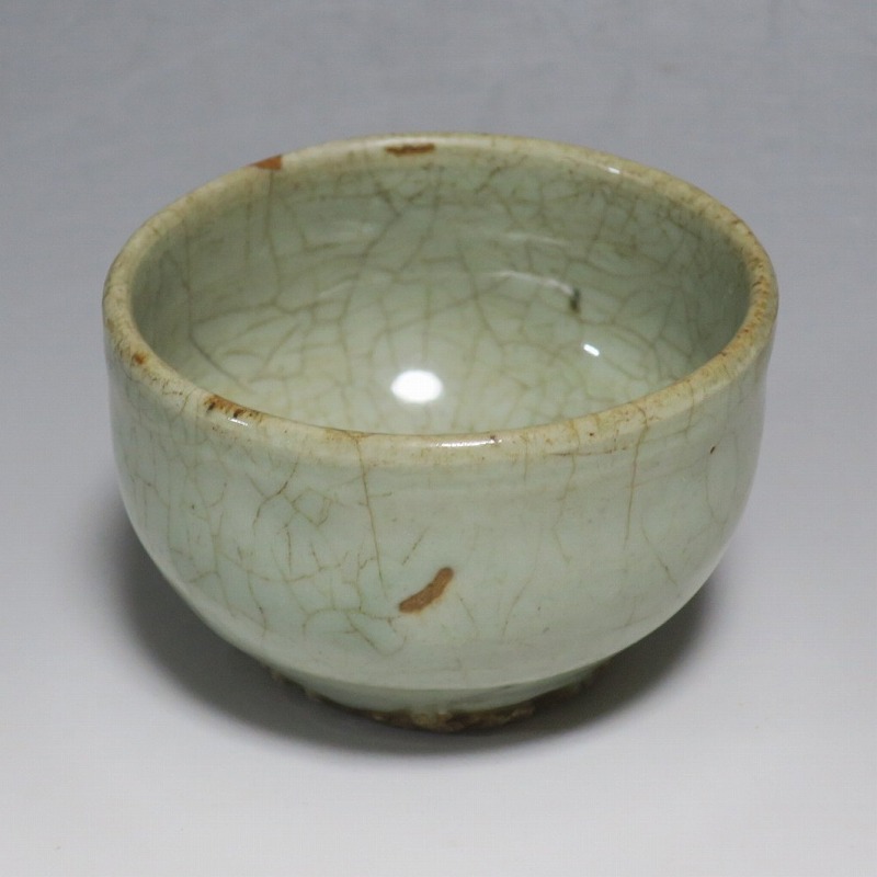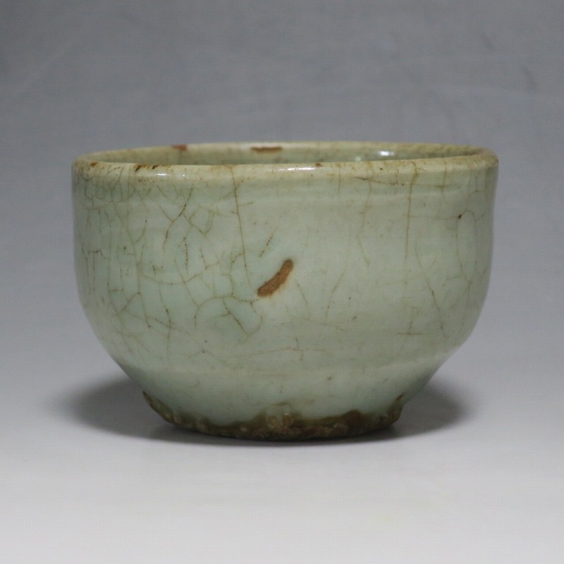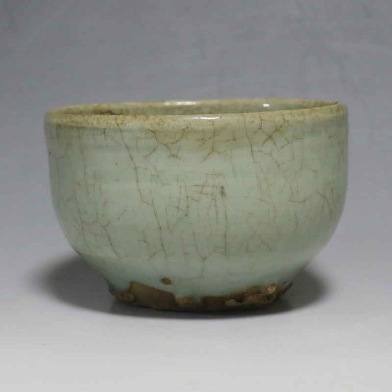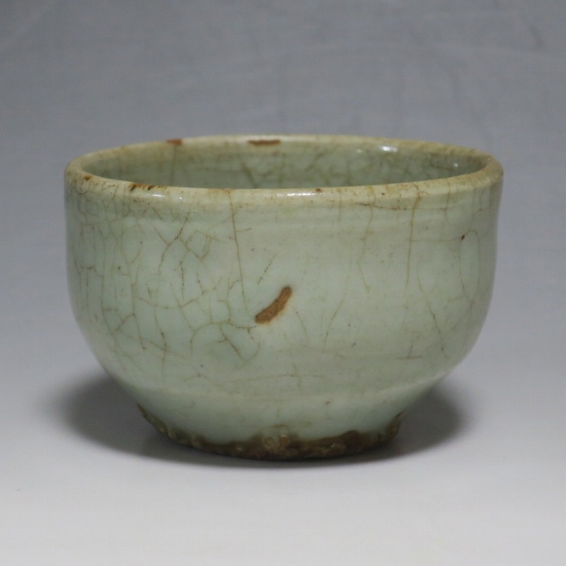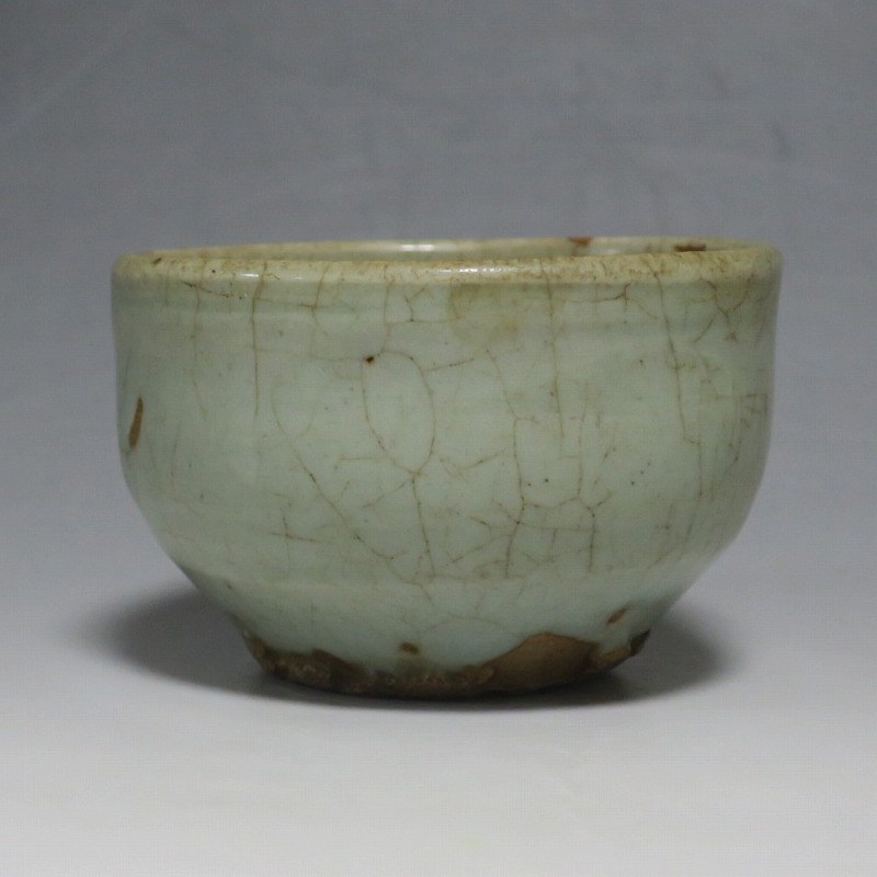 口径 約9cm/高さ 約5.8cm/高台径 約5cm 経年の汚れ、口辺に約8mmの直しと約1cmのアタリ傷があります。状態は写真でご確認ください。 高麗時代の焼物は主に青磁ですが、李朝時代になると明の影響を受けた政権が国色を白としたので、李朝全般を通して青磁作品の生産は止まってしまいました。青磁作品が復活するのは李朝後期、国が開国して以降のことです。本品は李朝陶磁には珍しい青磁の小鉢。中国の青磁作品のような色彩を持った作品です。半島北部、中国に近い窯で製作された作品であると想像できます。李朝の白磁とは異なった雰囲気のある青磁小鉢です。マッコリ用の酒器、小鉢としてご使用ください。 | ||