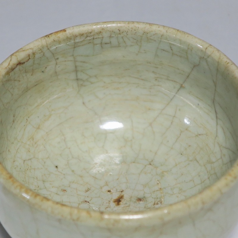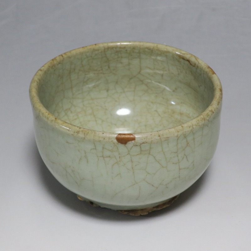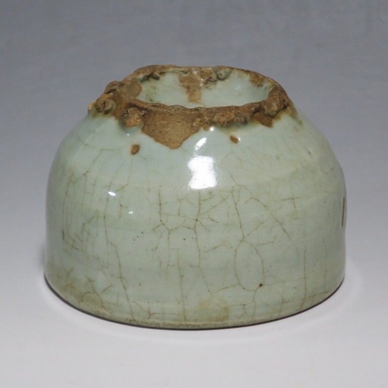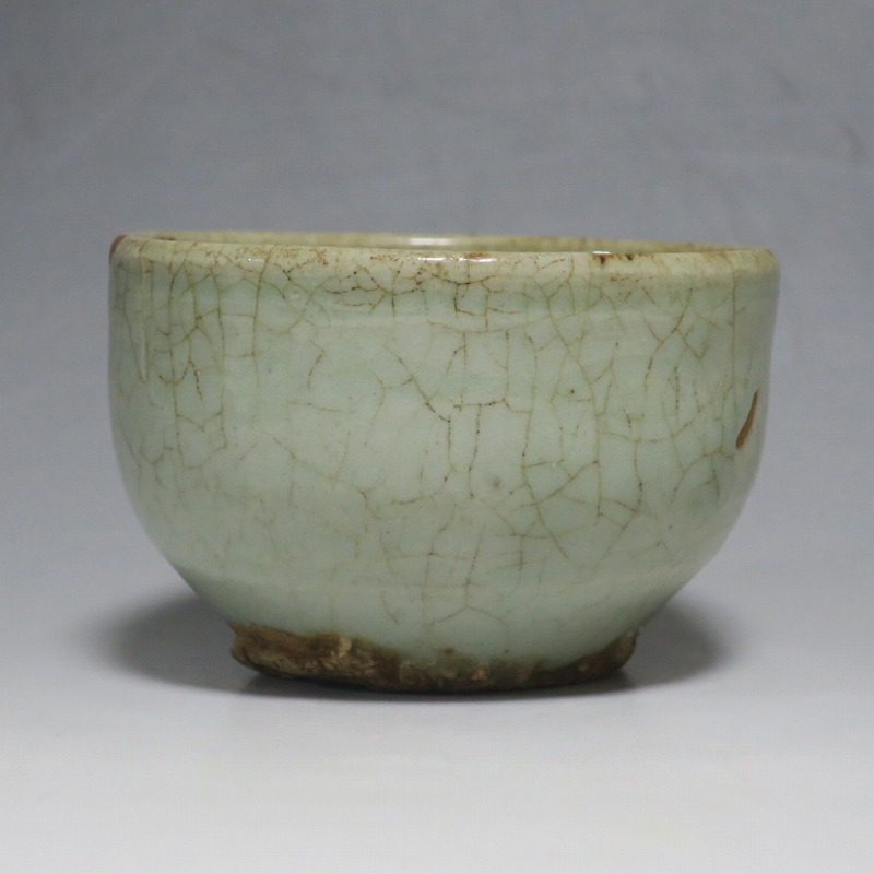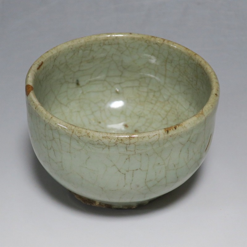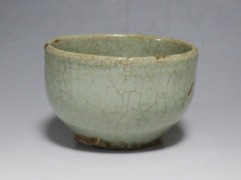 口径 約9cm/高さ 約5.8cm/高台径 約5cm 経年の汚れ、口辺に約8mmの直しと約1cmのアタリ傷があります。状態は写真でご確認ください。 高麗時代の焼物は主に青磁ですが、李朝時代になると明の影響を受けた政権が国色を白としたので、李朝全般を通して青磁作品の生産は止まってしまいました。青磁作品が復活するのは李朝後期、国が開国して以降のことです。本品は李朝陶磁には珍しい青磁の小鉢。中国の青磁作品のような色彩を持った作品です。半島北部、中国に近い窯で製作された作品であると想像できます。李朝の白磁とは異なった雰囲気のある青磁小鉢です。マッコリ用の酒器、小鉢としてご使用ください。 | ||