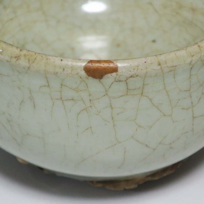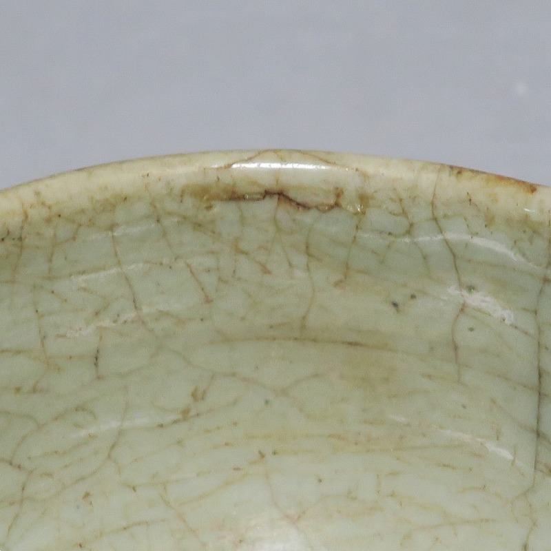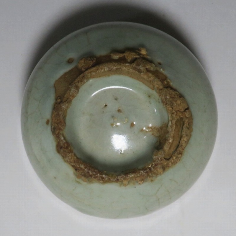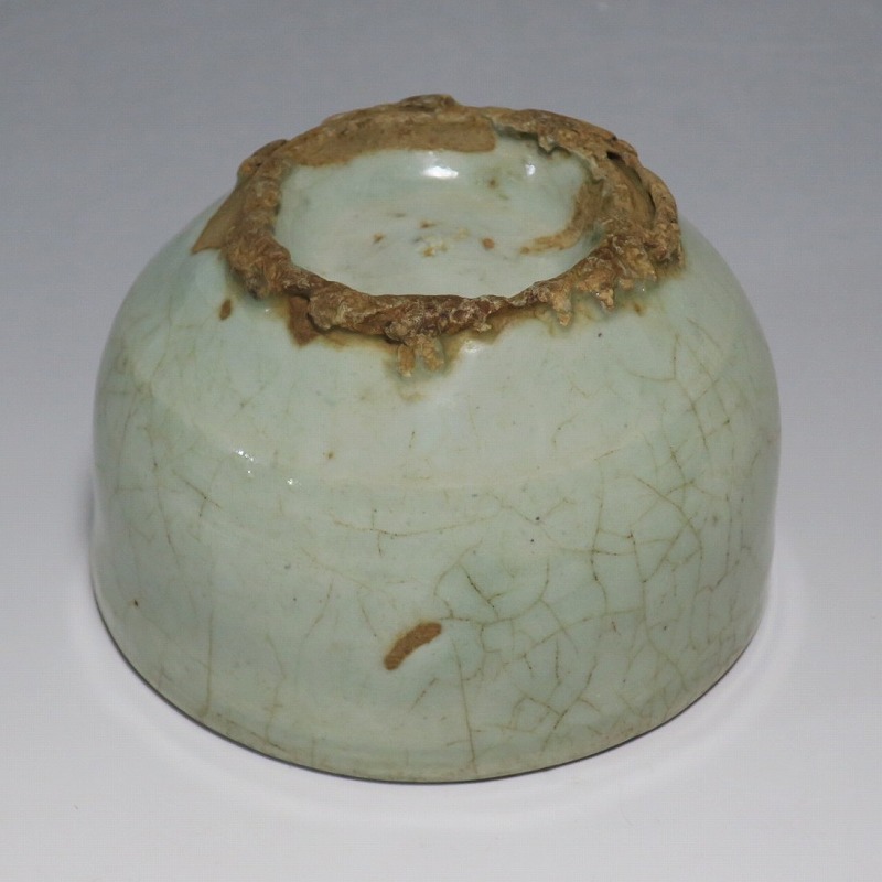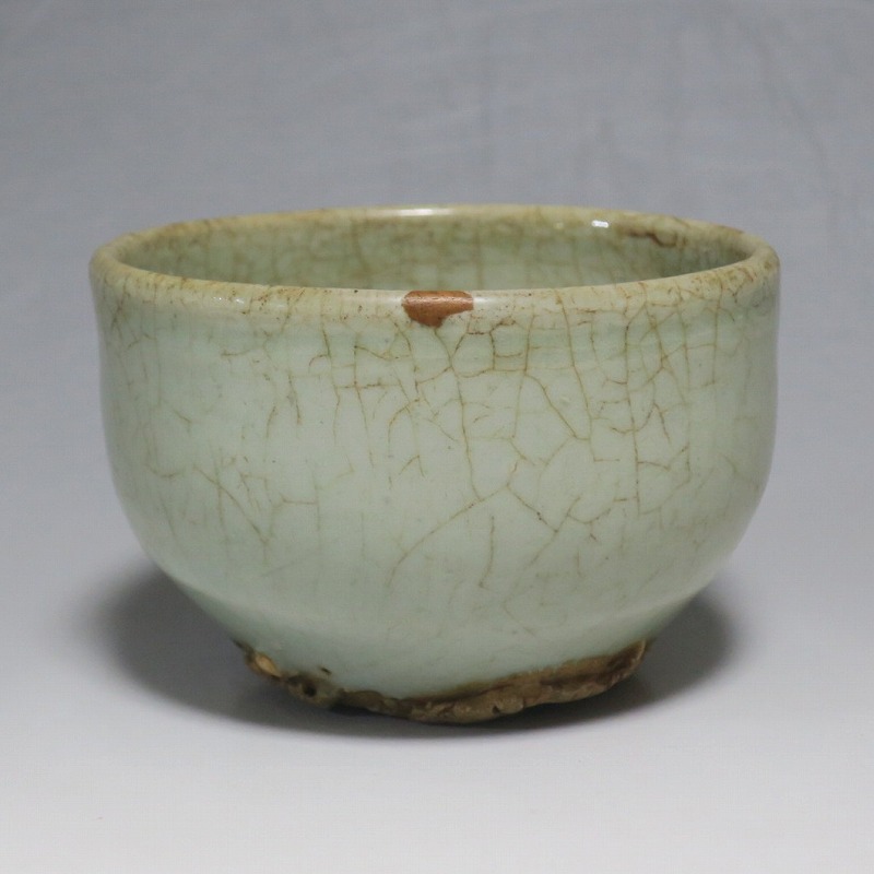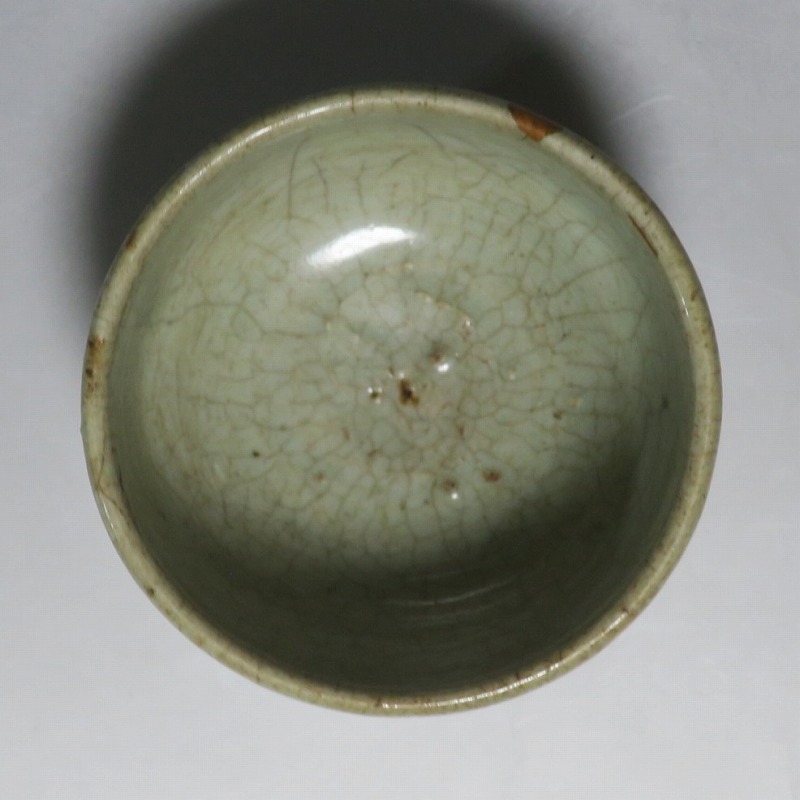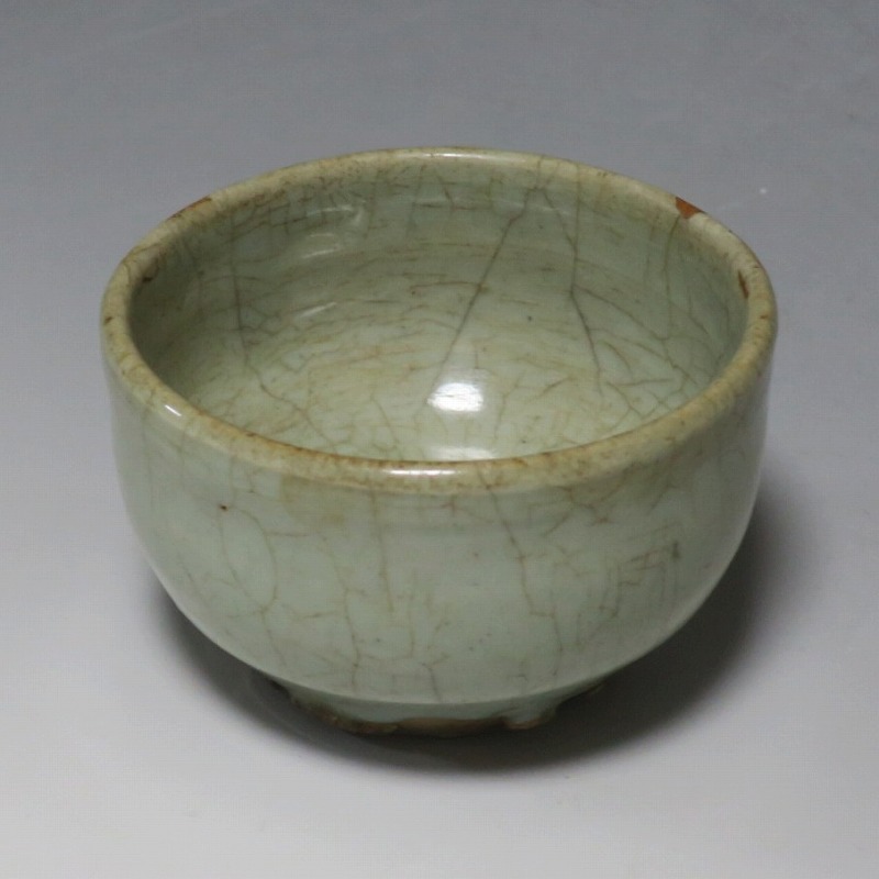 口径 約9cm/高さ 約5.8cm/高台径 約5cm 経年の汚れ、口辺に約8mmの直しと約1cmのアタリ傷があります。状態は写真でご確認ください。 高麗時代の焼物は主に青磁ですが、李朝時代になると明の影響を受けた政権が国色を白としたので、李朝全般を通して青磁作品の生産は止まってしまいました。青磁作品が復活するのは李朝後期、国が開国して以降のことです。本品は李朝陶磁には珍しい青磁の小鉢。中国の青磁作品のような色彩を持った作品です。半島北部、中国に近い窯で製作された作品であると想像できます。李朝の白磁とは異なった雰囲気のある青磁小鉢です。マッコリ用の酒器、小鉢としてご使用ください。 | ||