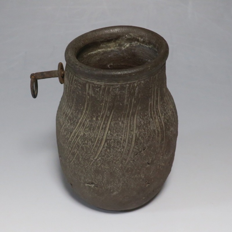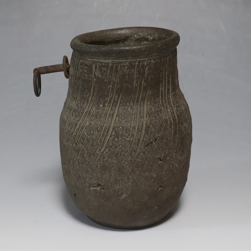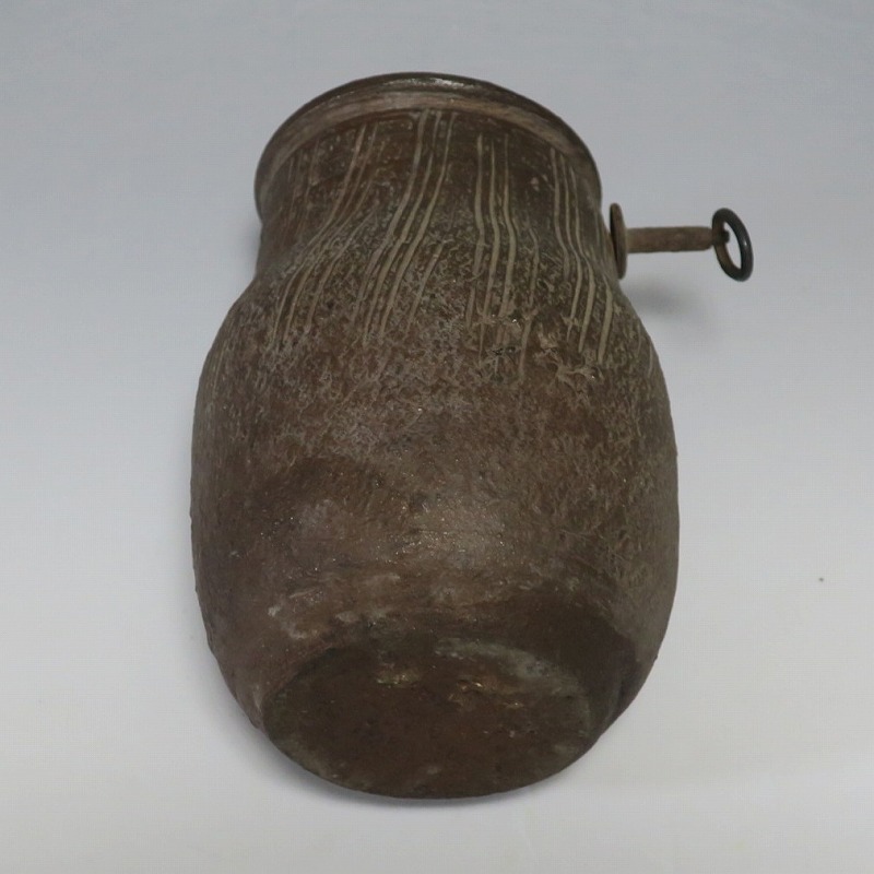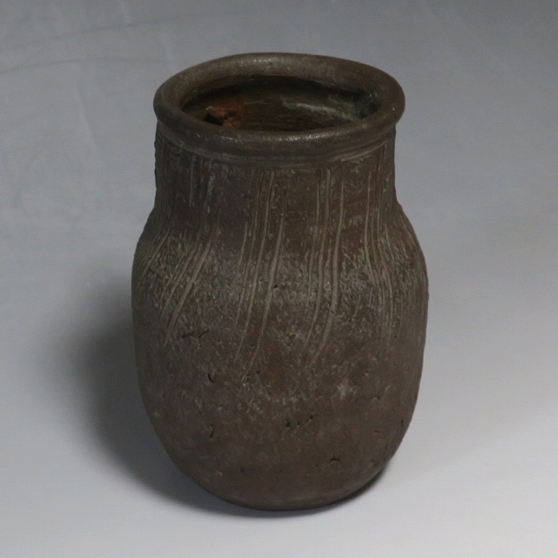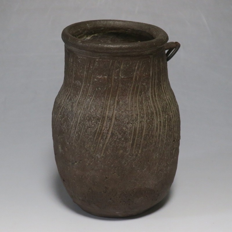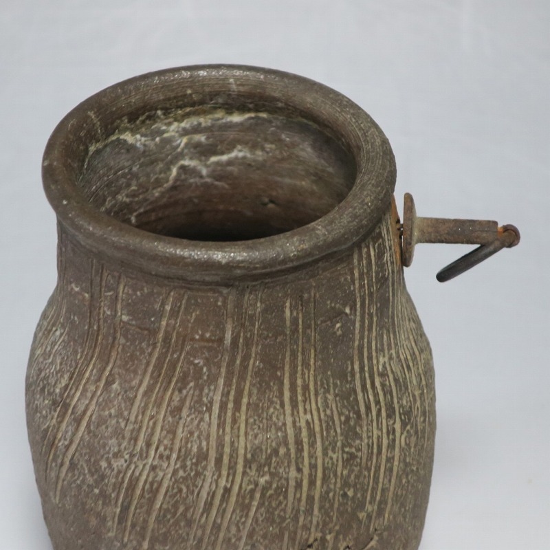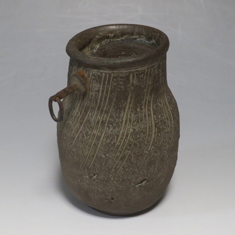 (江戸時代後期 19世紀前半) 商品番号 4267 高さ 約13cm/胴径 約9cm/口径 約7.2cm 窯傷や水垢、金具に経年の錆がありますが、総じて良い状態です。状態は写真でご確認ください。 壺屋は1682年の開窯以来、沖縄陶器の中心として活動している窯です。昭和時代初期、民芸運動で注目されて以来、その知名度が上がりました。本品は無釉薬のアラヤチ(荒焼)で製作された掛け花入れ。調味料入れなどに使用されていた小壺を掛け花に仕立てた作品です。胴部のひっかき文が個性となっている珍しい形の掛け花入れ。侘びた感じの作品です。花器としてお楽しみください。 | ||