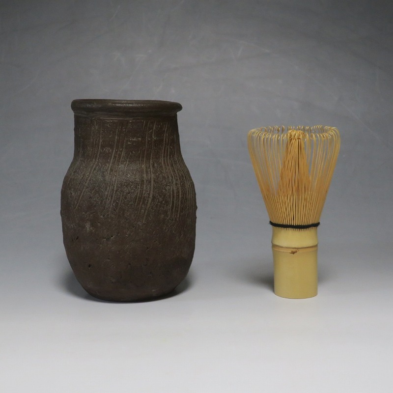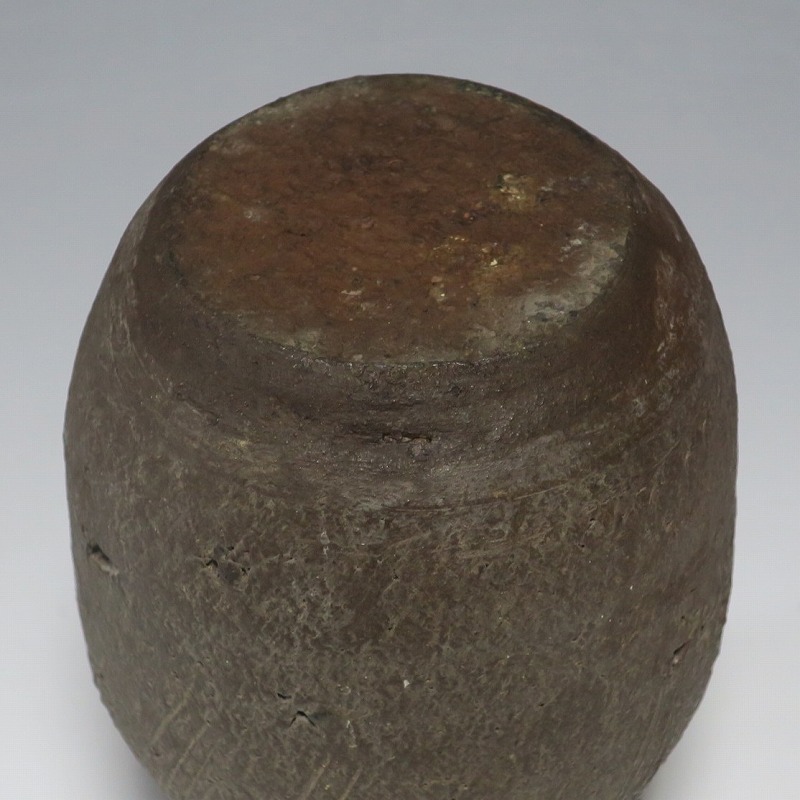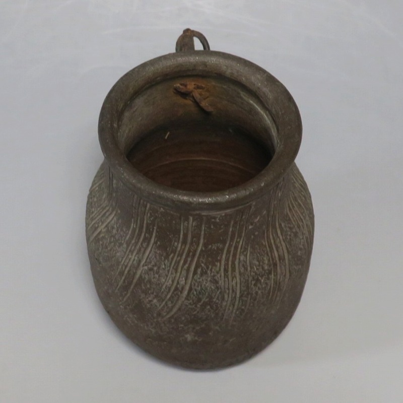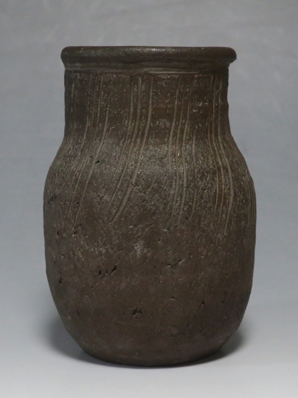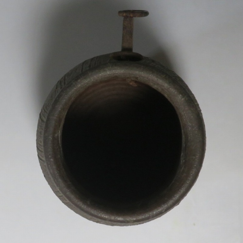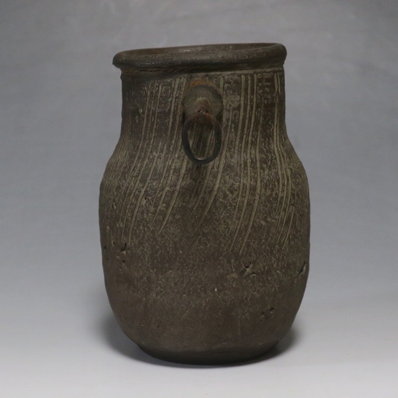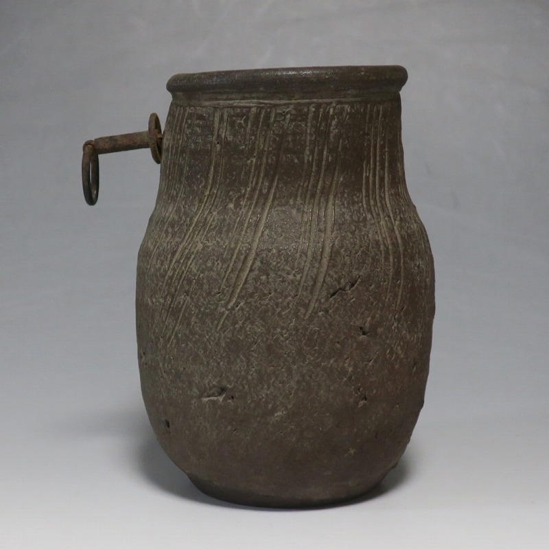 (江戸時代後期 19世紀前半) 商品番号 4267 高さ 約13cm/胴径 約9cm/口径 約7.2cm 窯傷や水垢、金具に経年の錆がありますが、総じて良い状態です。状態は写真でご確認ください。 壺屋は1682年の開窯以来、沖縄陶器の中心として活動している窯です。昭和時代初期、民芸運動で注目されて以来、その知名度が上がりました。本品は無釉薬のアラヤチ(荒焼)で製作された掛け花入れ。調味料入れなどに使用されていた小壺を掛け花に仕立てた作品です。胴部のひっかき文が個性となっている珍しい形の掛け花入れ。侘びた感じの作品です。花器としてお楽しみください。 | ||