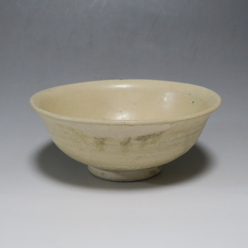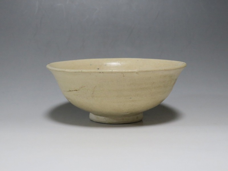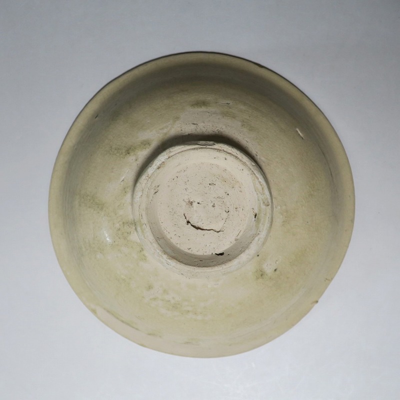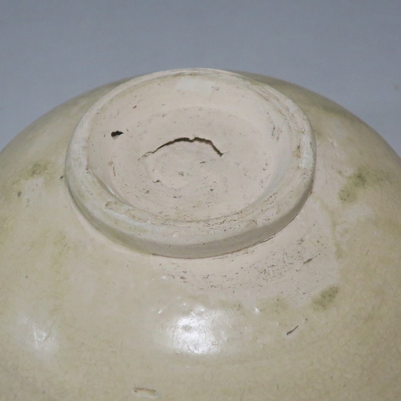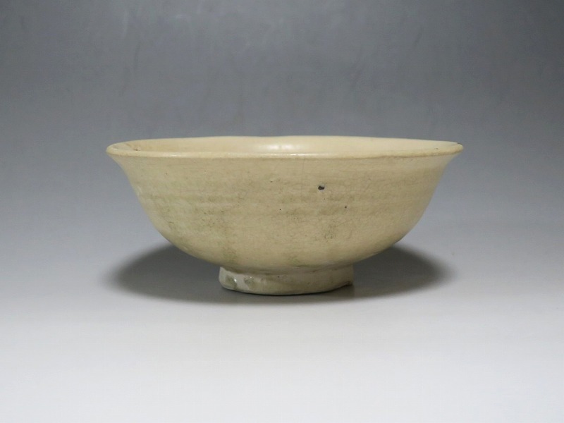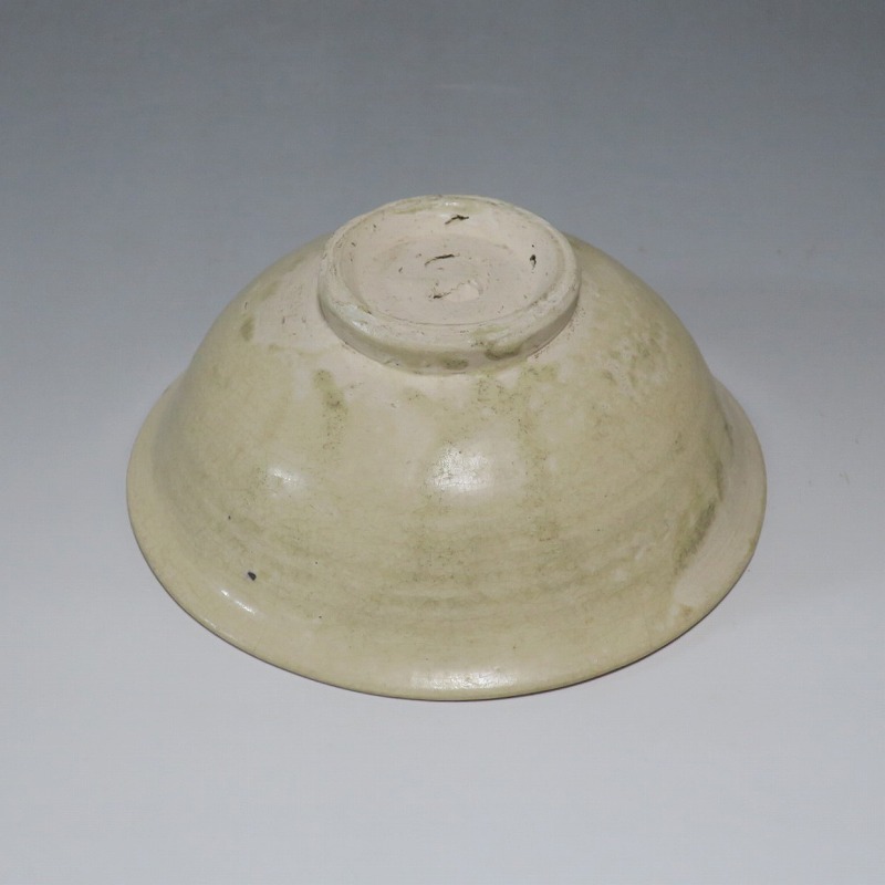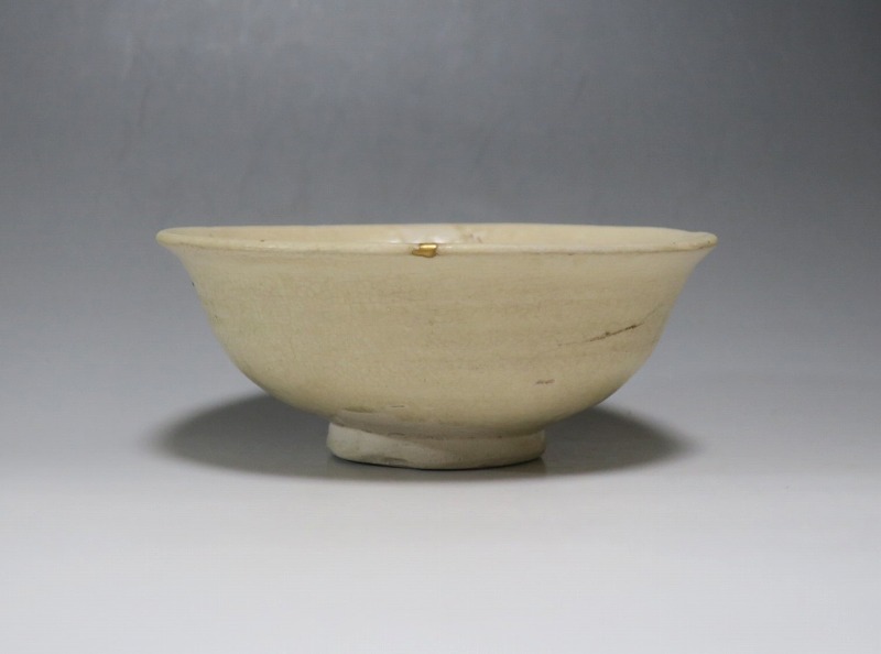 (タイ 15世紀) 商品番号 3176 口径 約13.9cm/高さ 約5.7cm/高台径 約5.5cm 口辺に約5mmの金直し、窯傷や釉ハゲがあります。状態は写真でご確認ください。 スンコロク(宋胡録)は15世紀前後、タイ中北部のスワンカロークで作られた鉄絵、黒釉、青磁などの古陶磁を総称した呼び名です。桃山時代から江戸時代初期にかけて日本に輸入され、香合や茶道具として使用されました。本品は15世紀に作られた白磁の茶碗。同時代、明では白磁が流行していたので、その影響を受けて製作されたのでしょう。日本の御深井焼の起源ともいえる美しい釉薬(簿妙に緑釉かがっています)が掛かっています。象牙色の温かみのある白釉がやわらかい感じのする茶碗。薄茶器、食器としてお楽しみください。 | ||
