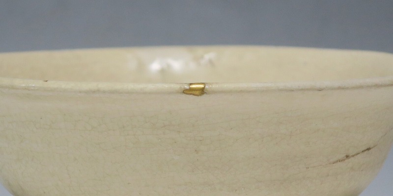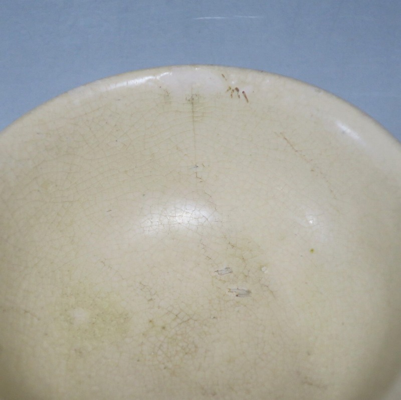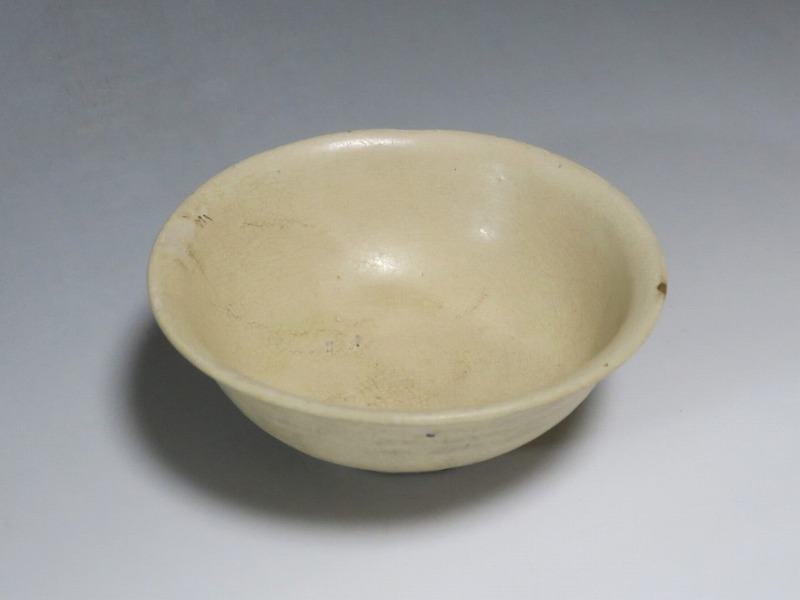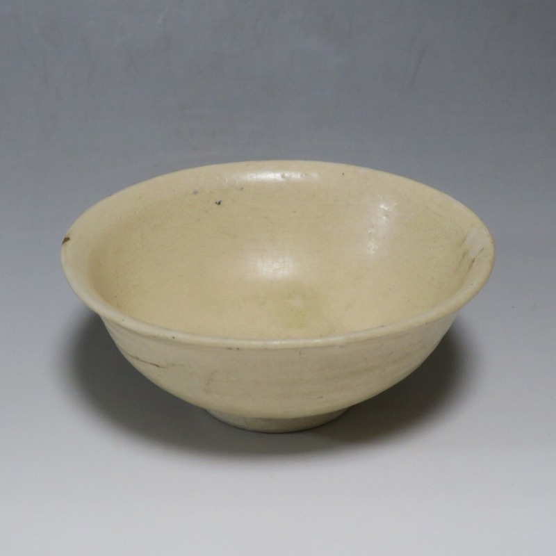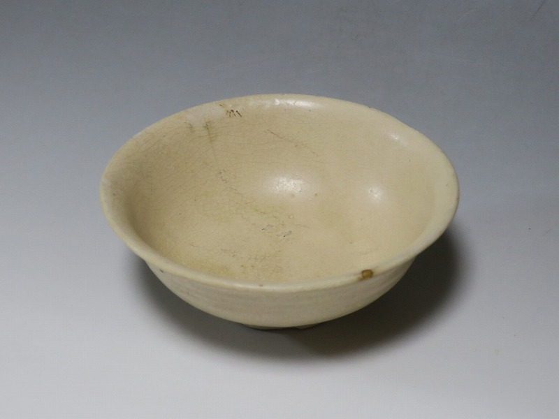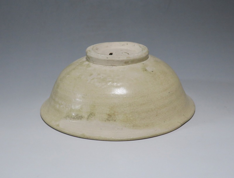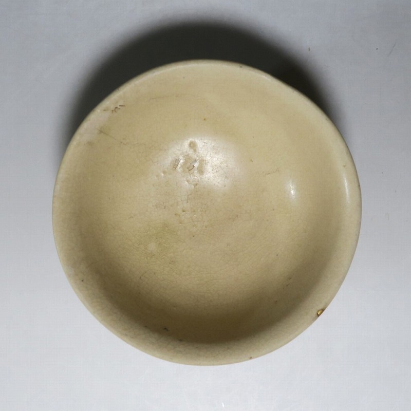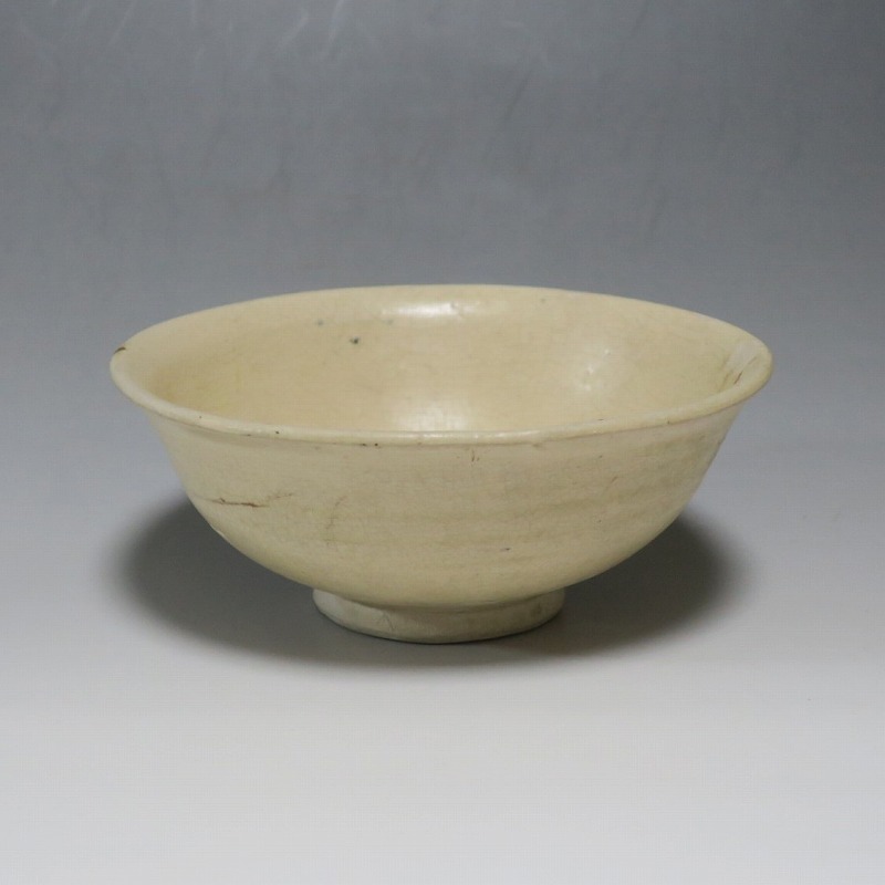 (タイ 15世紀) 商品番号 3176 口径 約13.9cm/高さ 約5.7cm/高台径 約5.5cm 口辺に約5mmの金直し、窯傷や釉ハゲがあります。状態は写真でご確認ください。 スンコロク(宋胡録)は15世紀前後、タイ中北部のスワンカロークで作られた鉄絵、黒釉、青磁などの古陶磁を総称した呼び名です。桃山時代から江戸時代初期にかけて日本に輸入され、香合や茶道具として使用されました。本品は15世紀に作られた白磁の茶碗。同時代、明では白磁が流行していたので、その影響を受けて製作されたのでしょう。日本の御深井焼の起源ともいえる美しい釉薬(簿妙に緑釉かがっています)が掛かっています。象牙色の温かみのある白釉がやわらかい感じのする茶碗。薄茶器、食器としてお楽しみください。 | ||