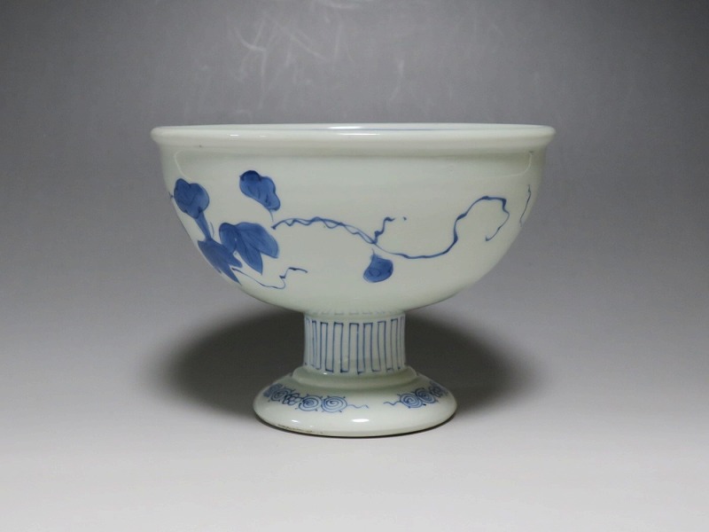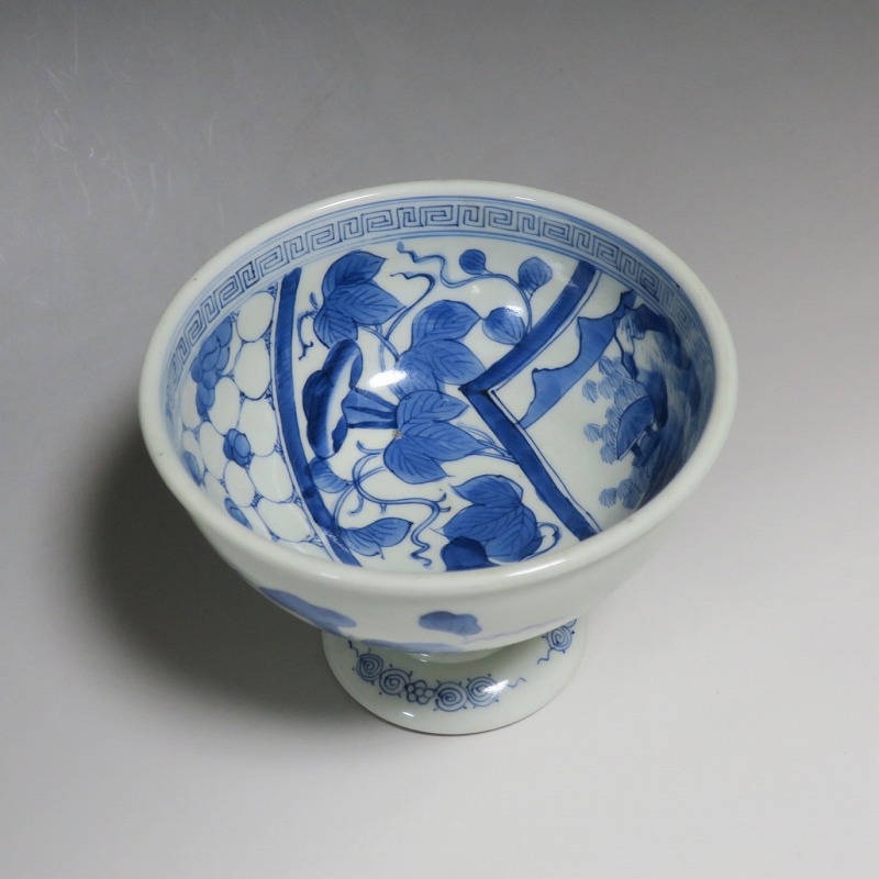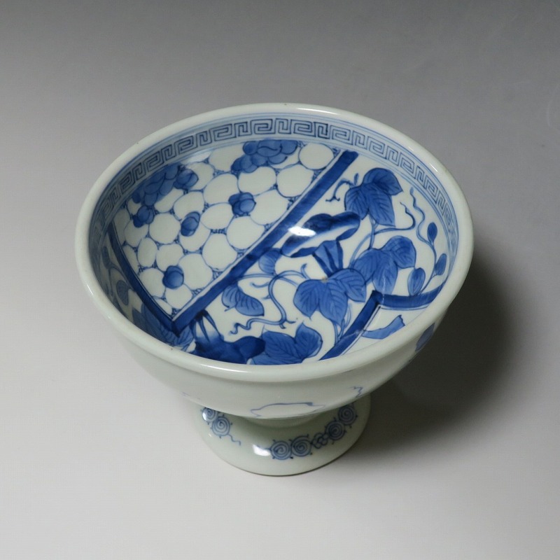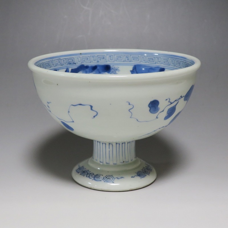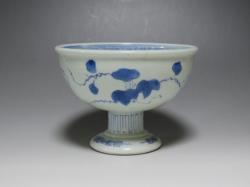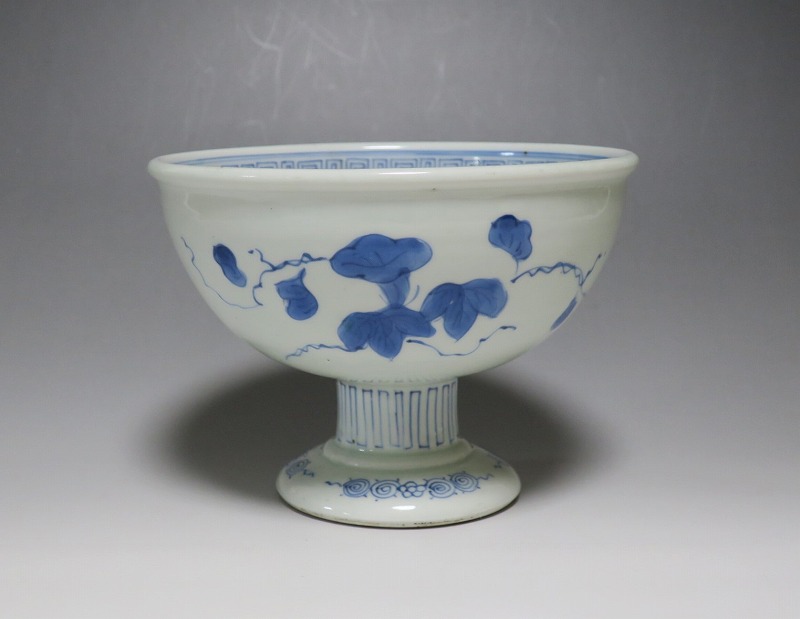 (江戸時代後期 19世紀前半) 商品番号 3284 口径 約16.3cm/高さ 約11.7cm/高台径 約8.5cm 高台に窯傷はありますが、完品です。状態は写真でご確認ください。 亀山焼は長崎奉行の支援で1804年、長崎に開かれた窯です。陶土は天草土、呉須は奉行所の援助もあって唐船舶載の最高のものを使用、中国文化の影響を受けて異国情緒のある作品を多数、作っています。本品は見込みに朝顔、氷烈 山水、外側に朝顔のデザインを施した染付の杯洗。当時、日本では朝顔の栽培が流行していました。涼感を出すために氷烈文をデザインしています。食器として使用すると季節を感じることができるでしょう。 | ||