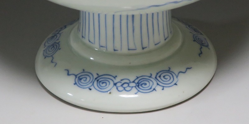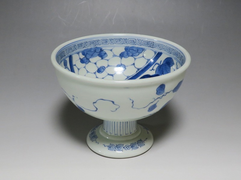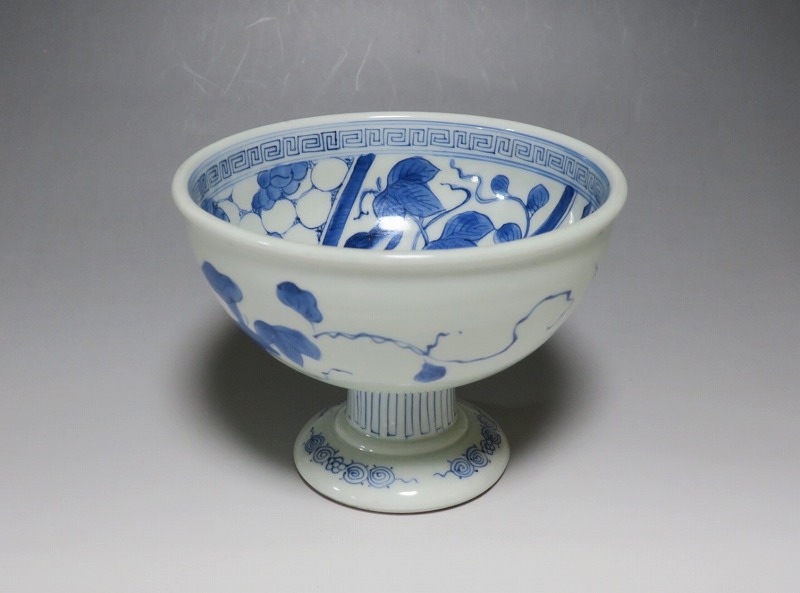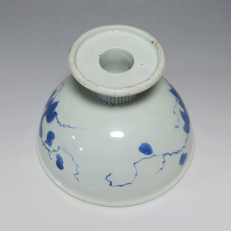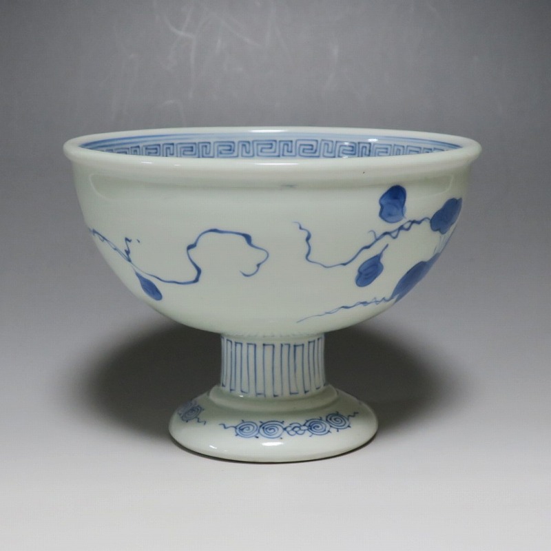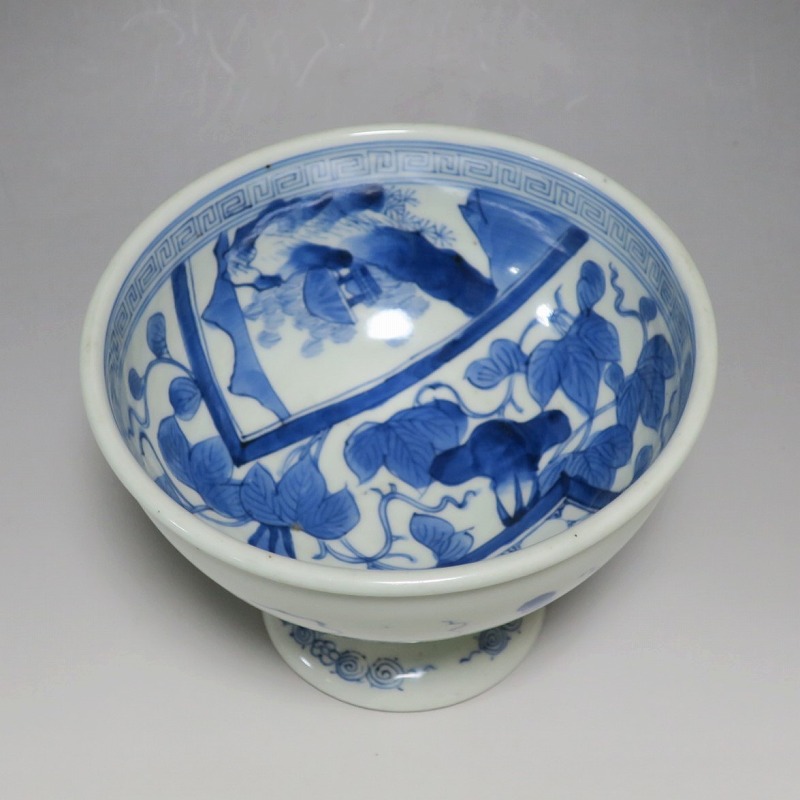 (江戸時代後期 19世紀前半) 商品番号 3284 口径 約16.3cm/高さ 約11.7cm/高台径 約8.5cm 高台に窯傷はありますが、完品です。状態は写真でご確認ください。 亀山焼は長崎奉行の支援で1804年、長崎に開かれた窯です。陶土は天草土、呉須は奉行所の援助もあって唐船舶載の最高のものを使用、中国文化の影響を受けて異国情緒のある作品を多数、作っています。本品は見込みに朝顔、氷烈 山水、外側に朝顔のデザインを施した染付の杯洗。当時、日本では朝顔の栽培が流行していました。涼感を出すために氷烈文をデザインしています。食器として使用すると季節を感じることができるでしょう。 | ||