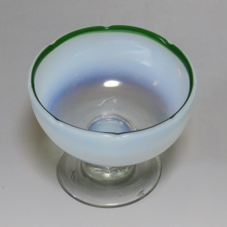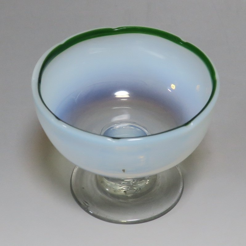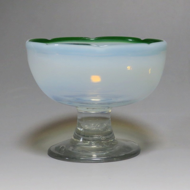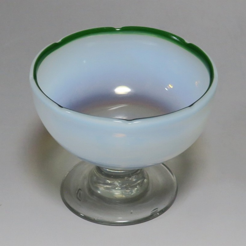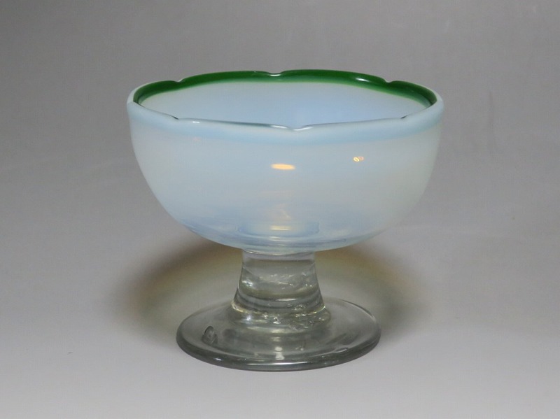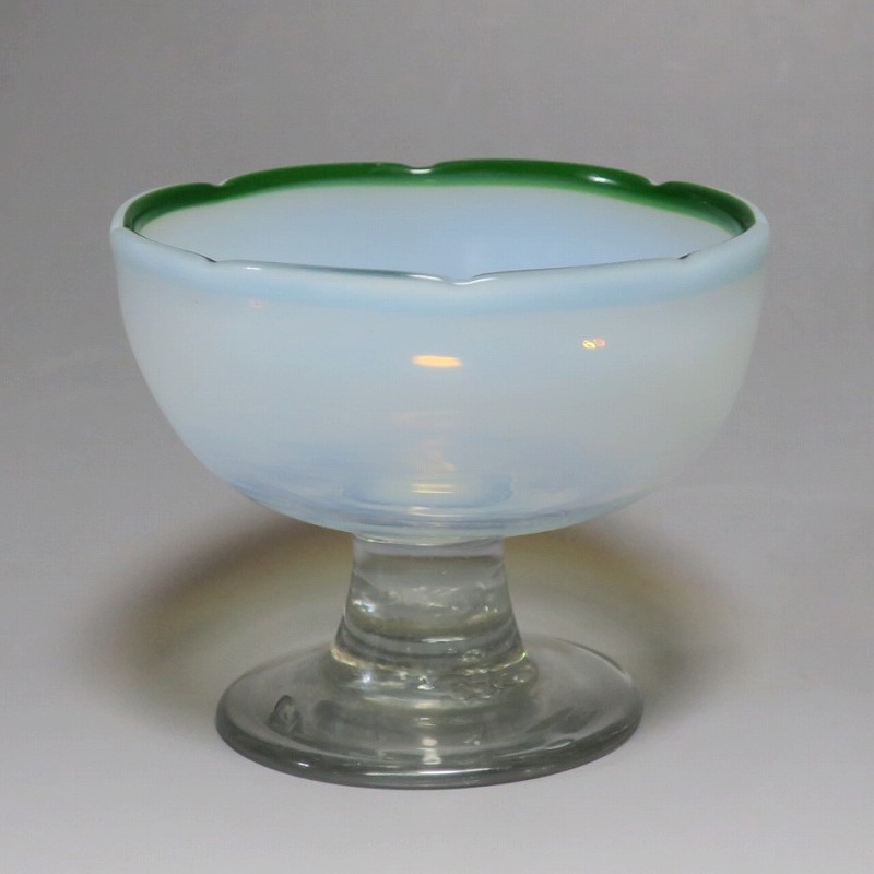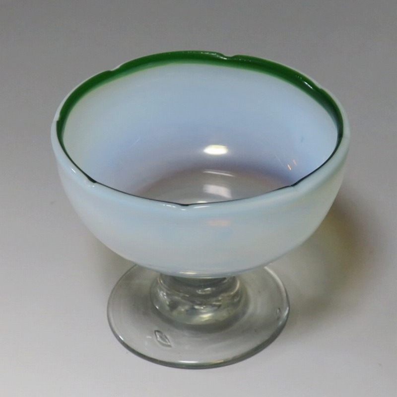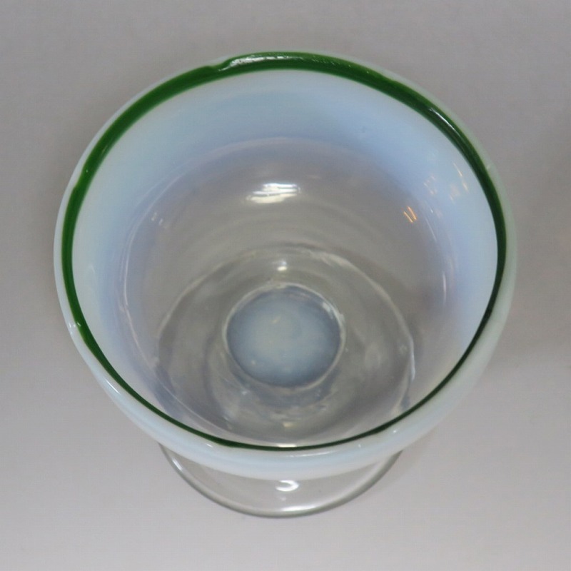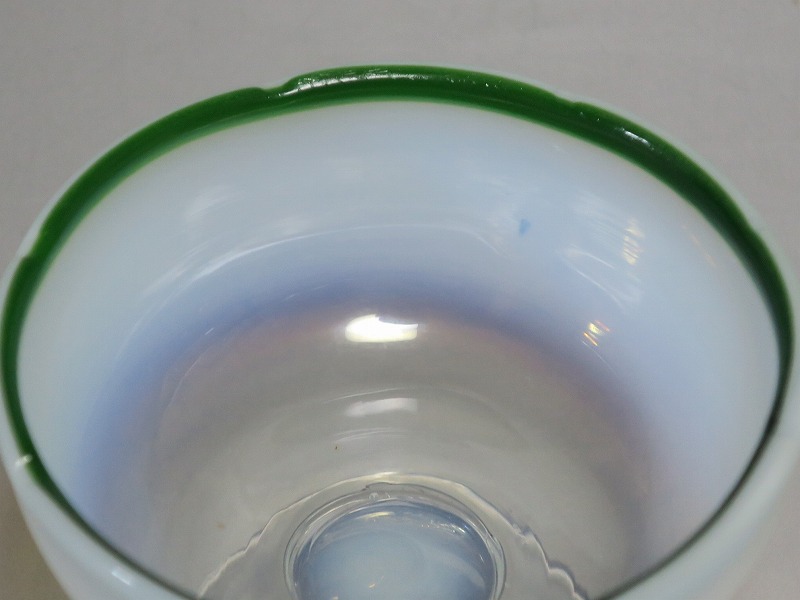 吹きガラス 緑縁 乳白 輪花 氷コップ