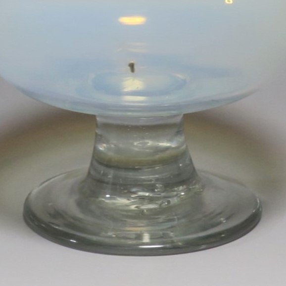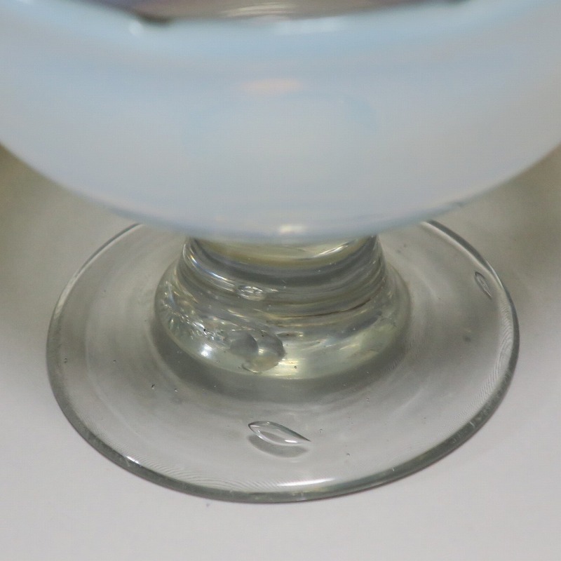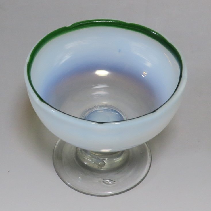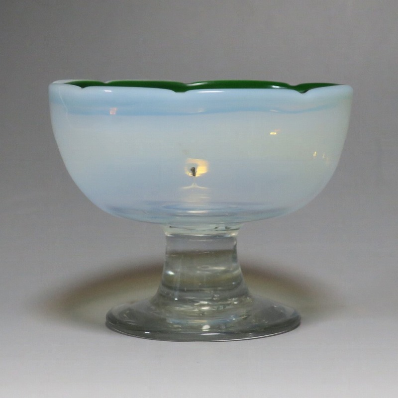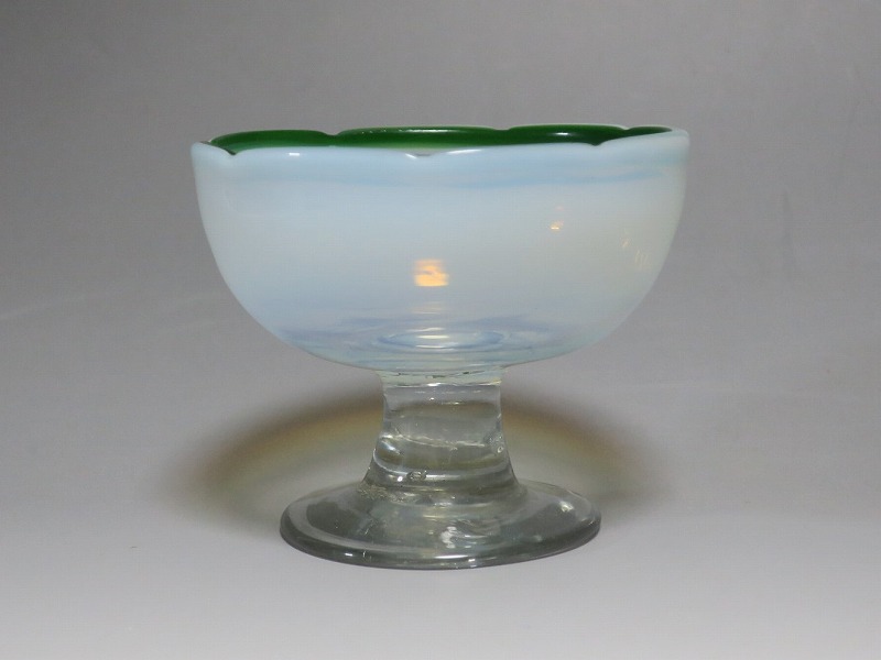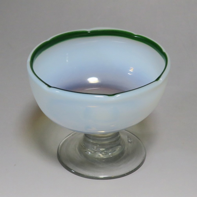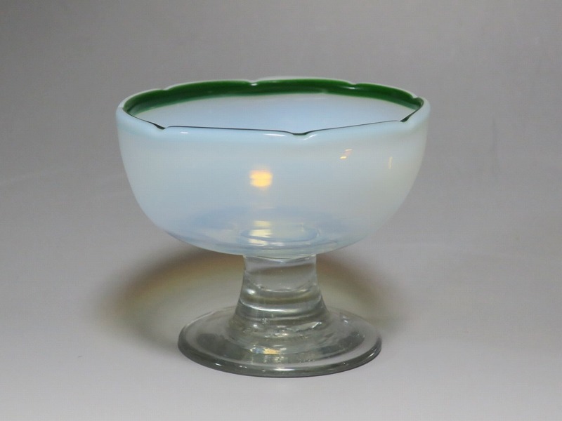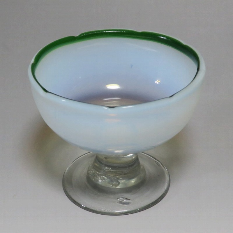 (大正時代 20世紀前半) 商品番号 3289 口径 約9.8cm/高さ 約8cm/高台径 約6.5cm 古ガラス特有の気泡や不純物の混入がありますが、完品です。状態は写真でご確認ください。 明治時代末期、製氷機が普及すると夏にかき氷やアイスクリームを食べることが可能になります。その時、かき氷を盛る器として製作、使用されたのがガラスの氷コップです。手吹きの氷コップは素朴な味わいがあり、現在でも多くのファンがいます。本品は口辺にグリーンを施した乳白色の氷コップ。赤や青に比べると数が少ない作品です。大正デモクラシーの時代、グリーン(緑)は平和の色として流行しました。他色の作品と並べても美しいでしょう。かき氷、アイスクリームを食べる時にご使用ください。 | ||