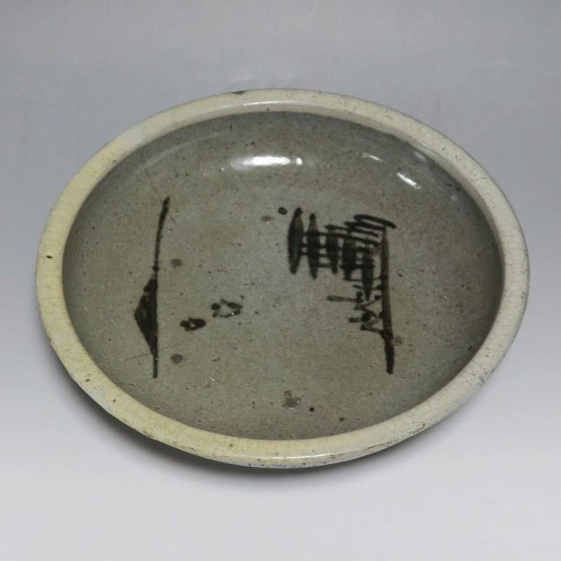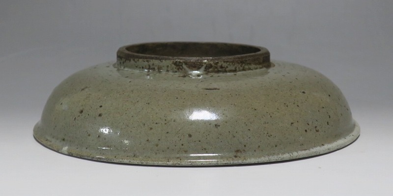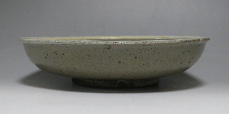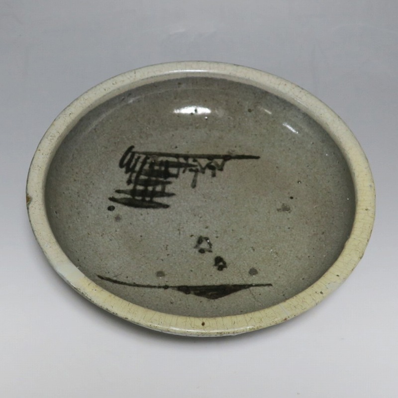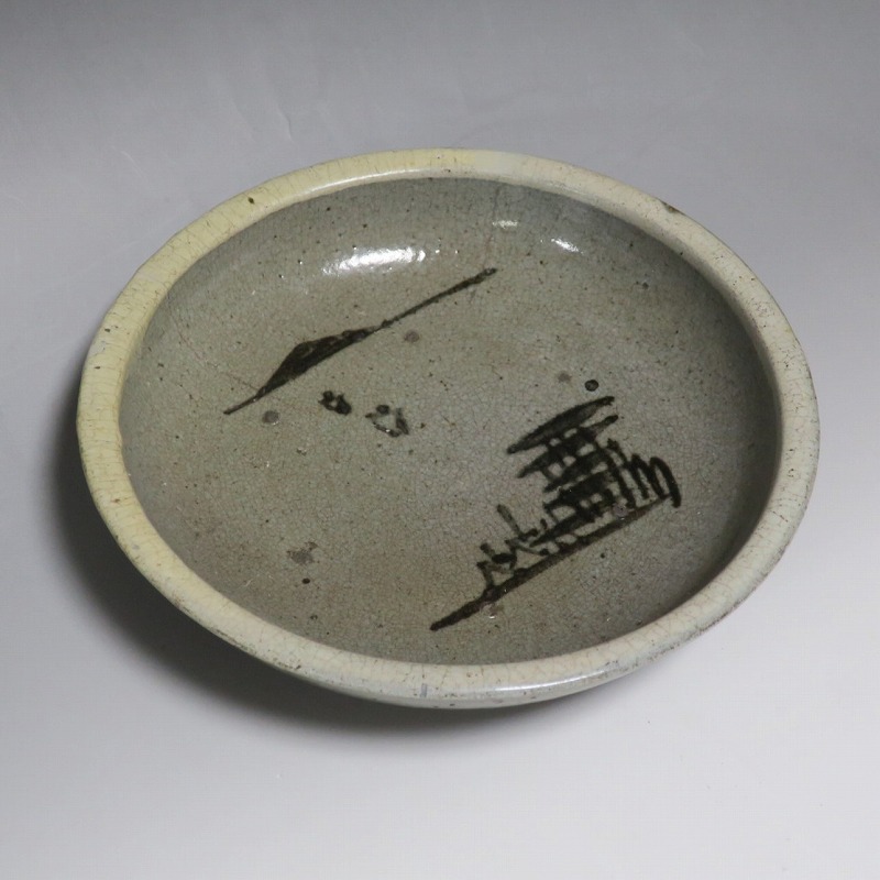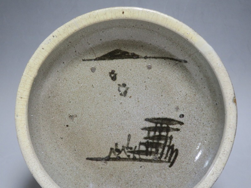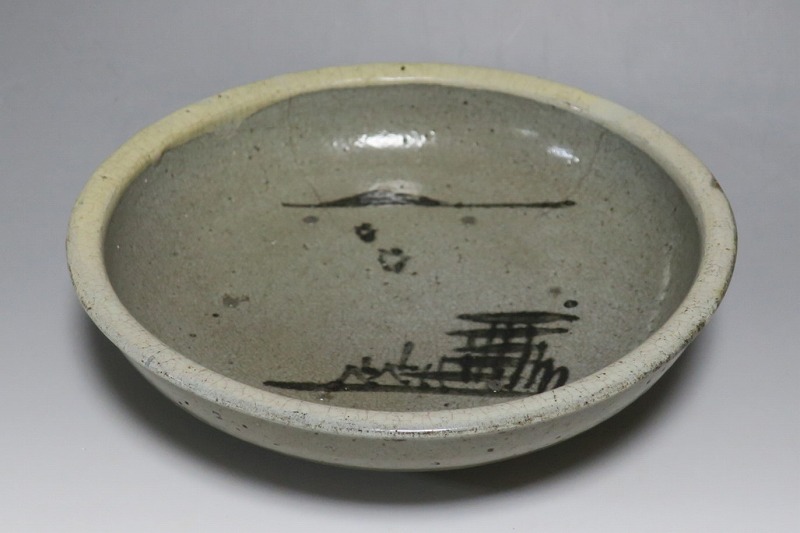 (江戸時代後期 19世紀中頃) 商品番号 3512 口径 約21cm/高さ 約5.4cm/高台径 約9.7cm 口辺に約1.2cmの直し、そこから約5cmのニュウがあり、約7cmのニュウがもう1本あります。状態は写真でご確認ください。 鍛冶町焼は天保時代(1831年〜1845年)、岩手県花巻に花巻人形の製造業者、古館伊織が開いた窯です。 伊織は盛岡藩の御用焼物師となり日常雑器を製作しました。本品は白釉を口辺にかけ、見込みに鉄絵で山水文を描いた陶器製の鉢。素地がグレーで他の窯の作品にはない個性的な東北の民芸品に仕上がっています。郷土料理を盛ると映えそうです。 | ||
