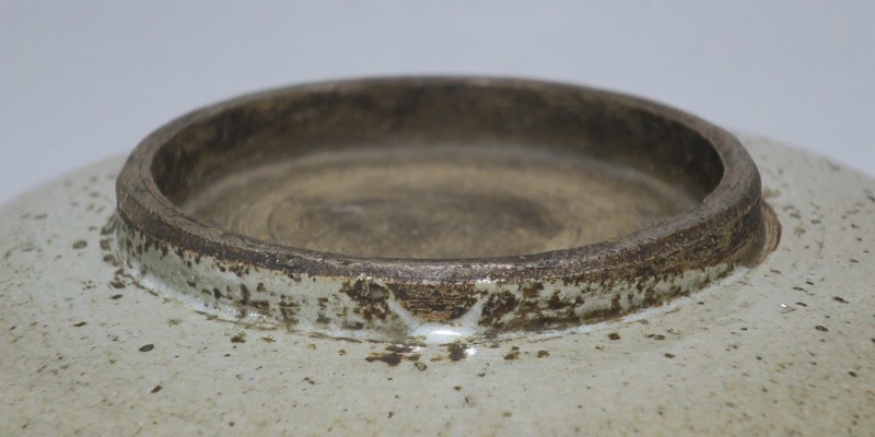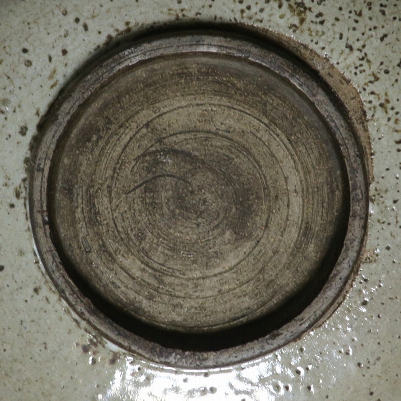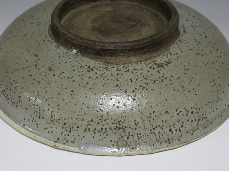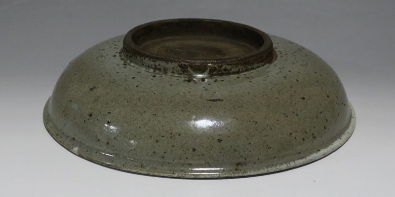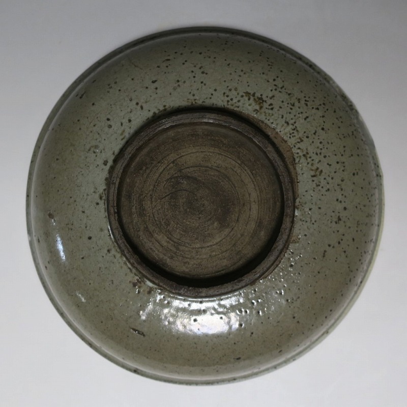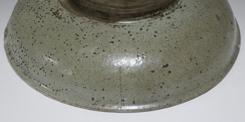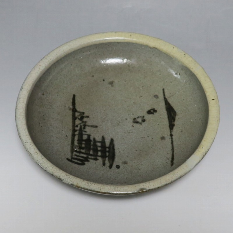 (江戸時代後期 19世紀中頃) 商品番号 3512 口径 約21cm/高さ 約5.4cm/高台径 約9.7cm 口辺に約1.2cmの直し、そこから約5cmのニュウがあり、約7cmのニュウがもう1本あります。状態は写真でご確認ください。 鍛冶町焼は天保時代(1831年〜1845年)、岩手県花巻に花巻人形の製造業者、古館伊織が開いた窯です。 伊織は盛岡藩の御用焼物師となり日常雑器を製作しました。本品は白釉を口辺にかけ、見込みに鉄絵で山水文を描いた陶器製の鉢。素地がグレーで他の窯の作品にはない個性的な東北の民芸品に仕上がっています。郷土料理を盛ると映えそうです。 | ||