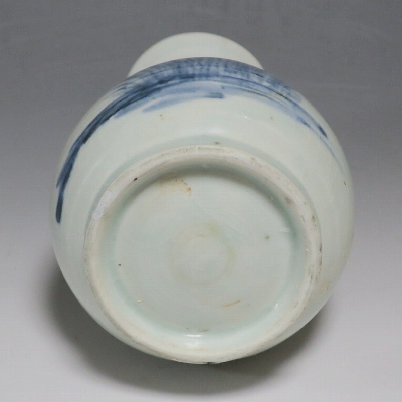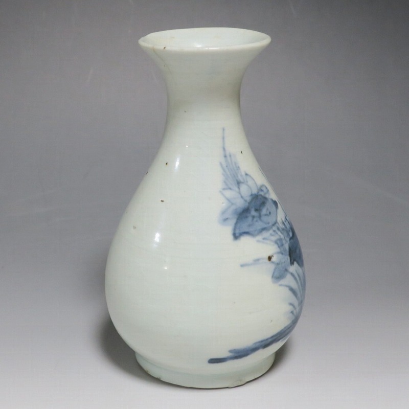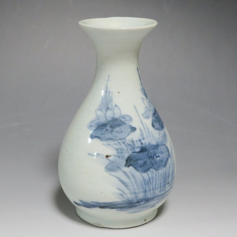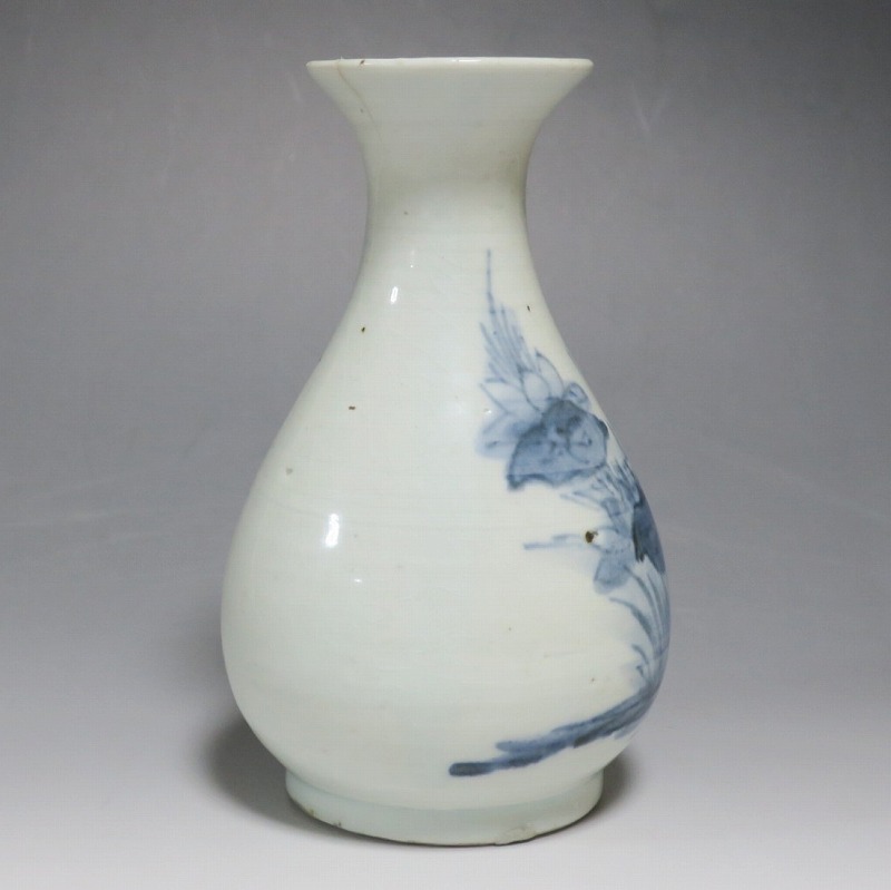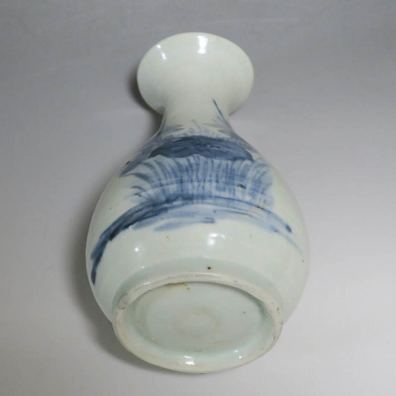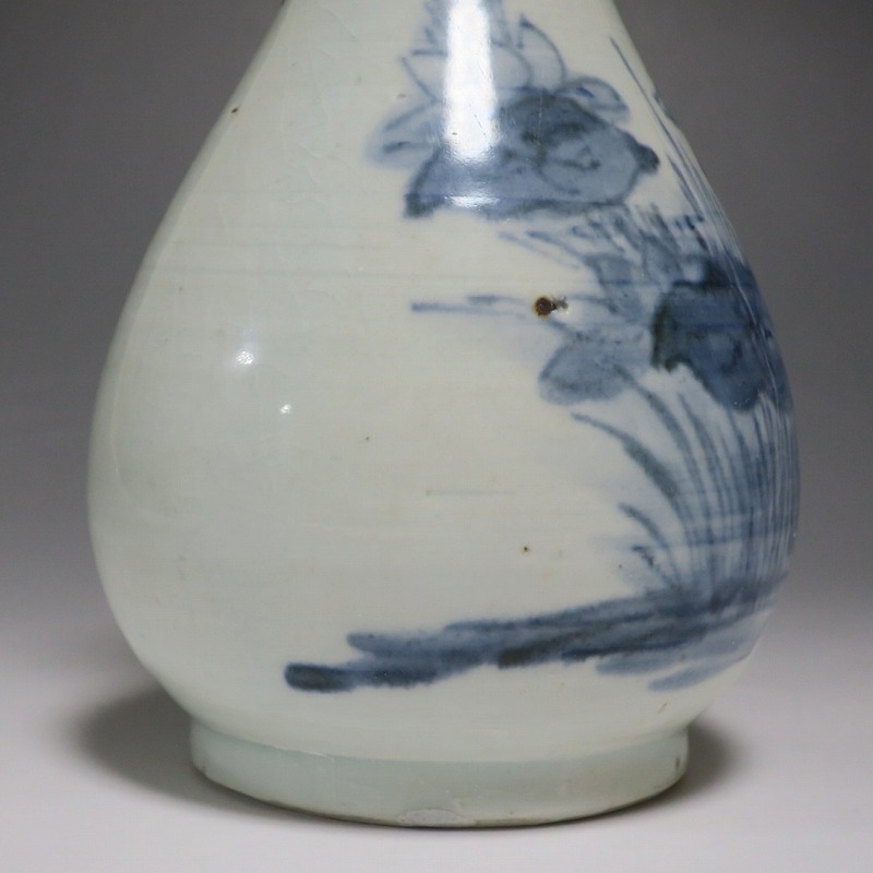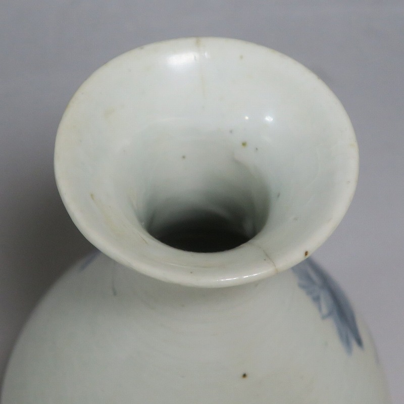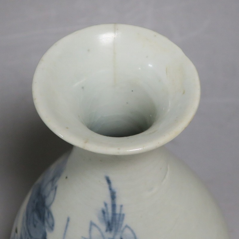 高さ 約17.3cm/胴径 約10.3cm 口辺から約1.5cmと3cmのニュウ、高台に約1cmの直し、下部にカンニュウがあります。状態は写真でご確認ください。 苗代川焼は16世紀末、鹿児島の串木野に移住した朴平意の一団が創設した窯です。 苗代川焼には「黒もん」と呼ばれる日常雑器と「しろもん」と呼ばれる陶器や磁器があります。本品は南京皿山窯で作られた太い首部を持った染付磁器の徳利。他の窯にはない珍しい造形の徳利です。参考写真の花生に似ているので、本来は花生として作られた作品かもしれません。珍品です。サイズが良いので日本酒、焼酎用の徳利として使用できるでしょう。 | ||
