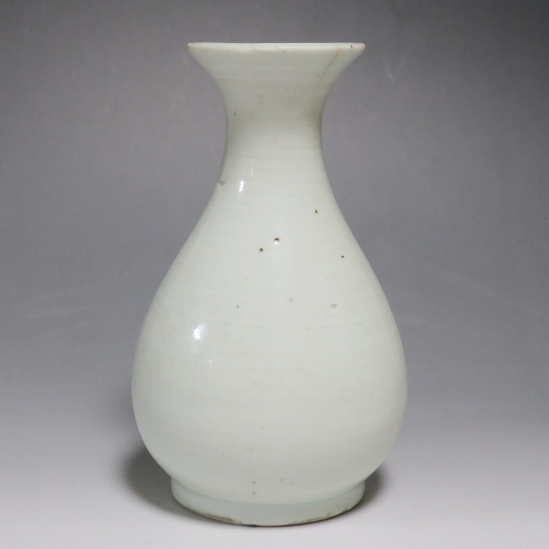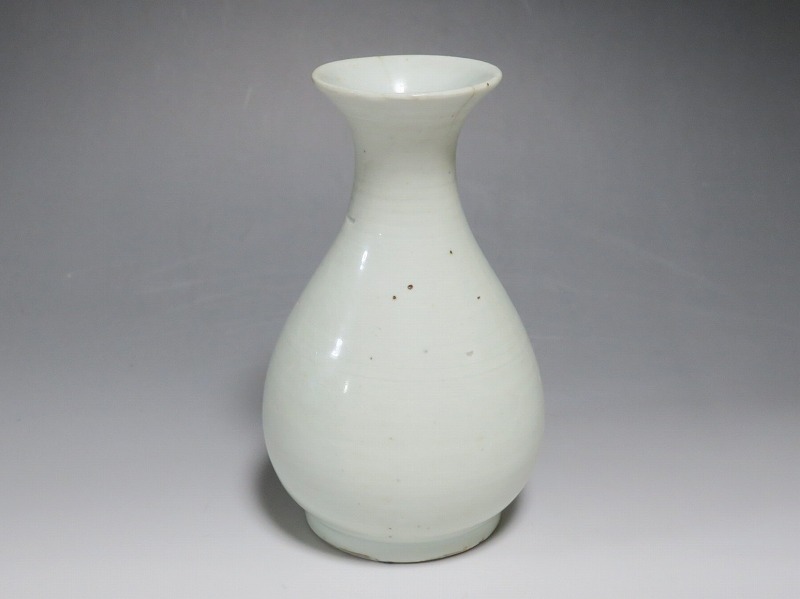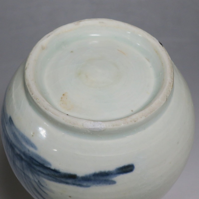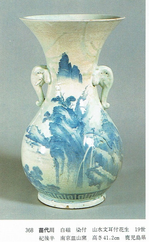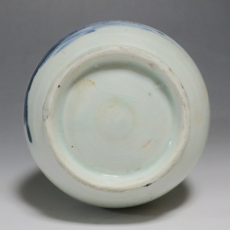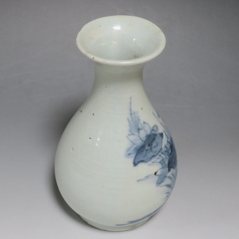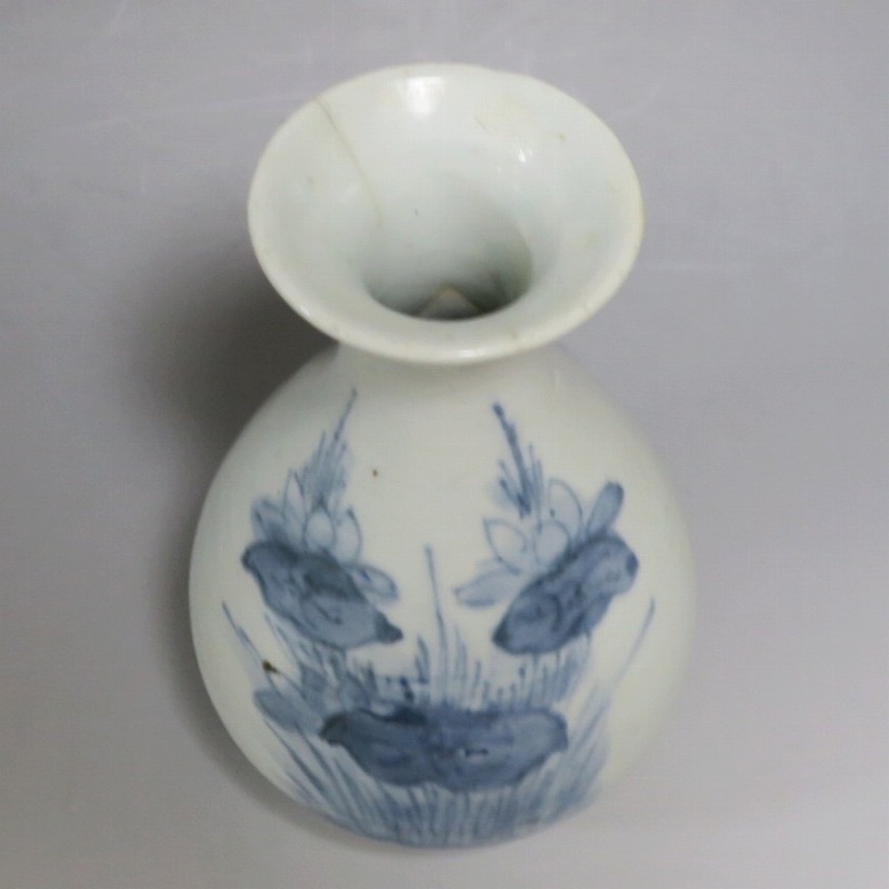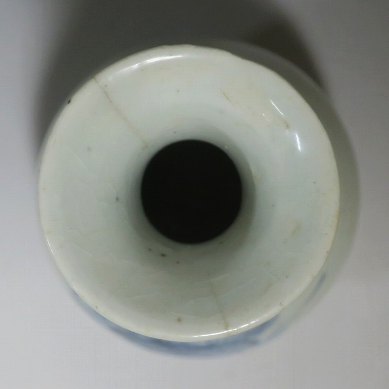 高さ 約17.3cm/胴径 約10.3cm 口辺から約1.5cmと3cmのニュウ、高台に約1cmの直し、下部にカンニュウがあります。状態は写真でご確認ください。 苗代川焼は16世紀末、鹿児島の串木野に移住した朴平意の一団が創設した窯です。 苗代川焼には「黒もん」と呼ばれる日常雑器と「しろもん」と呼ばれる陶器や磁器があります。本品は南京皿山窯で作られた太い首部を持った染付磁器の徳利。他の窯にはない珍しい造形の徳利です。参考写真の花生に似ているので、本来は花生として作られた作品かもしれません。珍品です。サイズが良いので日本酒、焼酎用の徳利として使用できるでしょう。 | ||
