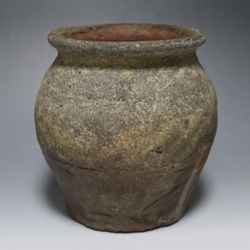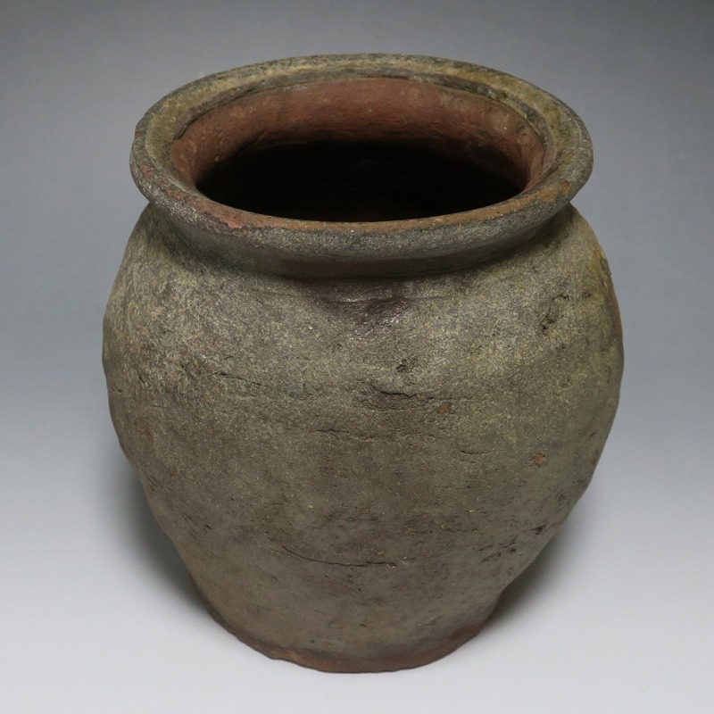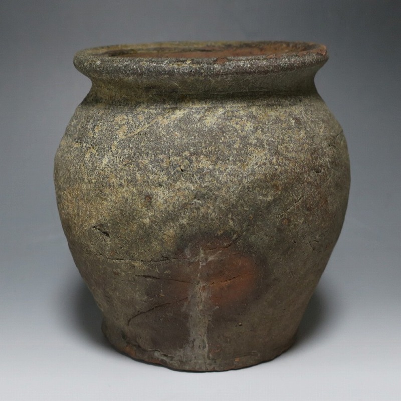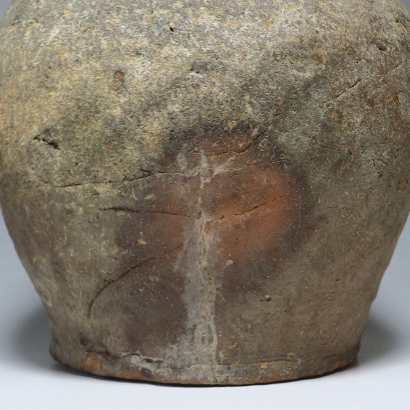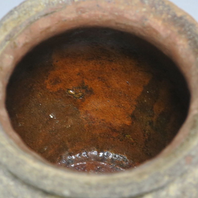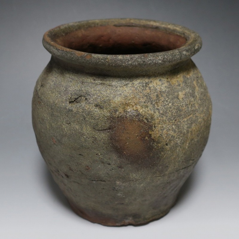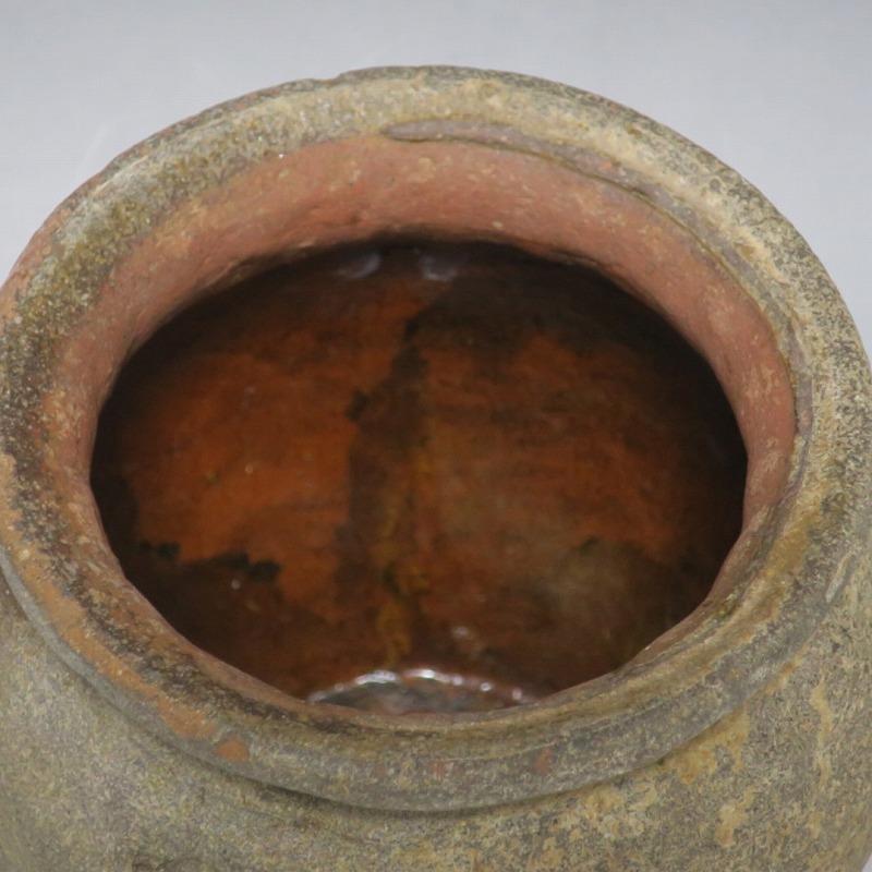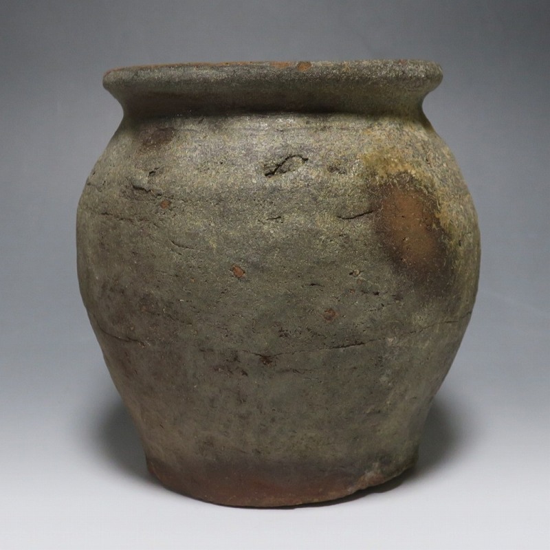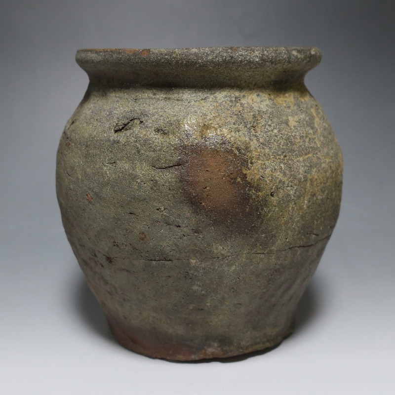 高さ 約19cm/胴径 約19cm 胴部から底部にかけてニュウがあり、水が漏れます。花器として使用する際は落としをご利用ください。内側に水漏れ防止の漆が塗られた跡があり、底部が若干ぐらつきます。状態は写真でご確認ください。 常滑焼は、愛知県常滑市周辺で平安時代末期から活動している六古窯の一つです。中世から近世にかけて壺や甕などの作品を生産、日本各地で使用されました。本品は江戸時代中期に作られた壺。種壺などに使用されていたものです。胴部のぼたもち模様が本作の個性となっています。落としをして花器としても使用できる侘びた作品です。 | ||