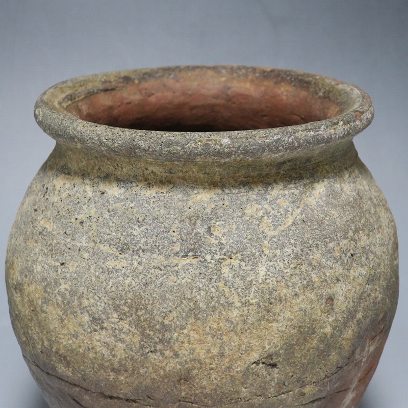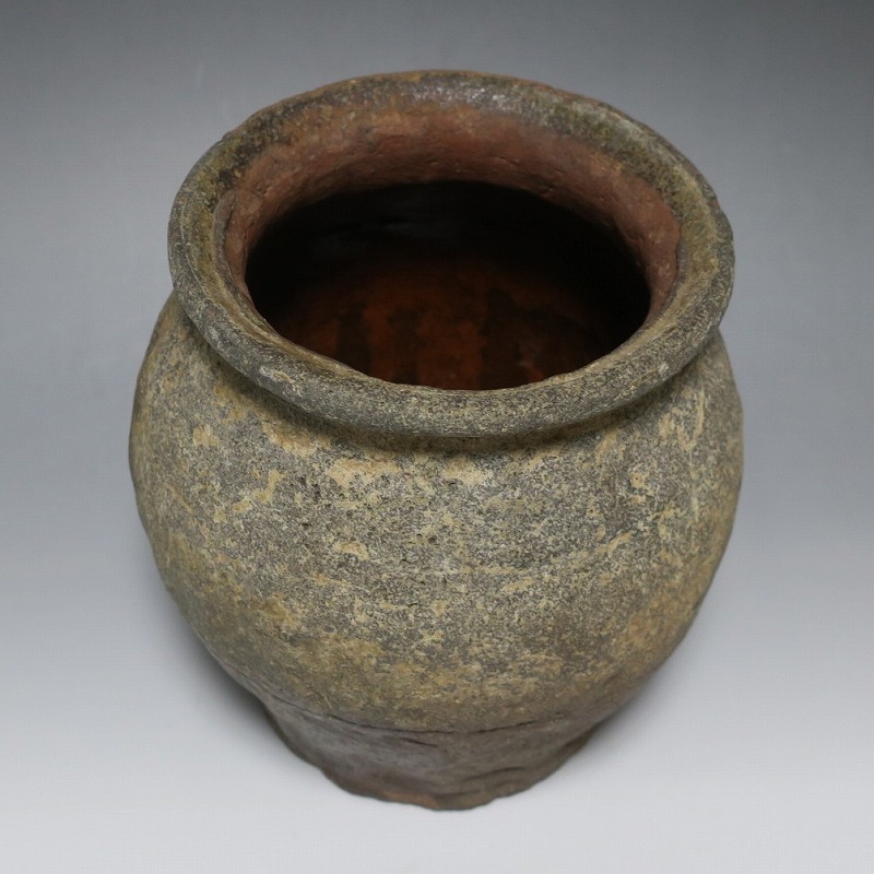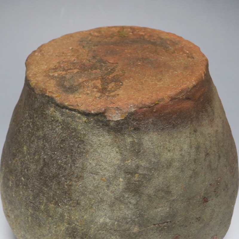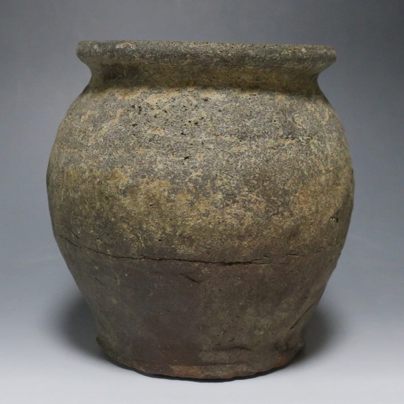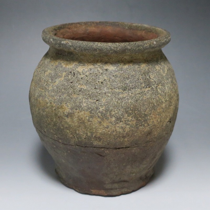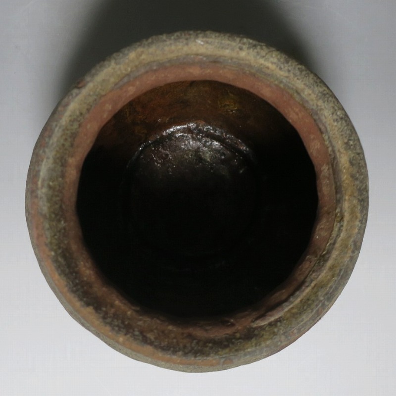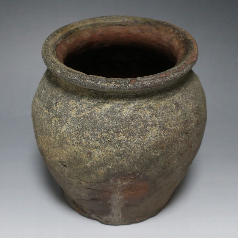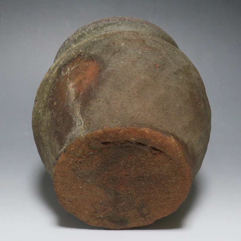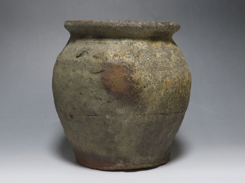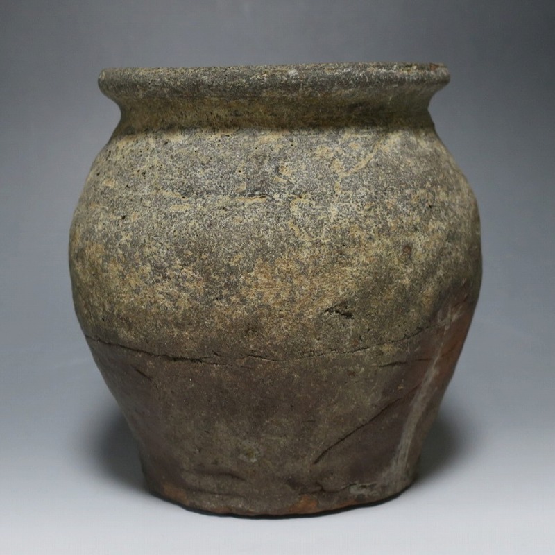 高さ 約19cm/胴径 約19cm 胴部から底部にかけてニュウがあり、水が漏れます。花器として使用する際は落としをご利用ください。内側に水漏れ防止の漆が塗られた跡があり、底部が若干ぐらつきます。状態は写真でご確認ください。 常滑焼は、愛知県常滑市周辺で平安時代末期から活動している六古窯の一つです。中世から近世にかけて壺や甕などの作品を生産、日本各地で使用されました。本品は江戸時代中期に作られた壺。種壺などに使用されていたものです。胴部のぼたもち模様が本作の個性となっています。落としをして花器としても使用できる侘びた作品です。 | ||