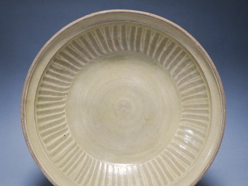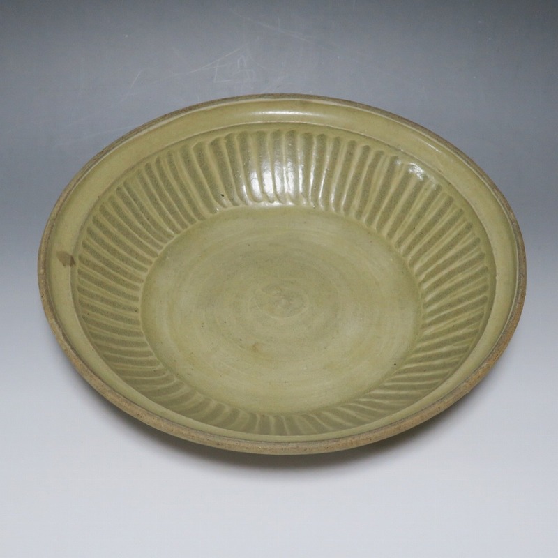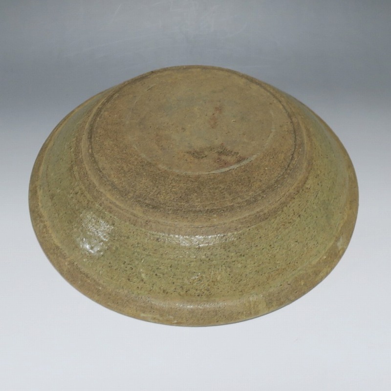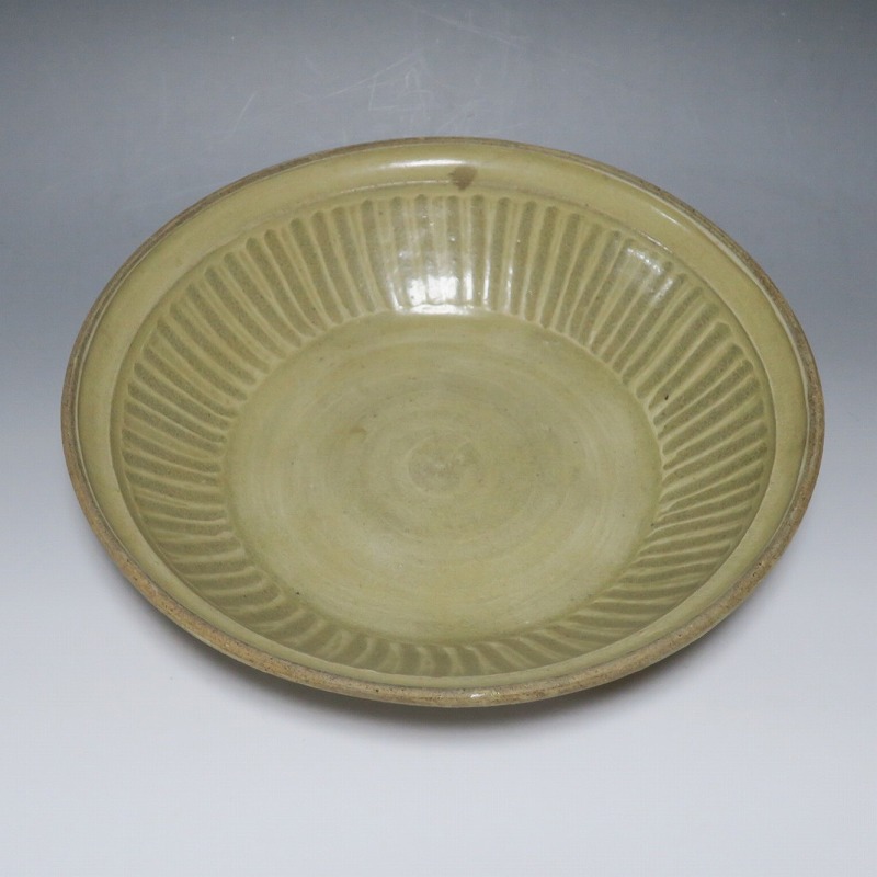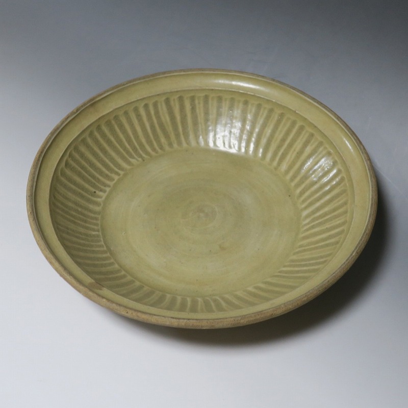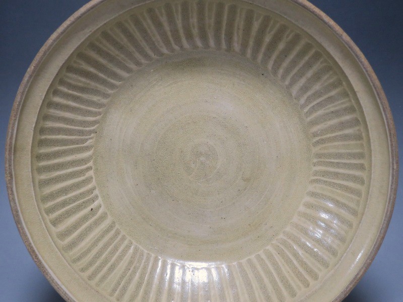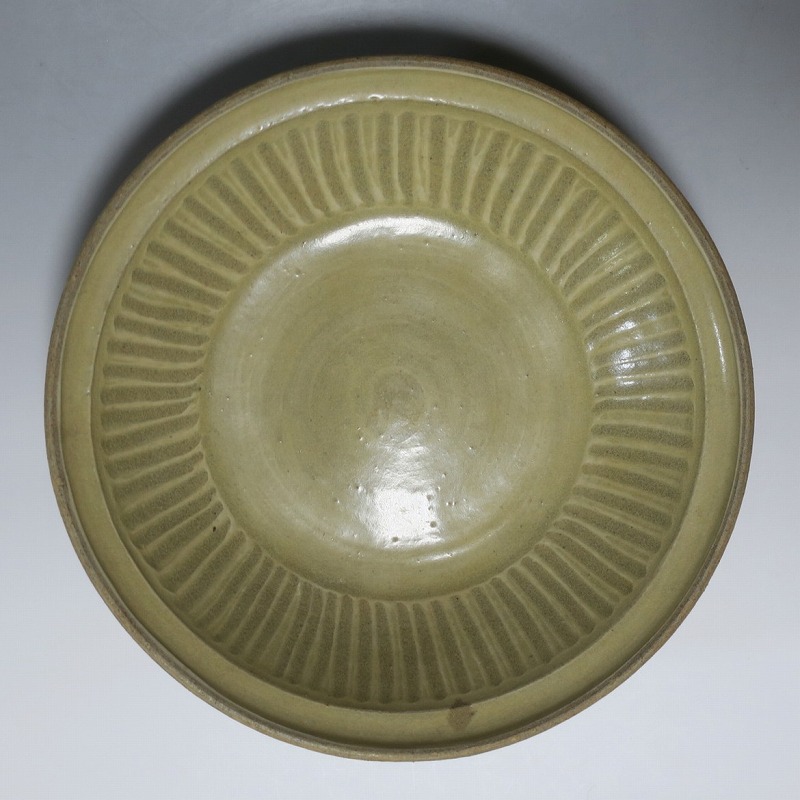 (タイ 15世紀) 商品番号 3921 口径 約28.5cm/高さ 約6cm/高台径 約17cm 窯傷がありますが、総じて良い状態です。状態は写真でご確認ください。 パーン窯は15世紀前後、北部タイで活動した窯です。当時、タイにはスンコロク窯、スコータイ窯など多くの良質な陶磁器を製作する窯がありますが、パーン窯は独特の青磁作品を製作しました。本品は淡いライトグリーン色の釉薬が掛かったしのぎ文のある尺皿。シンプルなデザインのモダンな感じがする作品です。古格、落ち着いた雰囲気があります。エスニック料理の食器としてお楽しみください。 | ||