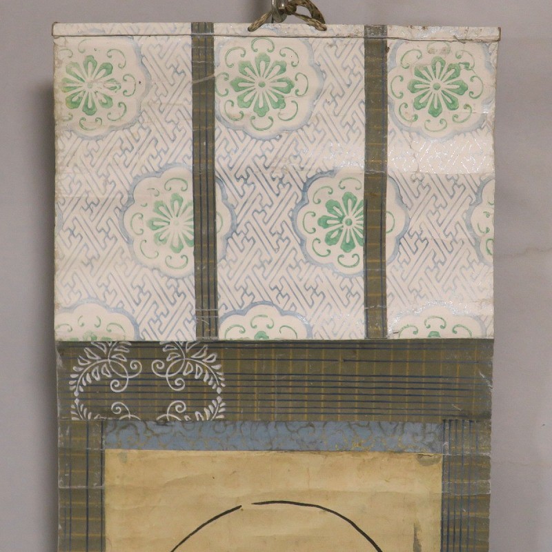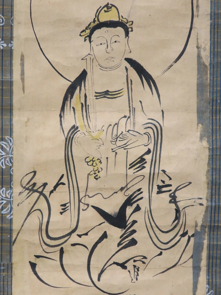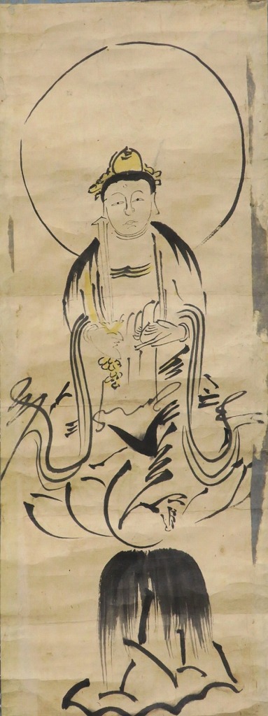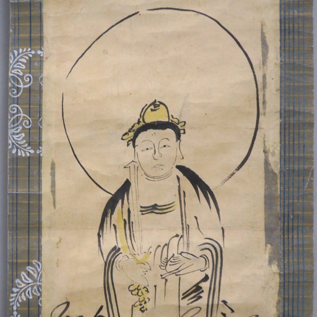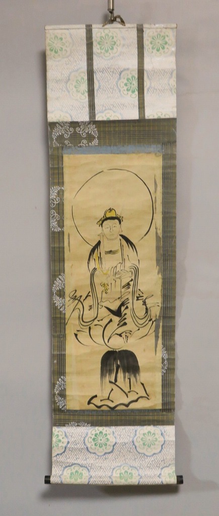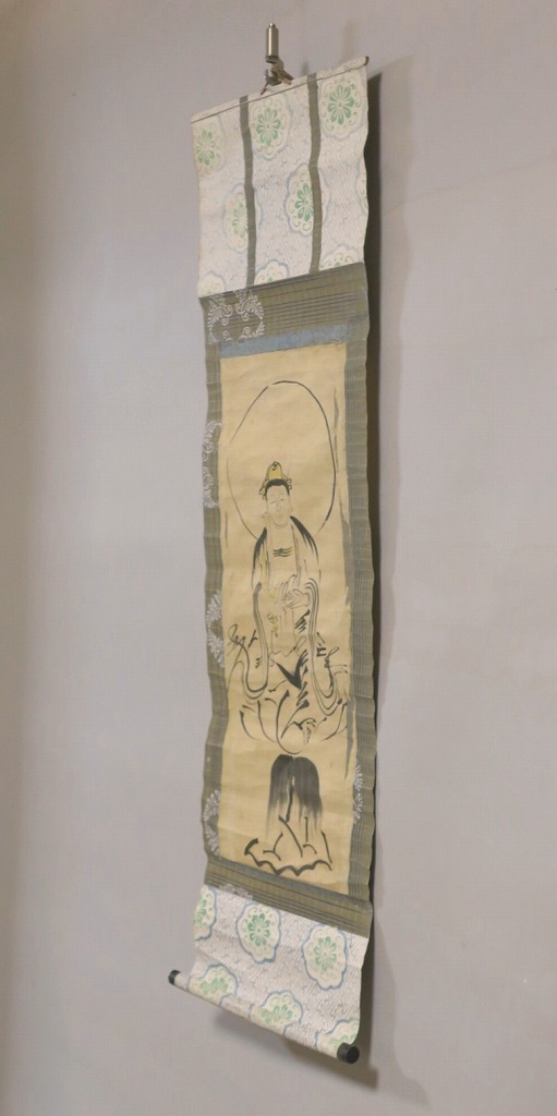 本紙サイズ 縦横 38cm×14cm 経年の染みや折れ、虫食いがあります。状態は写真でご確認ください。 観音菩薩は、阿弥陀如来が化身した仏像です。観音は様々な観音に化身し、衆生を救うと言われています。本品は墨絵で描かれた観音菩薩の三十三の化身の一つ・楊柳観音(ようりゅうかんのん)。観音像の下に柳が描かています。柳の枝が風になびく様子は、観音菩薩が衆生の願いを聞き届ける姿を表しています。残存数が少ないので貴重品。日本の民画といえる素朴な作品です。 | ||