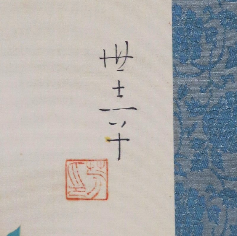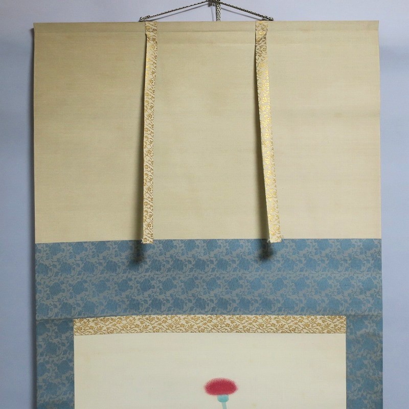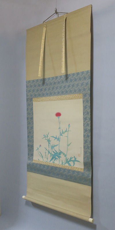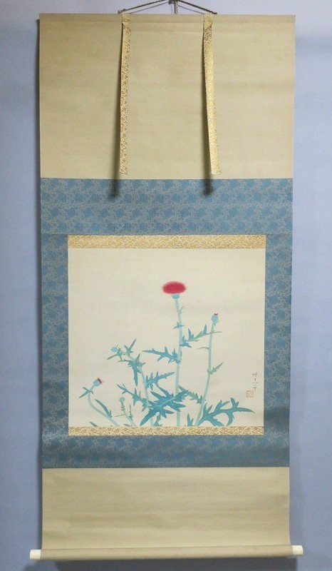 中村世志子(1912-1977)は昭和時代に活躍した中堅日本画家です。中村貞以に師事、日本美術院院友として活動しました。本作は花アザミを描いた軸。花アザミと余白の関係が生かされた軸です。優しい女流画家の繊細な感性が表現されています。花アザミの季節に床の間に掛けてお楽しみください。