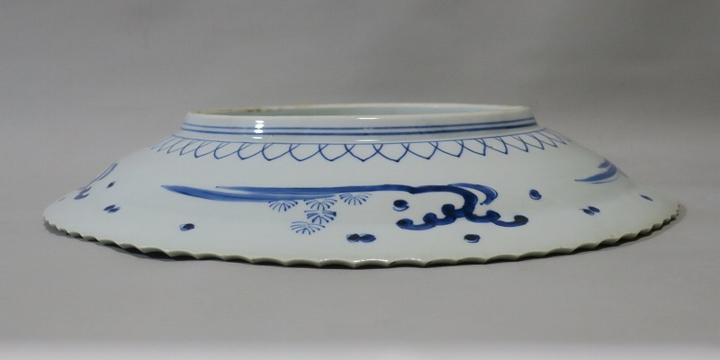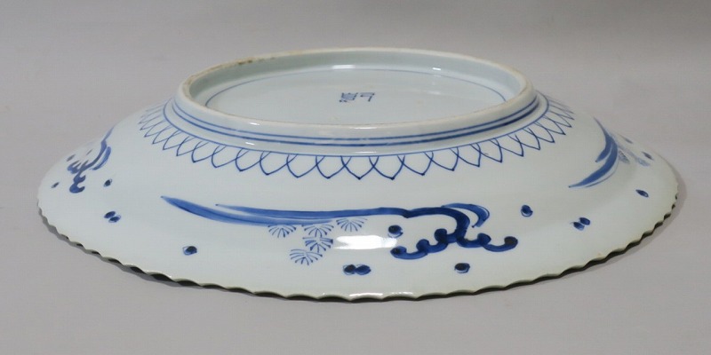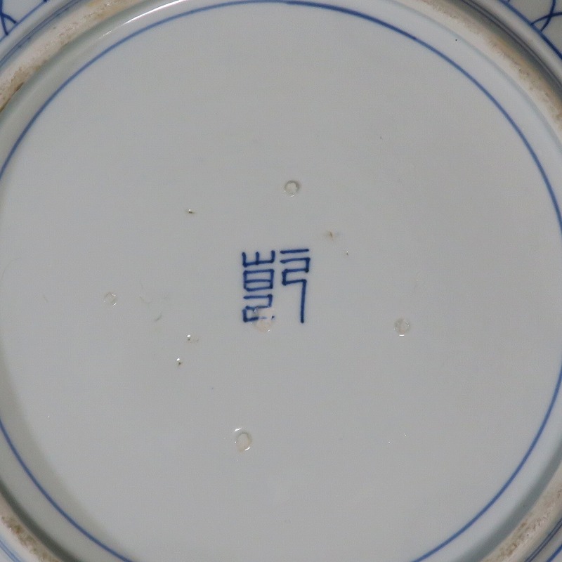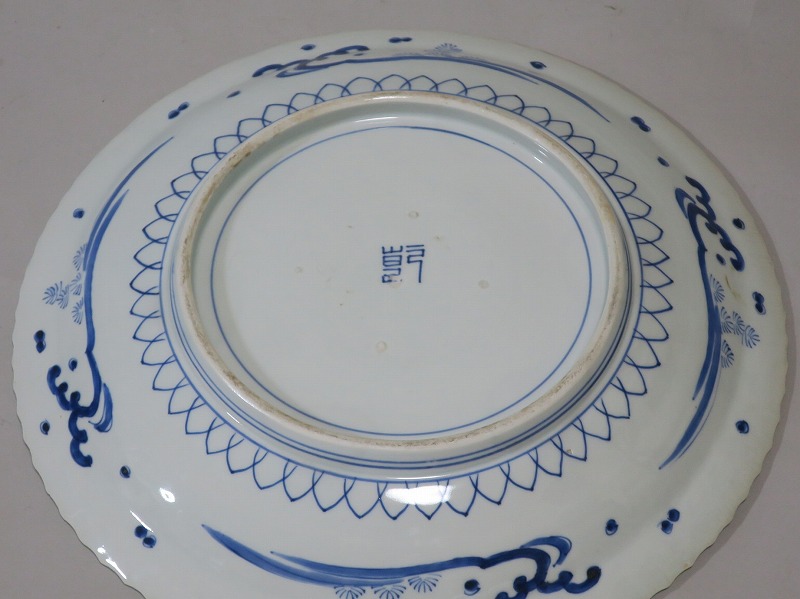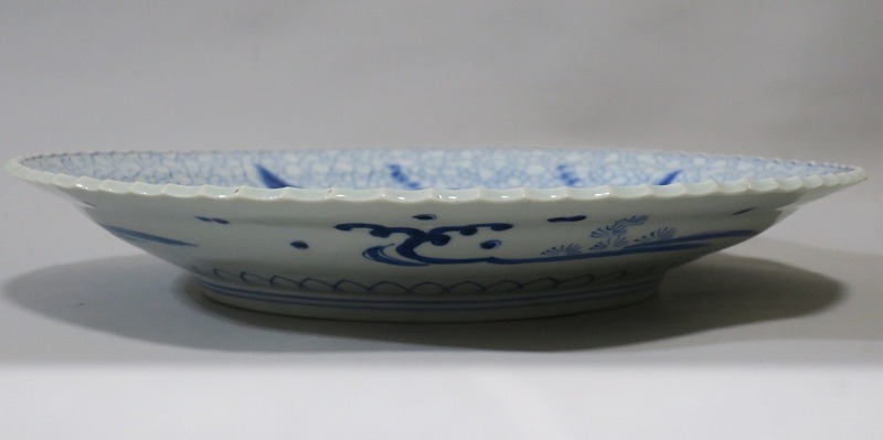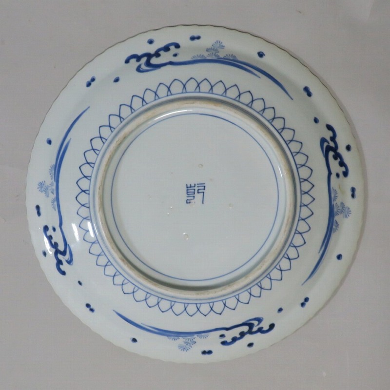 口径 約43cm/高さ 約6.5cm 窯傷はありますが、完品です。状態は写真でご確認ください。 19世紀前半、化政時代になると磁器生産が日本各地で始まります。その中でも伊万里焼は他の窯が追随できない品質、時代の流行に対応した作品を製作しました。本品は染付で氷烈双魚文を描いた大皿。口辺の造形が独特な「いげ皿」と呼ばれている作品です。双魚文は古代から子孫繁栄を表わす吉祥文、イエス・キリストを象徴する印として使用されています。迫力のある大皿。インテリア、盛り皿としてご使用ください。 | ||