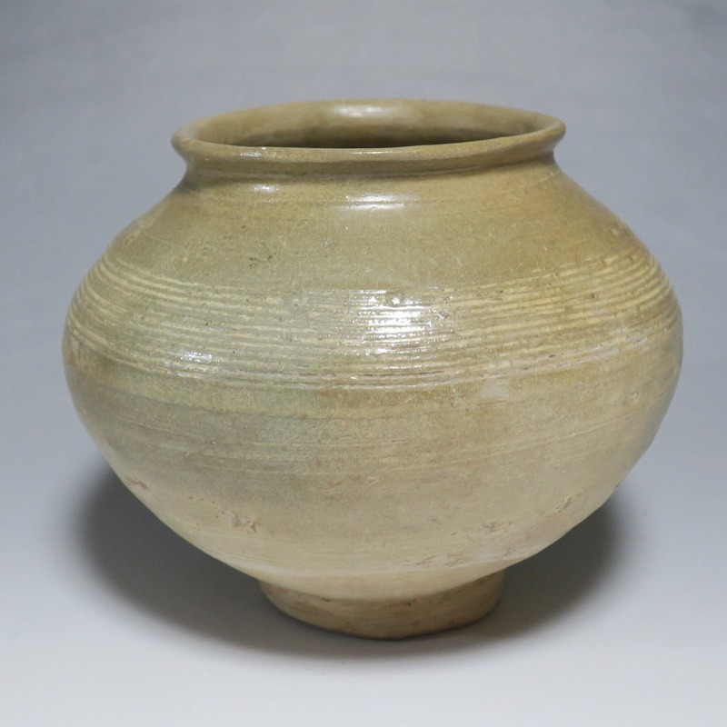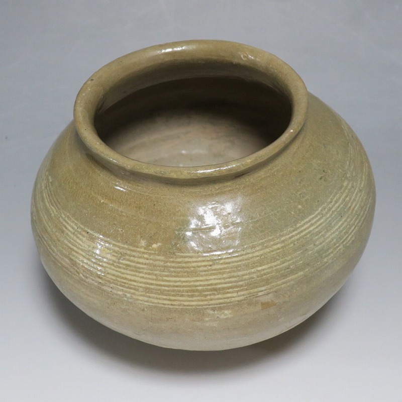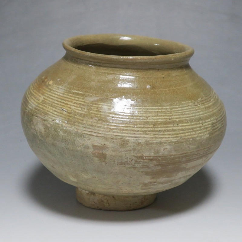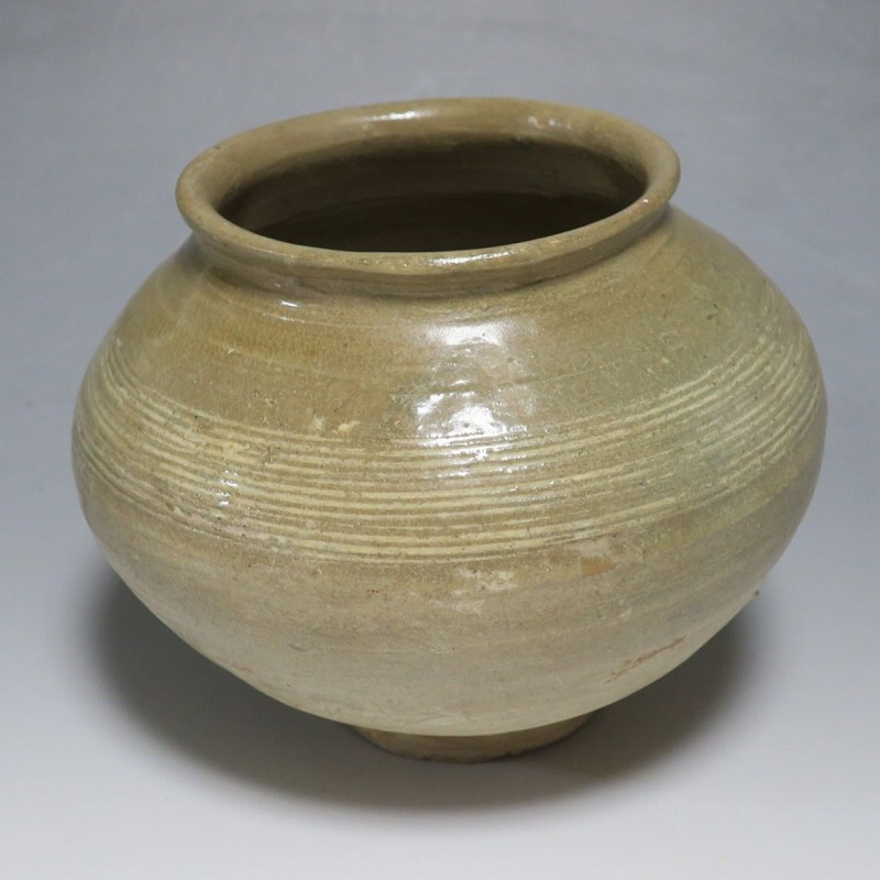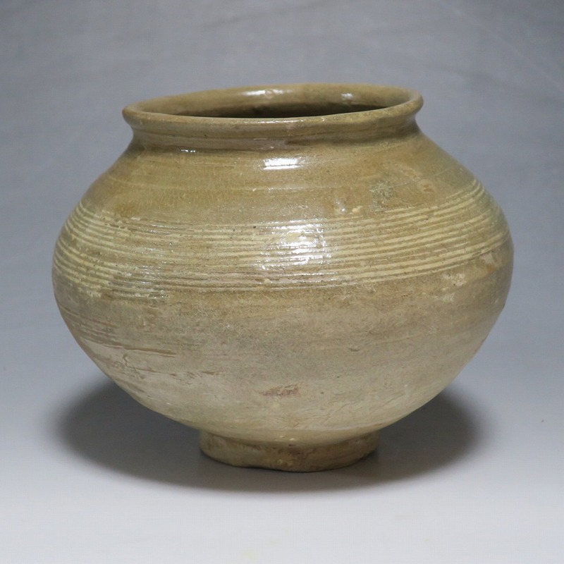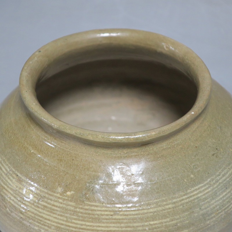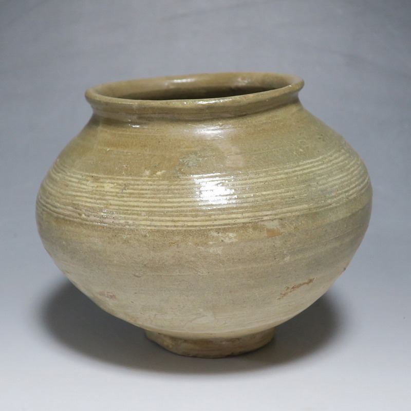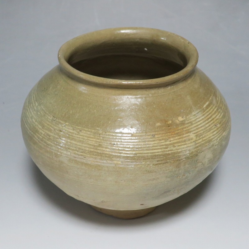 高さ 約13cm/胴径 約16cm 口辺の3分の1に共直し、発掘時の土がつき、高台や胴部に窯傷があり水が漏れます。花を生ける場合はオトシをご使用ください。状態は写真でご確認ください。 高麗から李朝に政権が交代した14世紀、粉青沙器と呼ばれる新しい様式の焼物が出現します。灰釉、刷毛目、井戸などの多様な粉青沙器は独特の味わいがあるので古美術品として人気があります。本品は16世紀に作られた象嵌輪線文壺。シンプルなデザインの作品です。李朝独自の造形、由宇町の変化のある味わい深い壺。インテリア、落としを使って花器としてお楽しみください。 | ||