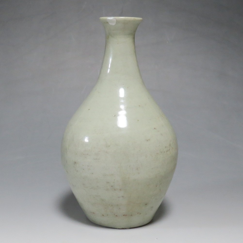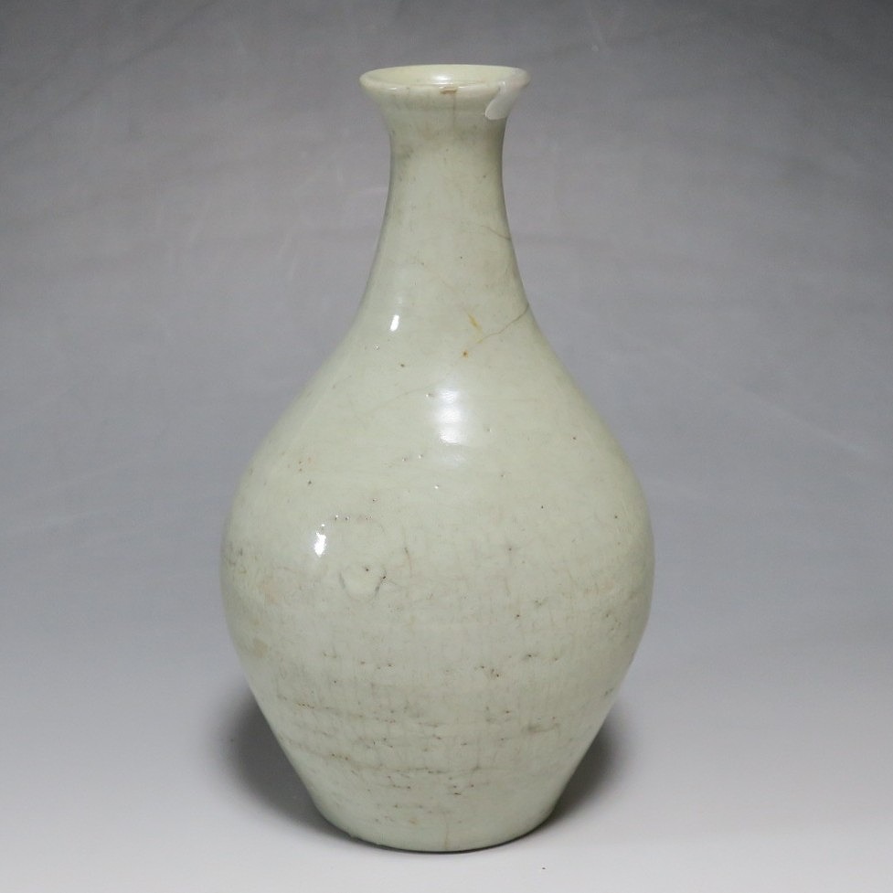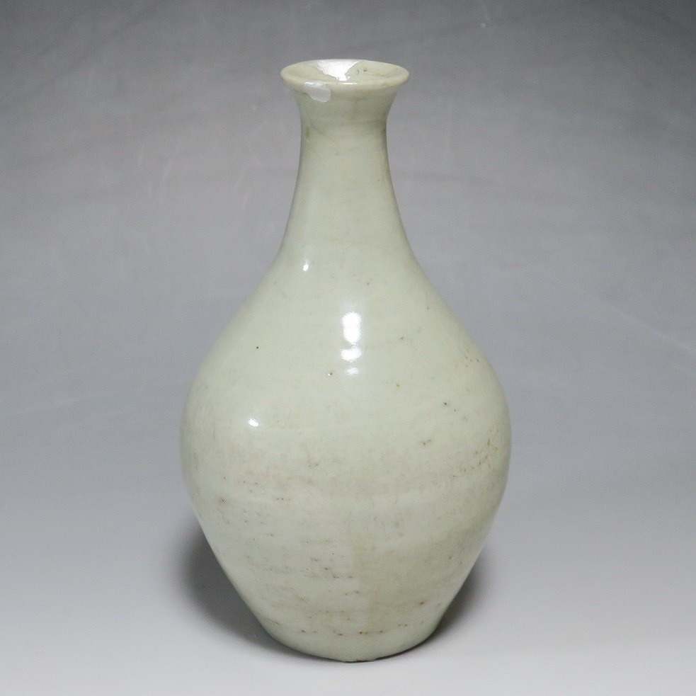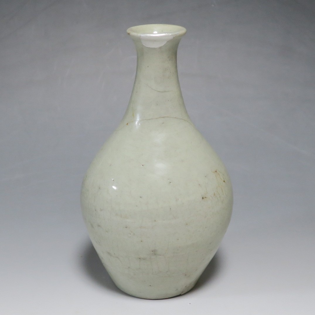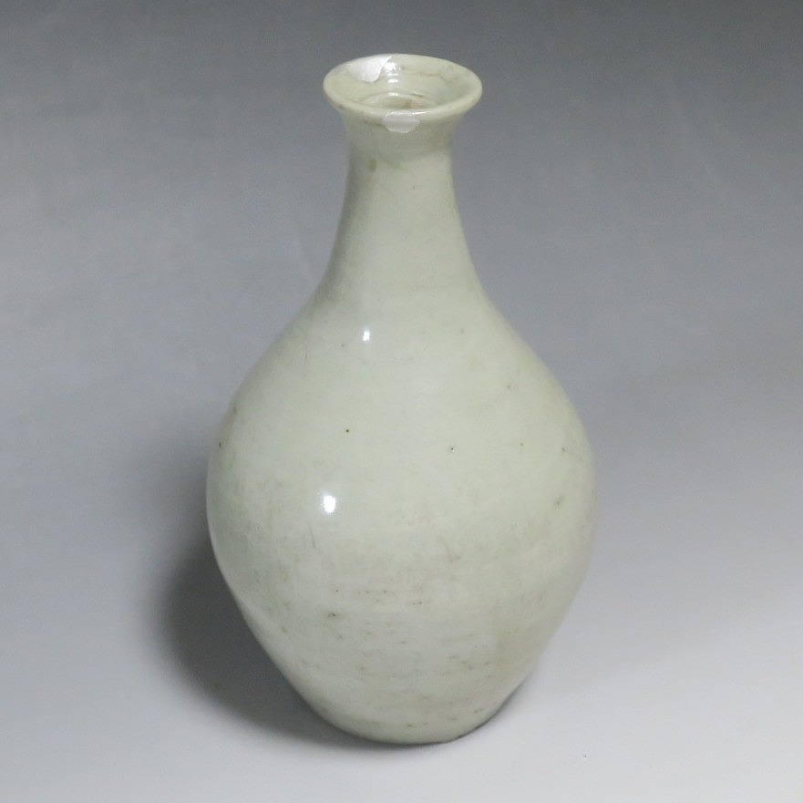 高さ 約17.4cm/胴径 約10cm 経年の汚れがつき、口辺に約1cmと8mmの銀直し、高台に窯傷、所々カンニュウがあります。状態は写真でご確認ください。 砥部焼は、1750年頃に愛媛県伊予郡砥部町に開かれた窯です。18世紀後半に磁器焼成に成功、1818年に良質の陶石(川登石)を発見した後、作品の質が向上し、有田と並ぶ一大磁器生産地となりました。本品は18世紀後半に北川毛窯で製作された白磁の徳利。高台を見ると鉄分の多い赤土が使われているので本品が北川毛窯産であることがわかります。お預け徳利サイズの清楚な作品。酒器の他、インテリア、花器としてお楽しみください。 | ||