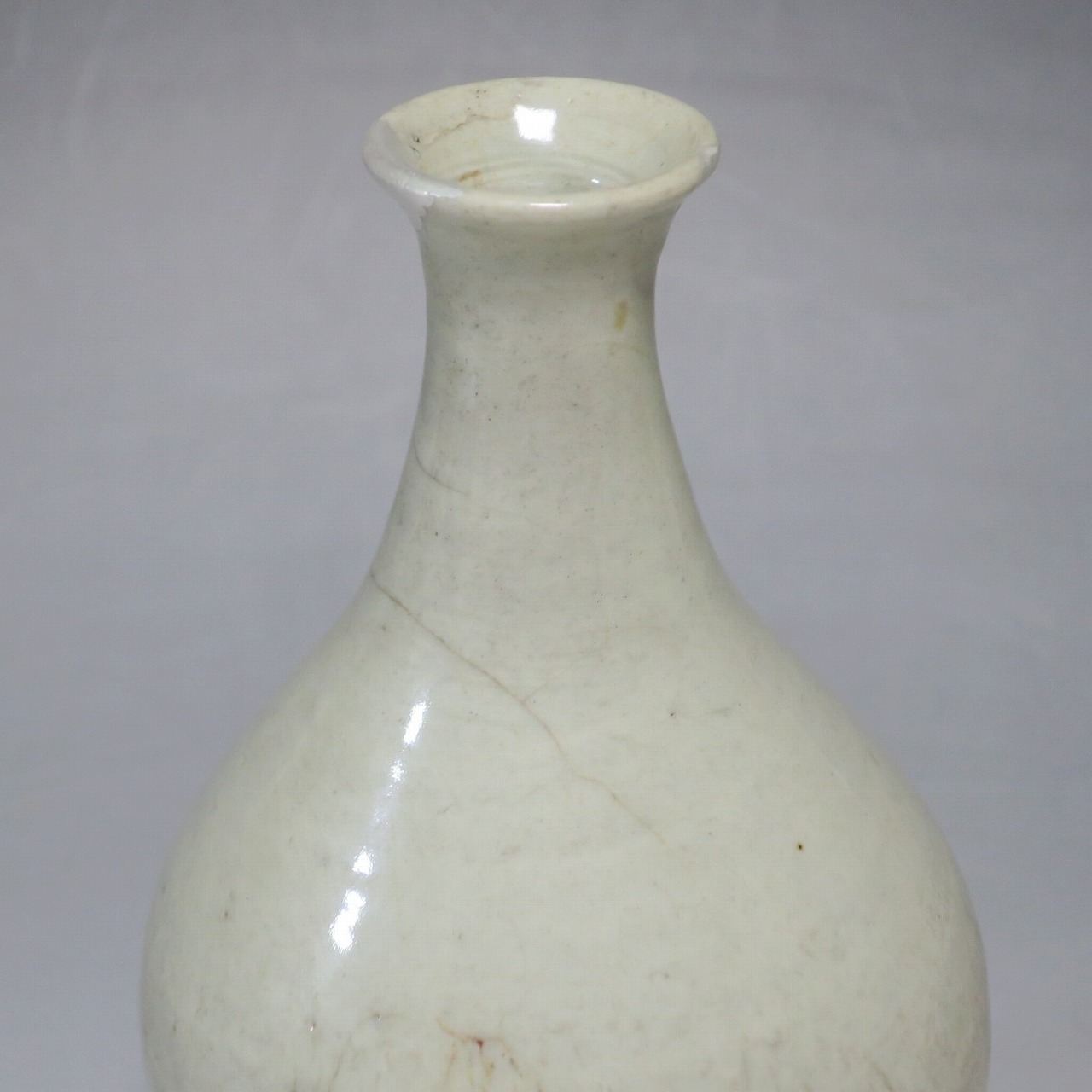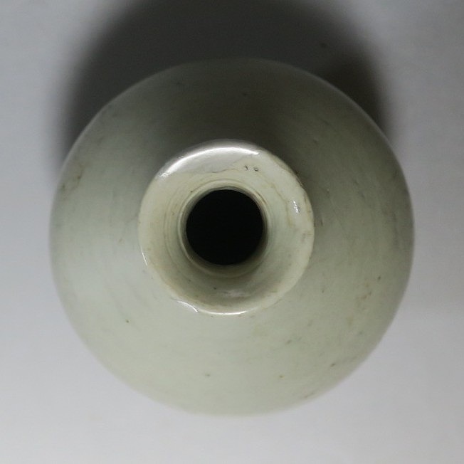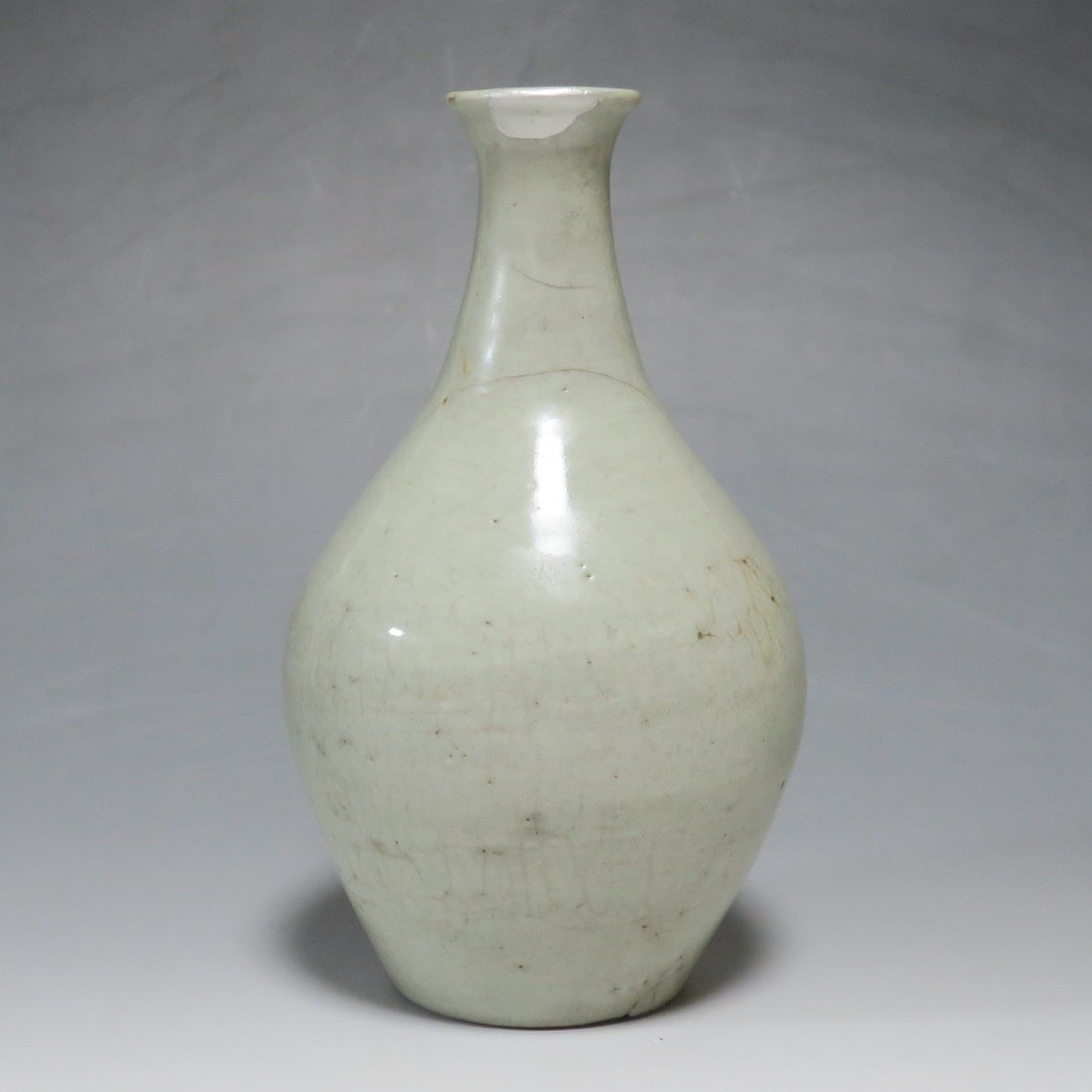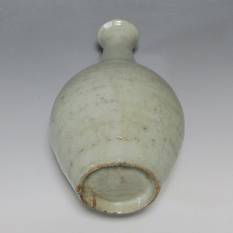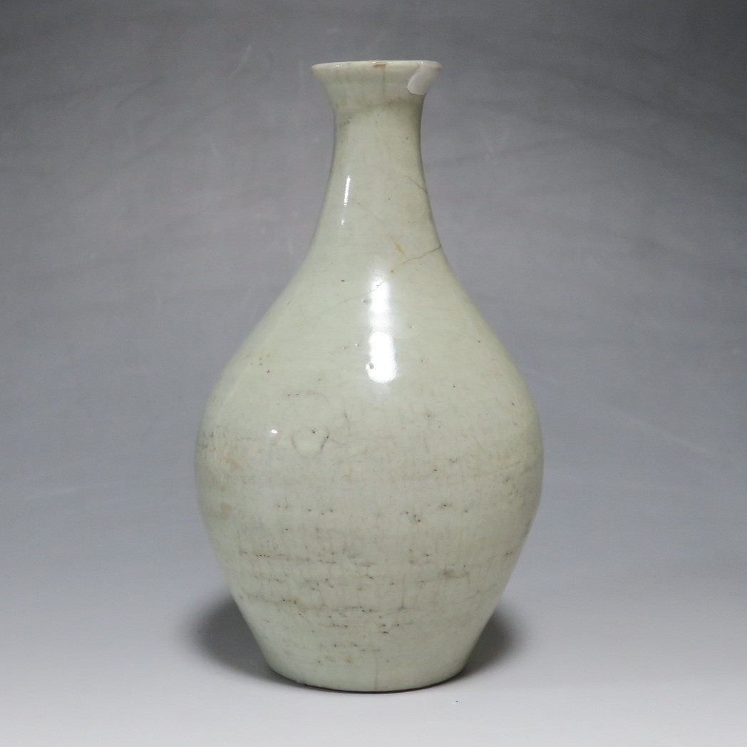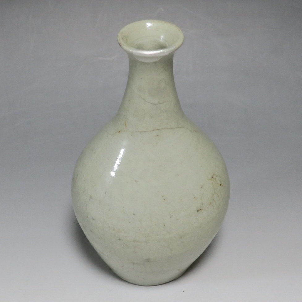 高さ 約17.4cm/胴径 約10cm 経年の汚れがつき、口辺に約1cmと8mmの銀直し、高台に窯傷、所々カンニュウがあります。状態は写真でご確認ください。 砥部焼は、1750年頃に愛媛県伊予郡砥部町に開かれた窯です。18世紀後半に磁器焼成に成功、1818年に良質の陶石(川登石)を発見した後、作品の質が向上し、有田と並ぶ一大磁器生産地となりました。本品は18世紀後半に北川毛窯で製作された白磁の徳利。高台を見ると鉄分の多い赤土が使われているので本品が北川毛窯産であることがわかります。お預け徳利サイズの清楚な作品。酒器の他、インテリア、花器としてお楽しみください。 | ||