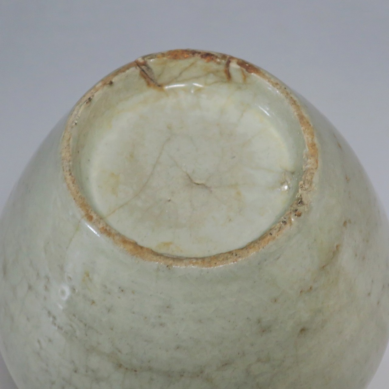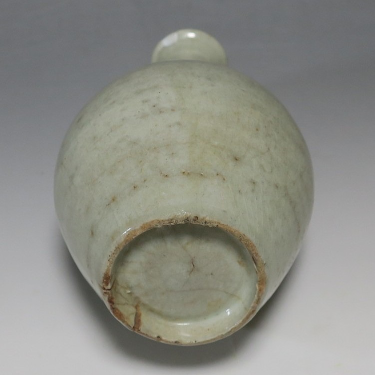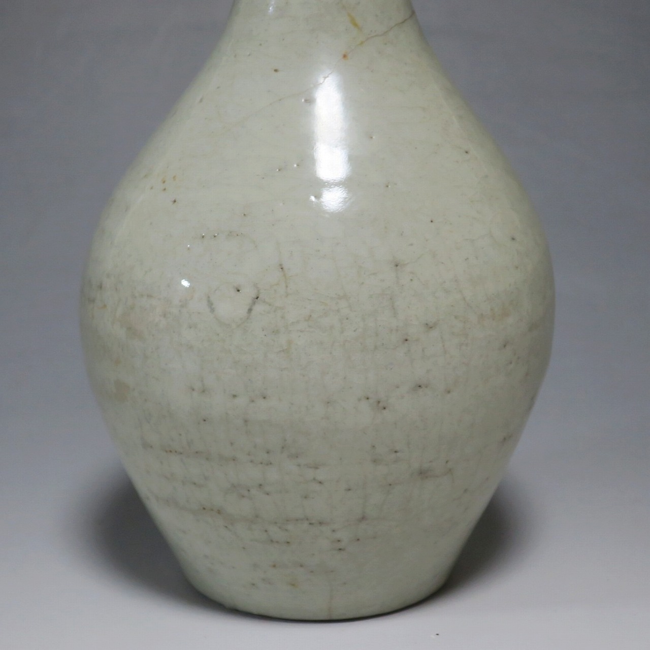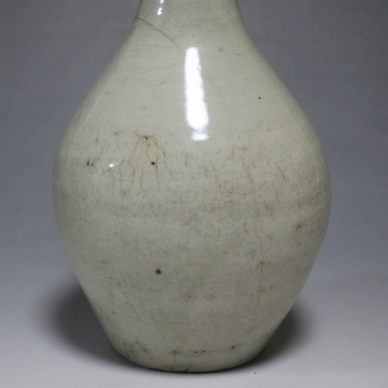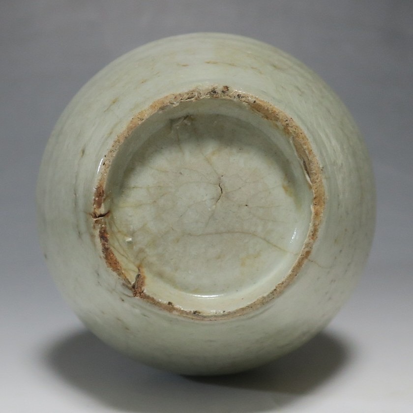 高さ 約17.4cm/胴径 約10cm 経年の汚れがつき、口辺に約1cmと8mmの銀直し、高台に窯傷、所々カンニュウがあります。状態は写真でご確認ください。 砥部焼は、1750年頃に愛媛県伊予郡砥部町に開かれた窯です。18世紀後半に磁器焼成に成功、1818年に良質の陶石(川登石)を発見した後、作品の質が向上し、有田と並ぶ一大磁器生産地となりました。本品は18世紀後半に北川毛窯で製作された白磁の徳利。高台を見ると鉄分の多い赤土が使われているので本品が北川毛窯産であることがわかります。お預け徳利サイズの清楚な作品。酒器の他、インテリア、花器としてお楽しみください。 | ||